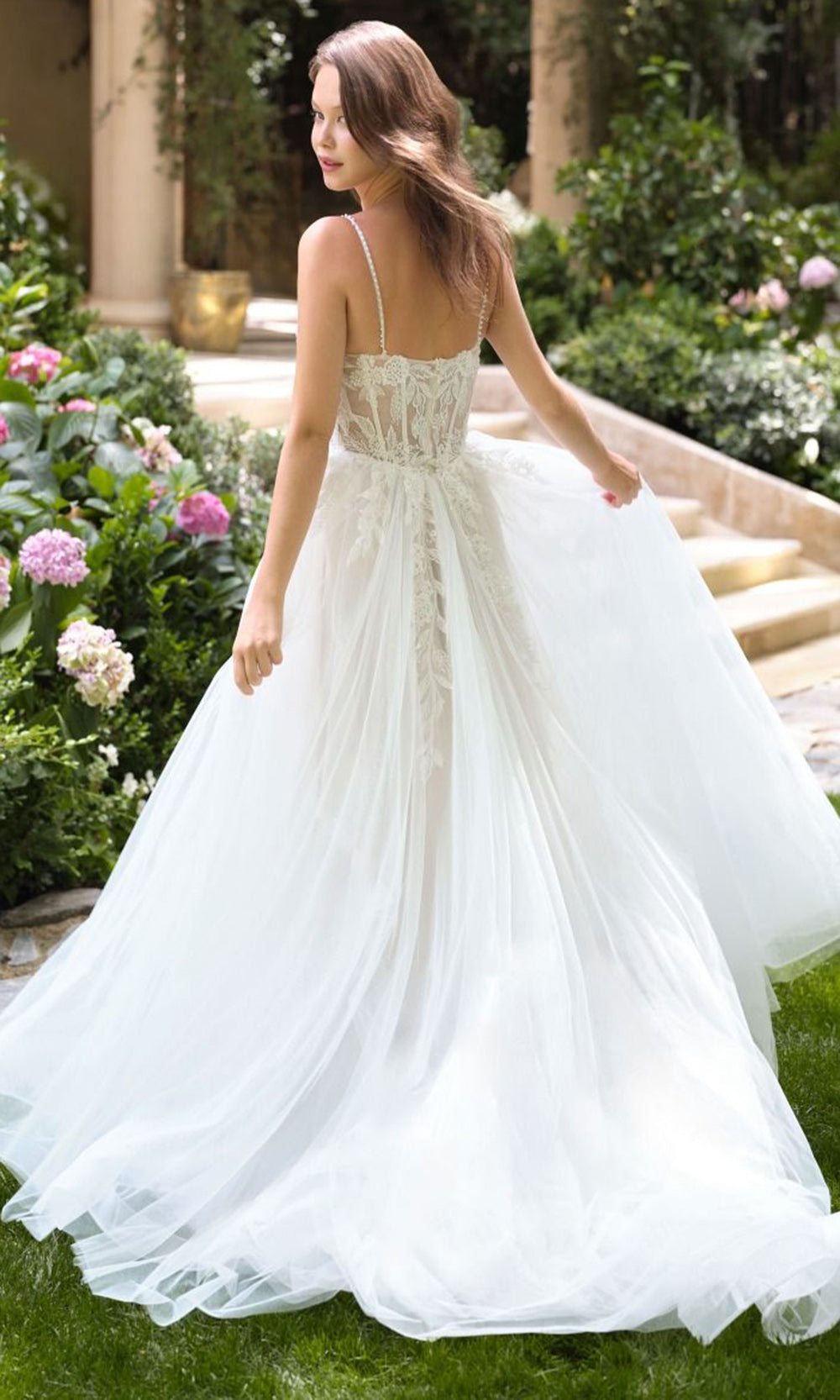 Romantic charm radiates through the Andrea and Leo WL087, a gown that blends graceful artistry with timeless allure. The beaded spaghetti straps frame a deep v-neckline, while the sheer bodice is adorned with floral lace applique that highlights intricate craftsmanship. Its Basque waistline flows seamlessly into a layered tulle skirt, creating movement that feels ethereal and light. The A line silhouette balances elegance with comfort, offering a shape that flatters from every angle. For brides seeking an unforgettable presence, the Andrea and Leo WL087 combines detail, romance, and sophistication in one captivating gown. Model is wearing Off White color.