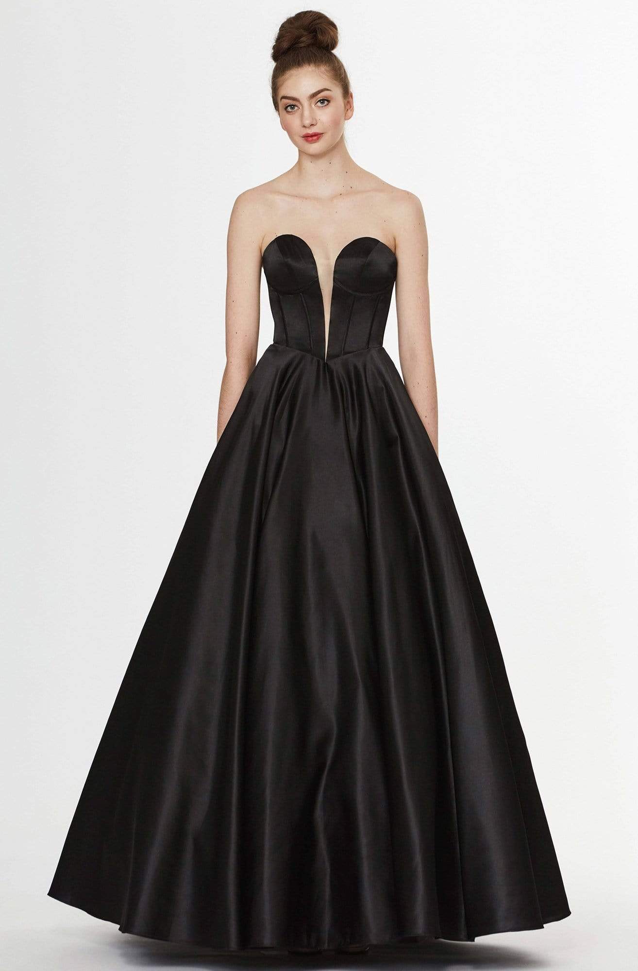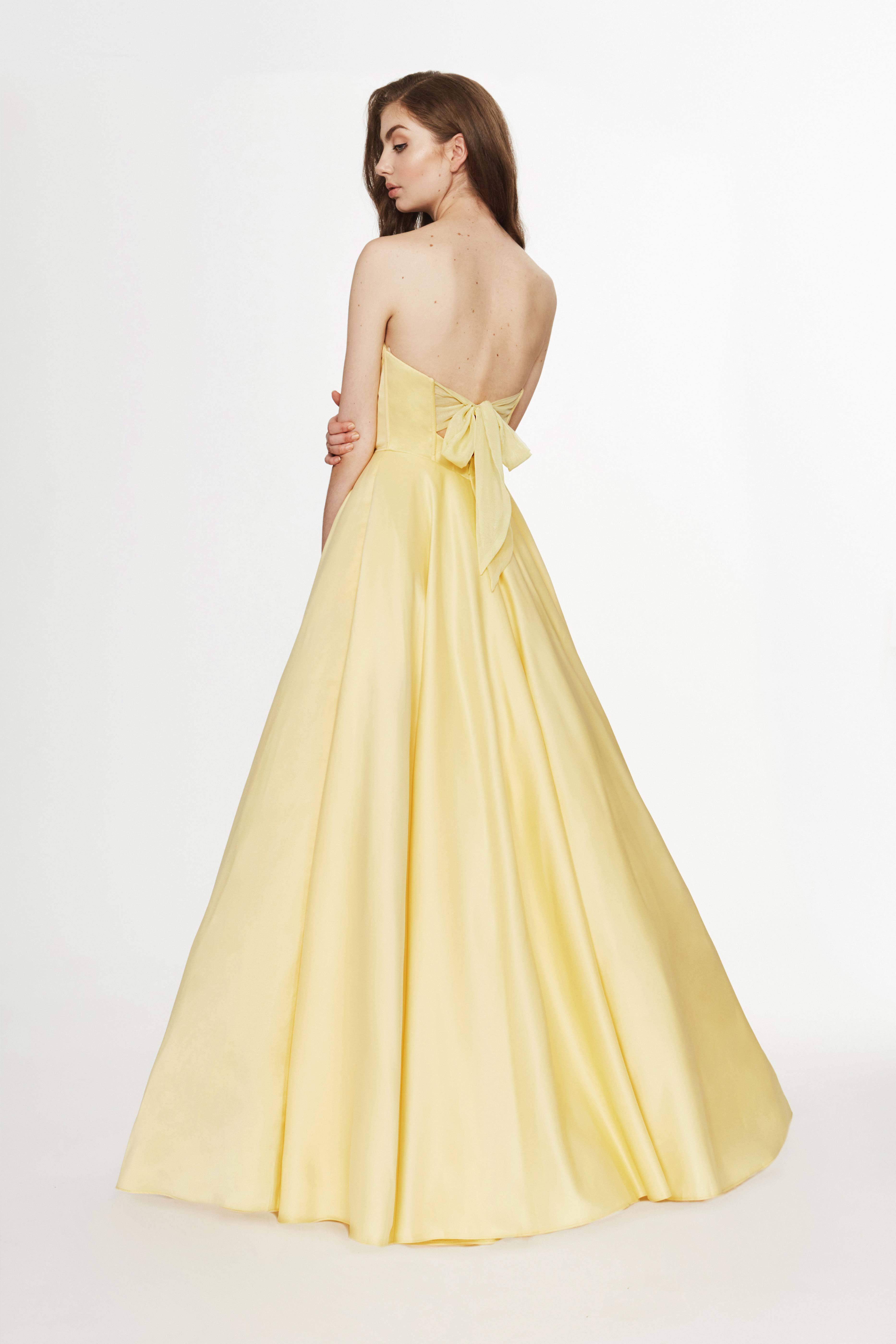 | Details: | Strapless, Plunging neckline, Sheer inset, Corset bodice, A-line skirt, Pockets, Bow ties at the back |