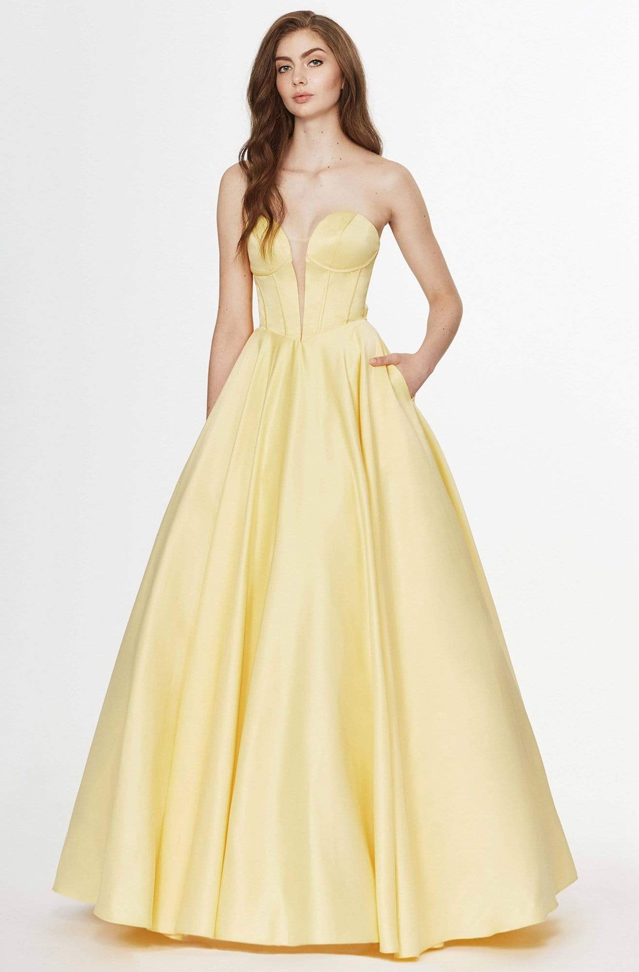 Enter the hall with grace and beauty in Angela & Alison 91071. Features a strapless, deep sweetheart neckline. This soft satin dress has a corset bodice styled with bow ties at the back. From the basque begins a full length A-line skirt with pockets. Charm everyone from all angles as you shine all night long in this Angela & Alison masterpiece.