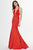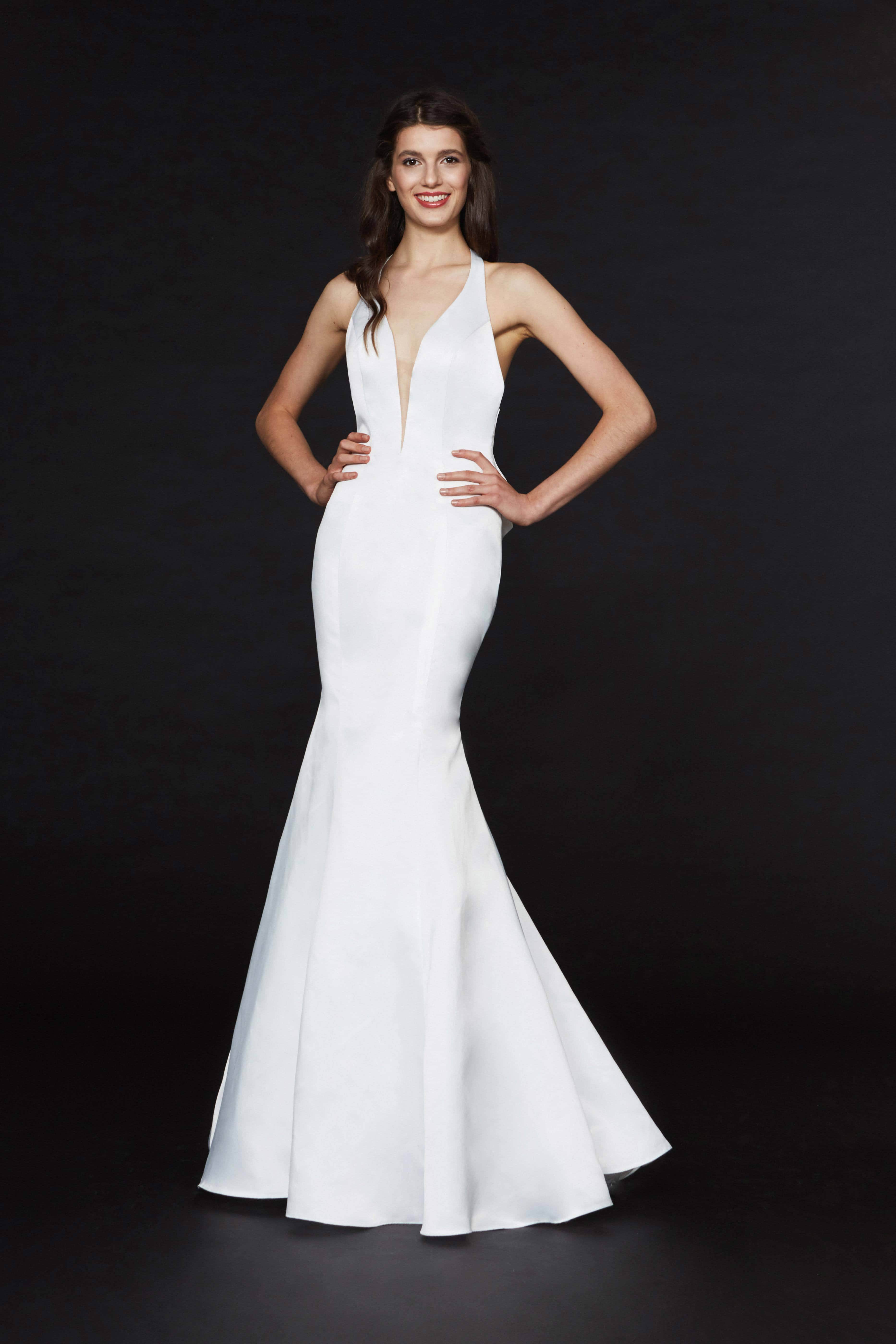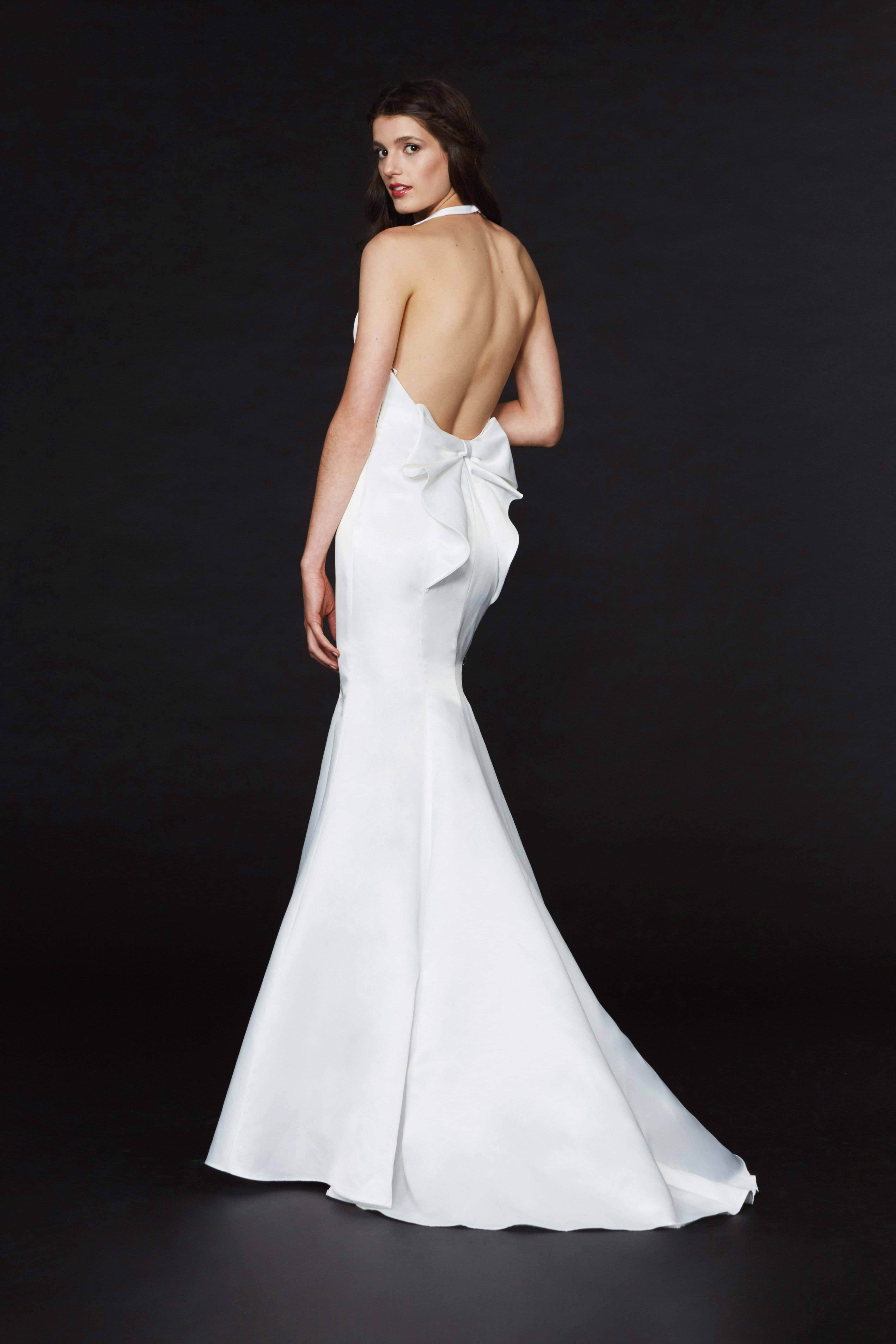 | Details: | Sleeveless, Plunging neckline, Sheer inset, Open back, Fitted bodice, Mermaid skirt, Bow accent, Sweep train |