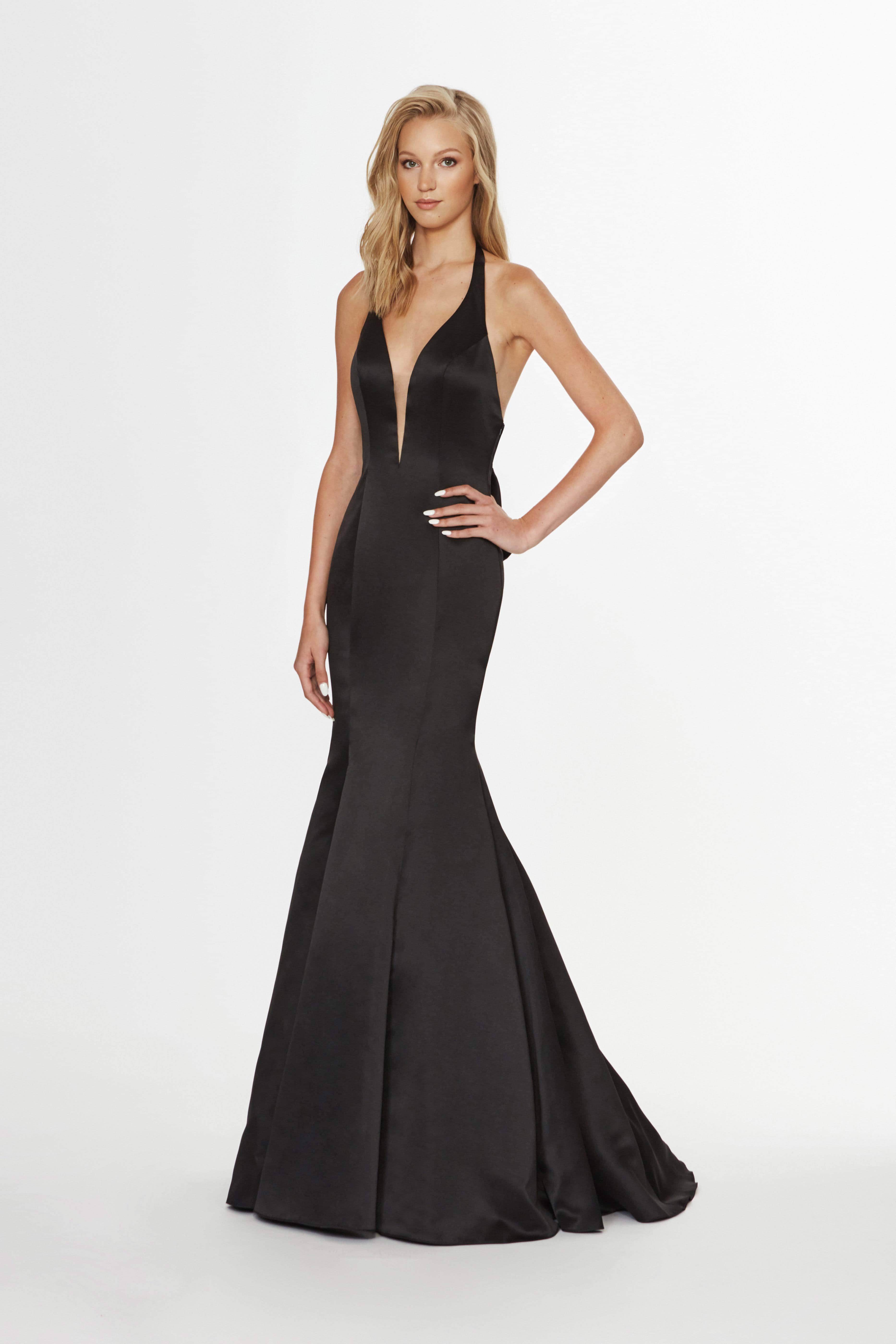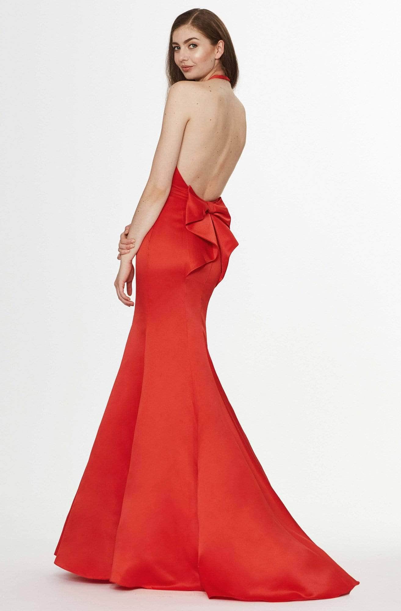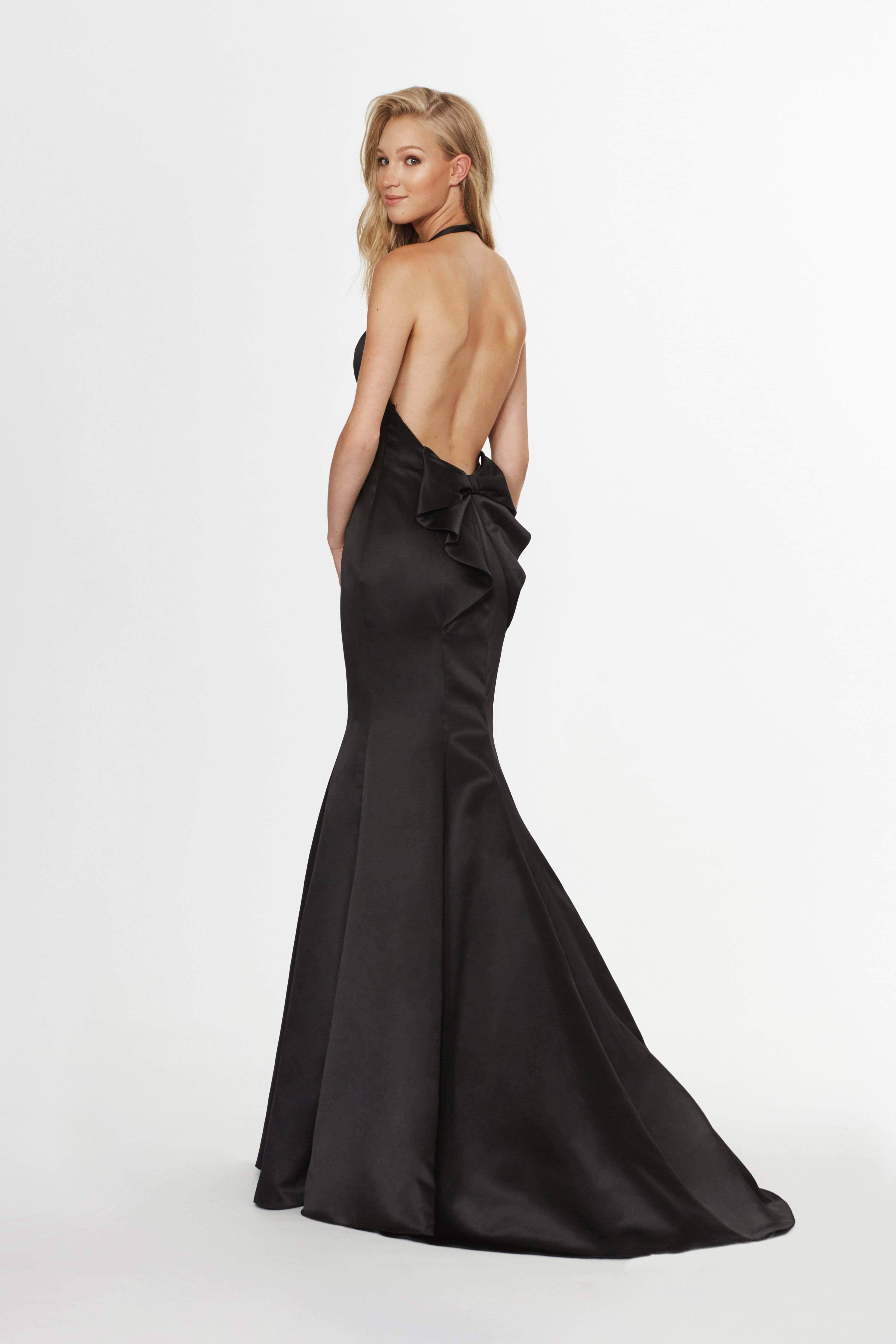 Step into the spotlight with allure and elegance in this Angela & Alison 91089 masterpiece. This satin gown exudes charm with its sleeveless, plunging halter V-neckline and captivating open-back design. The fitted bodice is adorned with a charming bow accent at the back, adding a touch of sophistication. The full-length mermaid silhouette of the skirt gracefully flows into a sweep train, ensuring you make a lasting impression in this stunning Angela & Alison 91089 creation.