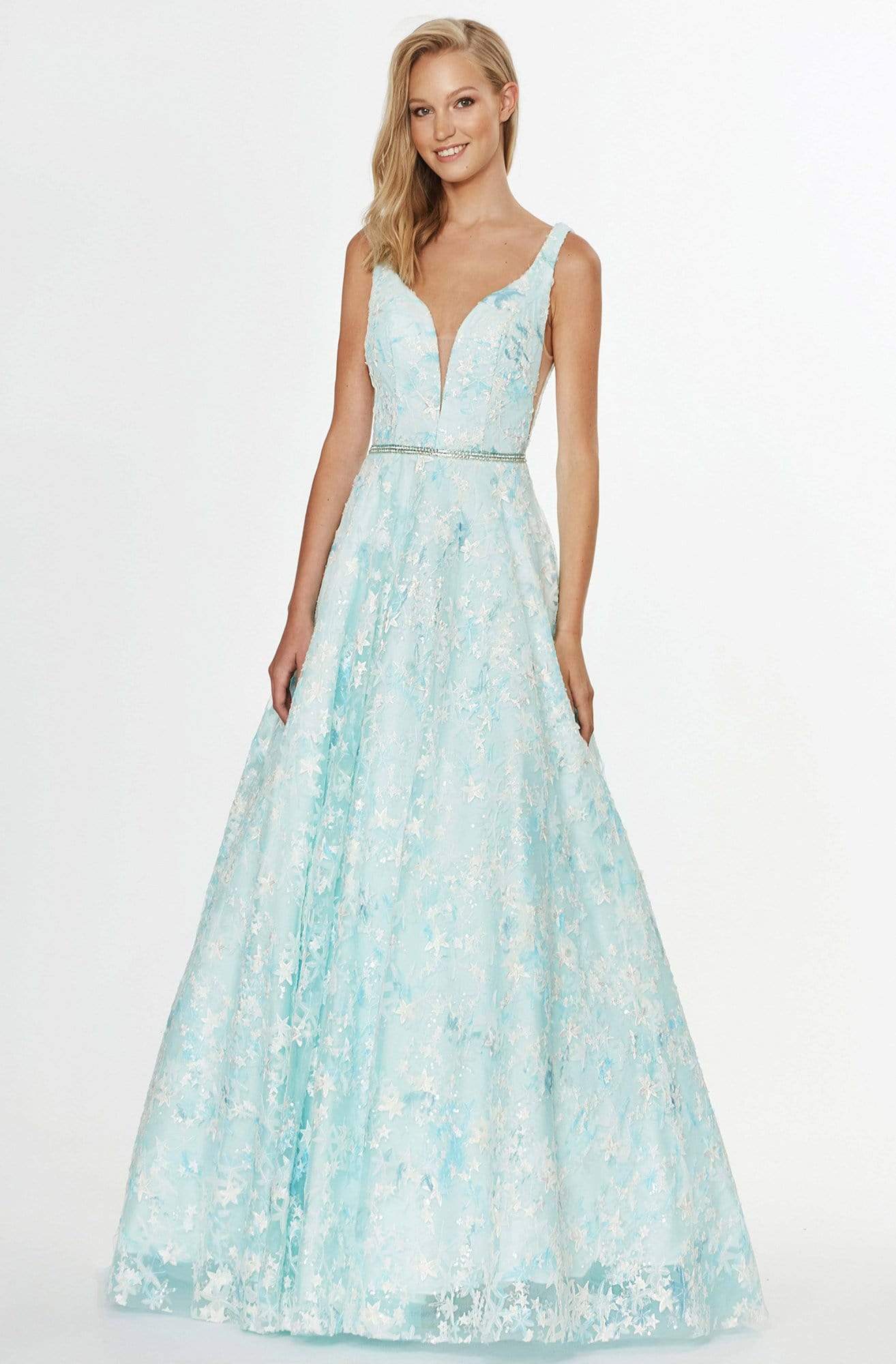 Look lovely in this timeless dress by Angela & Alison 91091. This star tulle dress presents in a sleeveless, plunging V-neckline with sheer panel. The bodice is supported with thin straps and flaunts a low V-back. The back has a zipper closure and the A-line skirt finishes the look in a sweep train. This posh party gown by Angela & Alison puts you in the spotlight.