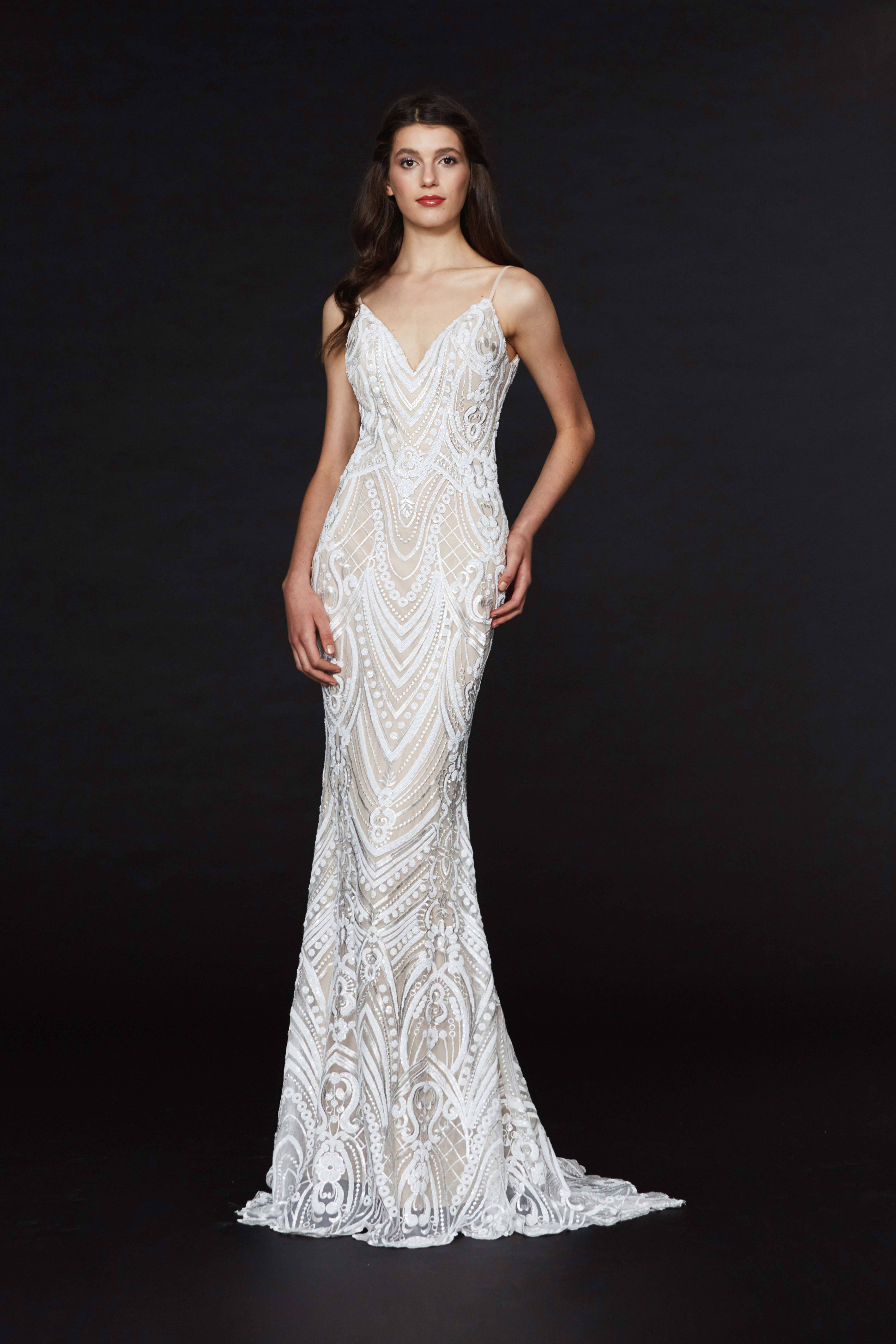 | Details: | Sleeveless, Spaghetti straps, Plunging neckline, Fitted bodice, Trumpet skirt, Low scoop back, Back zipper, Sweep train |