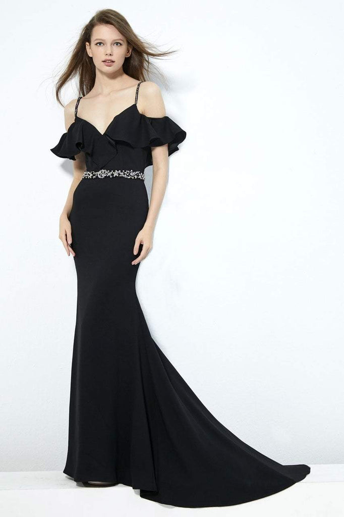 Indulge in the love of the stylish and the upscale in this enchanting Angela and Alison 81003 creation. Perfectly highlighted with a softly pleated ruffle embracing the off-shoulder neckline, this charming piece shows off a deep v-shaped notch with slender beaded straps and a v-cut mid-open back. Intricately beaded with jewels that flourishes into a swirling design, the mermaid skirt sculpts spectacularly down just above the knees before flaring spectacularly down to a cascade of a sweeping train. Express a signature style that is utterly mesmerizing in this Angela and Alison masterpiece.