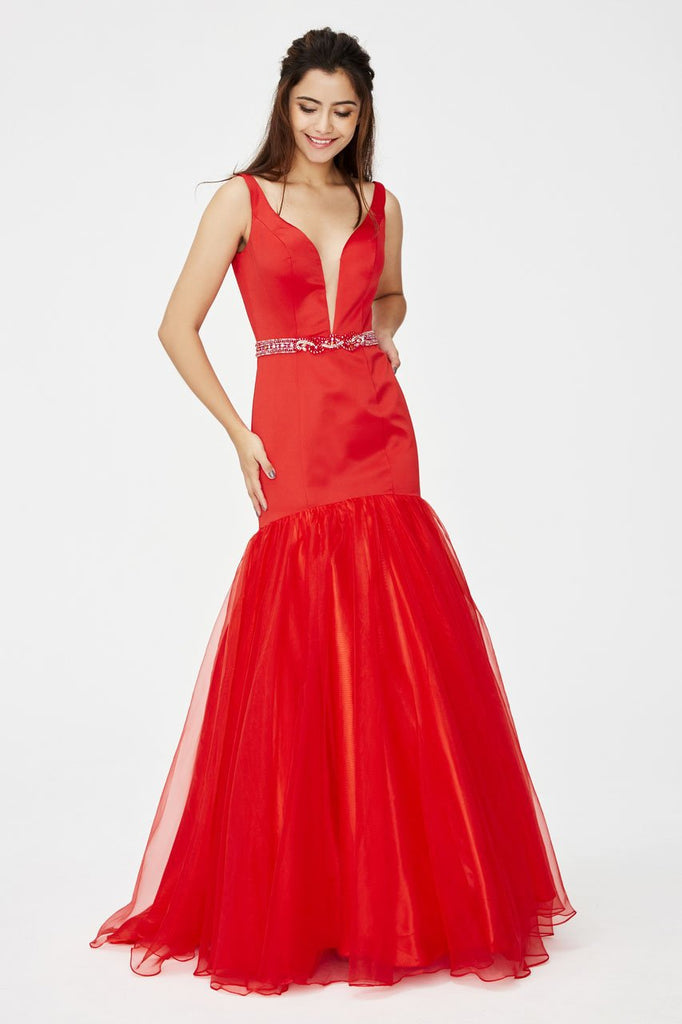 | Details: | Sleeveless, Seams, Illusion Inset, Plunging Scoop Open Back, Back Zipper Closure, Beaded Waistband, Tulle Overlay, Court Train |