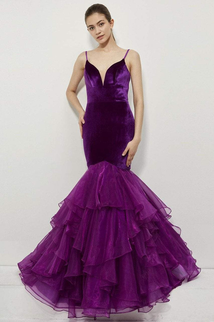 Be a vamp in an alluring dress from Angela & Alison 81091. The dress has a plunging V-neckline with sheer inset at mid-bust. This sleeveless dress has thin straps and flaunts a square back and a center back zipper. The fitted bodice forms a full length tiered mermaid skirt. Show your sophisticated sense of style in this Angela & Alison design.