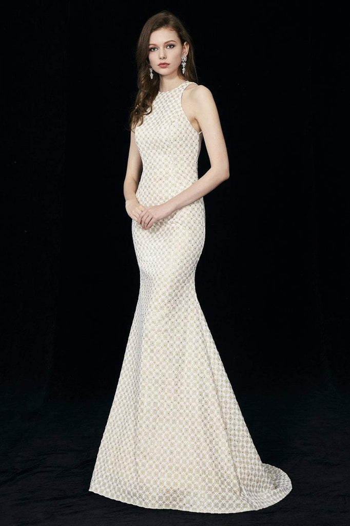 You are sure to make an entrance in this elegant dress from Angela & Alison 81110. Brandishes in a sleeveless, halter neckline with bodice embellished with subtle metallic hues that accentuate the soft fit and flare silhouette of this gown. The back is styled with sheer panels and shows an open back. The dress has a zipper closure while the full length skirt has a trumpet silhouette and finishes in a sweep train. This Angela & Alison design is an easy choice for Prom, Pageant and Evening Gown.