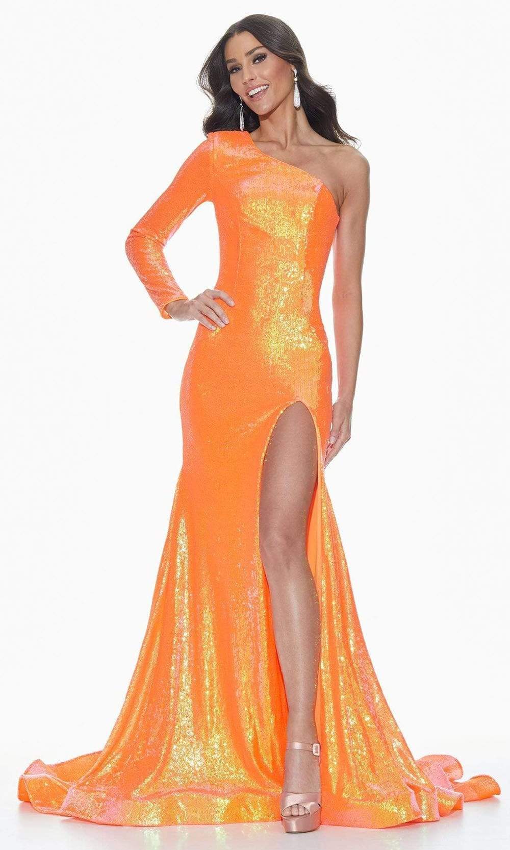 Look like a luminous beauty in this vibrantly made Ashley Lauren 11026 creation. Festooned with an allover sequined design, this gown features an asymmetrical neckline with a long sleeve. The back has an open design with a zippered closure. The trumpet skirt bears as high slit as it flares into a sumptuous train. Dazzle everyone by the sleek style of this Ashley Lauren masterpiece.