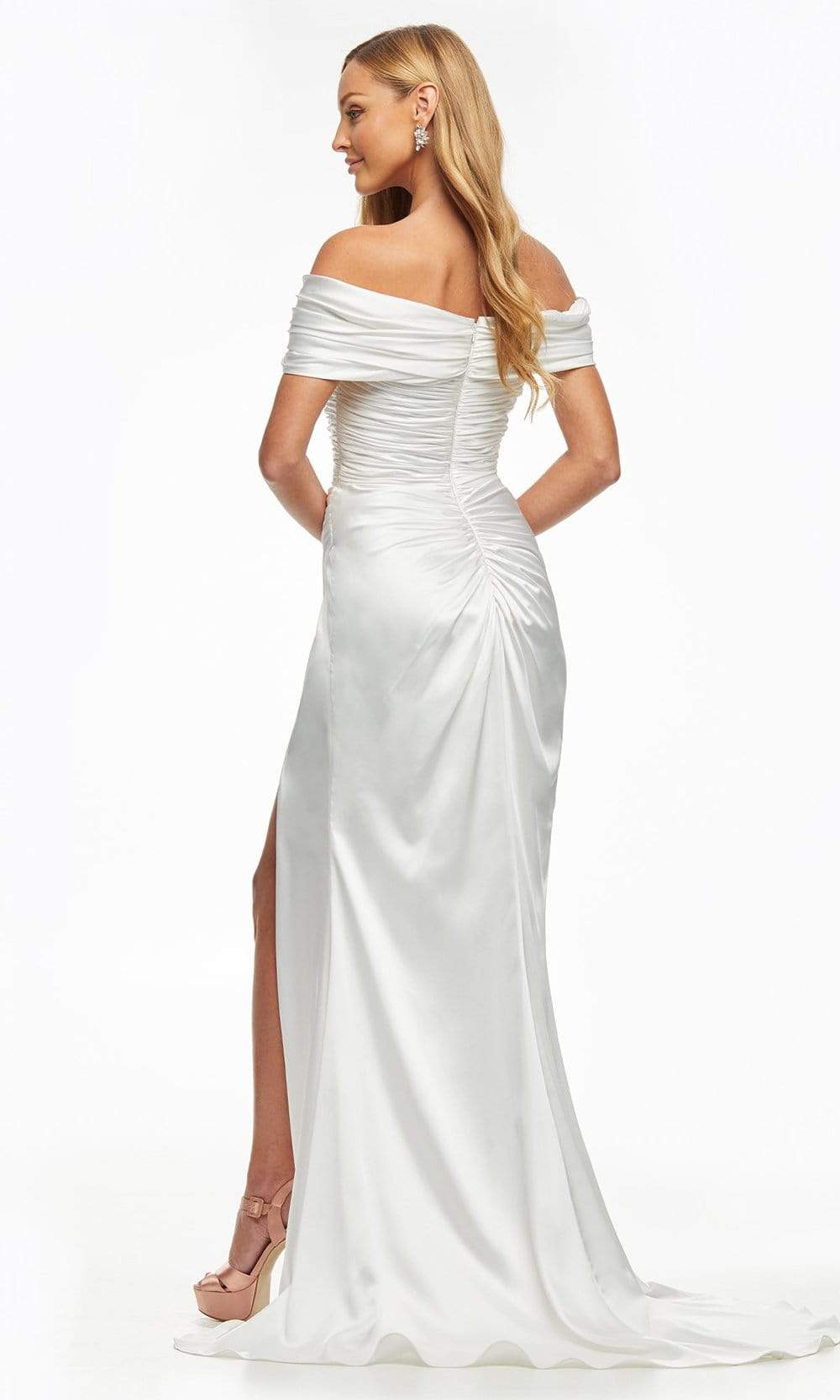 Bring a breathtaking new look to prom night in this stunning Ashley Lauren 11093 dress. This evening dress fashions an off shoulder neckline in a fitted and ruched bodice with slit on the skirt. Revealing a sheath silhouette, this also shows a mid-open back with back zipper closure. Look sophisticated and mature in this simple yet chic Ashley Lauren creation.