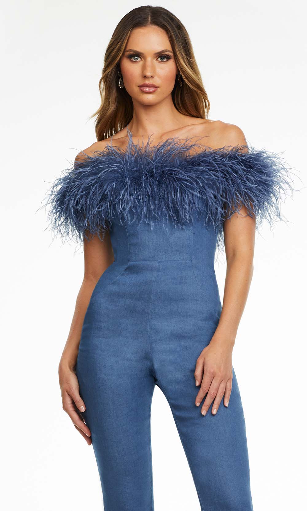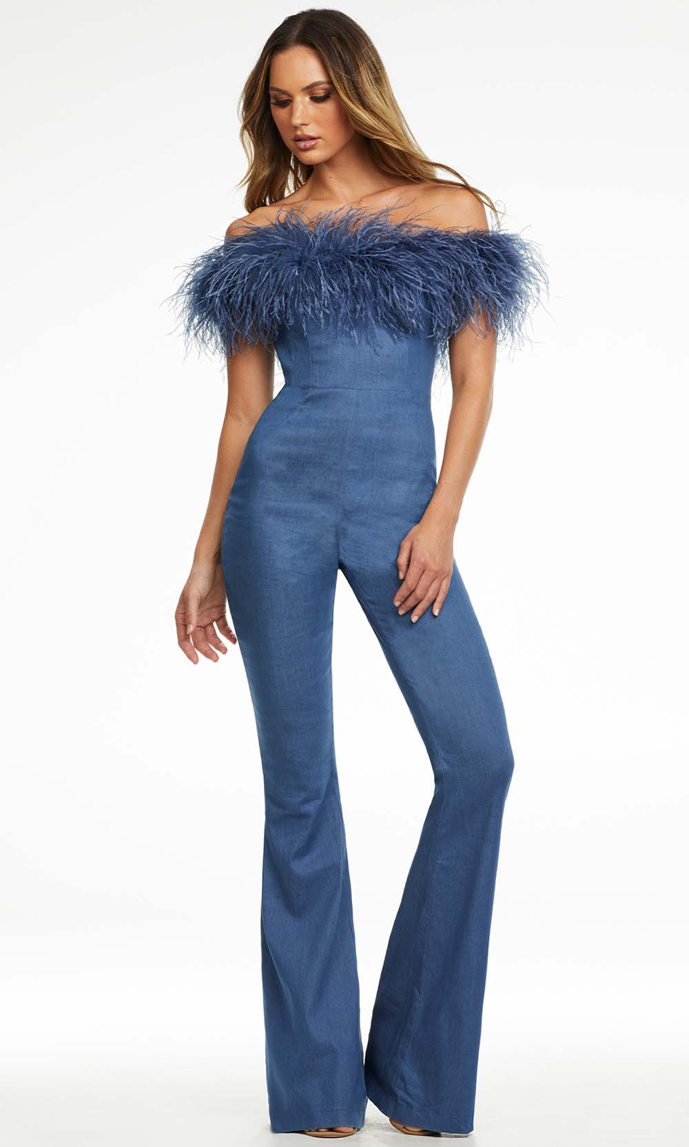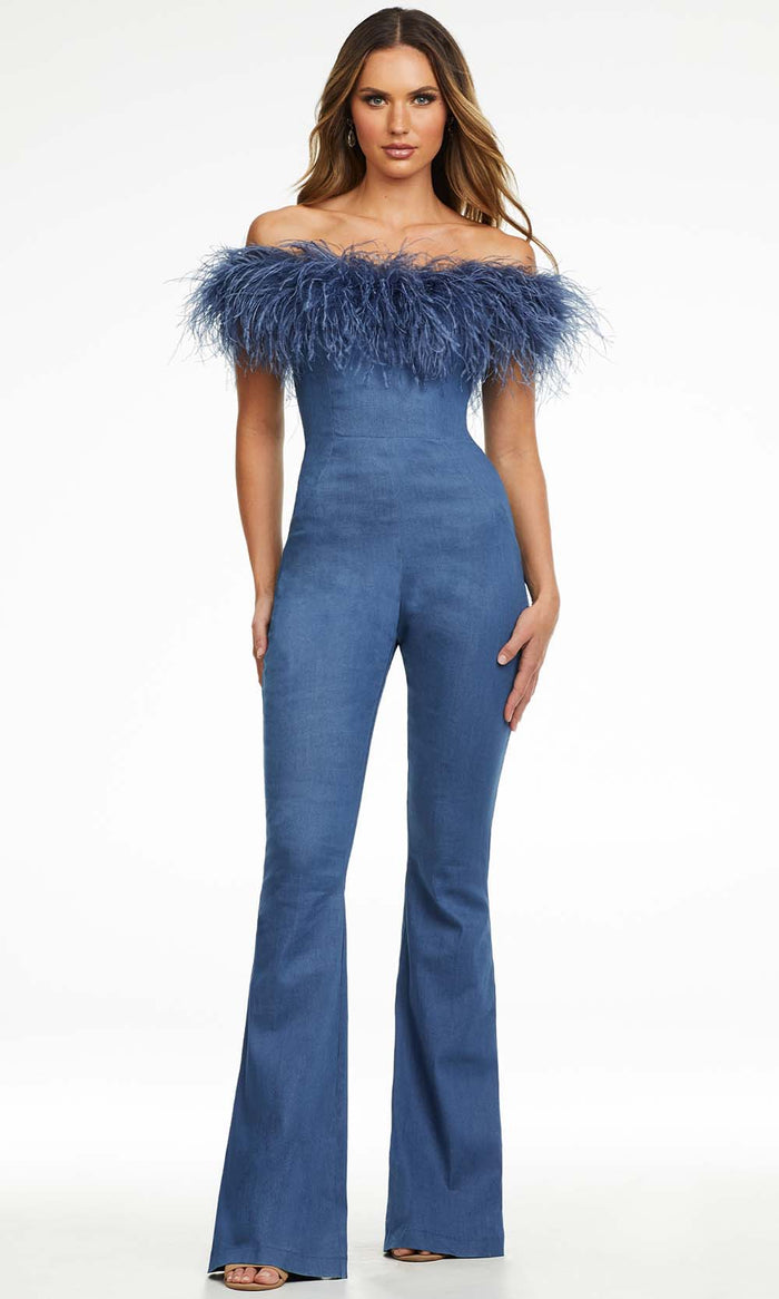 Impress the crowd with your charm as you wear this lovely creation from Ashley Lauren 11123. Showcases stretch denim fitted gown framed with an off shoulder feather neckline and mid-open back. The full-length jumpsuit begins at the high waist and tapers to full length hemline. This Ashley Lauren jumpsuit will definitely make a statement in every occasion. Ashley Lauren is one of the most popular brands to look for this year offering endless options in special occasion dresses.