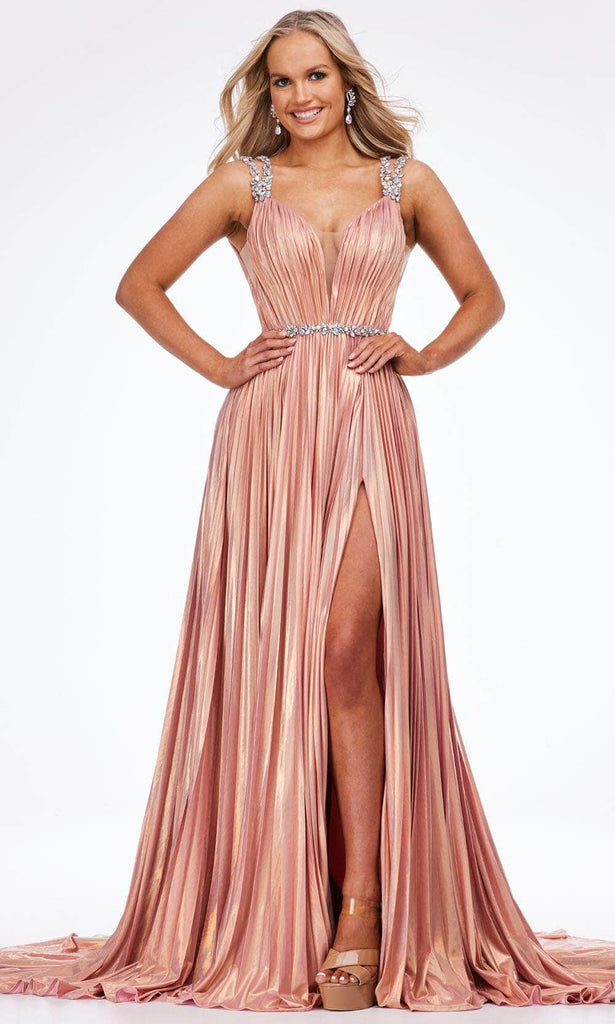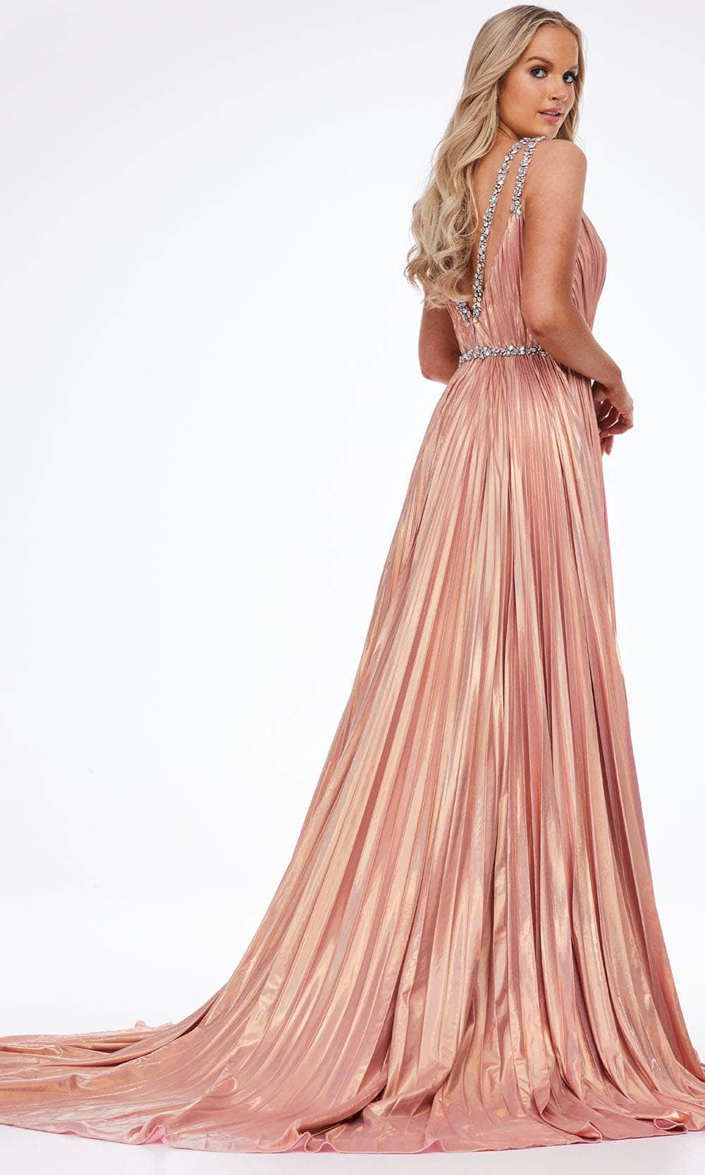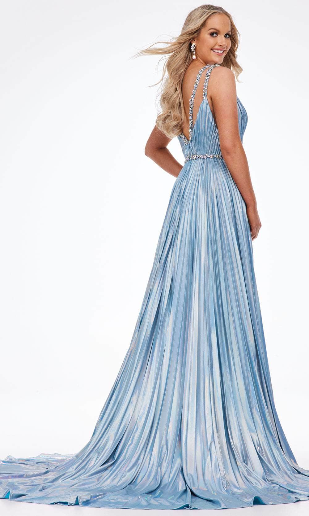 Enhance your visual appeal in this luxurious evening repertoire by Ashley Lauren 11147. The straps and waistline of this gown with a Grecian-inspired silhouette are adorned with crystals, and it has a plunging v-neckline and a sleeveless bodice. The A-line skirt fashions with accordion pleats and adds allure with its thigh high leg slit. A sweep train brings the design to a dramatic flair. Flatter your finest assets as you enthrall the crowd in this Ashley Lauren masterpiece. Model is wearing Pink, and Sky colors.