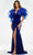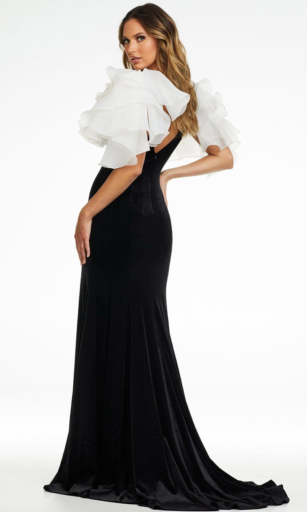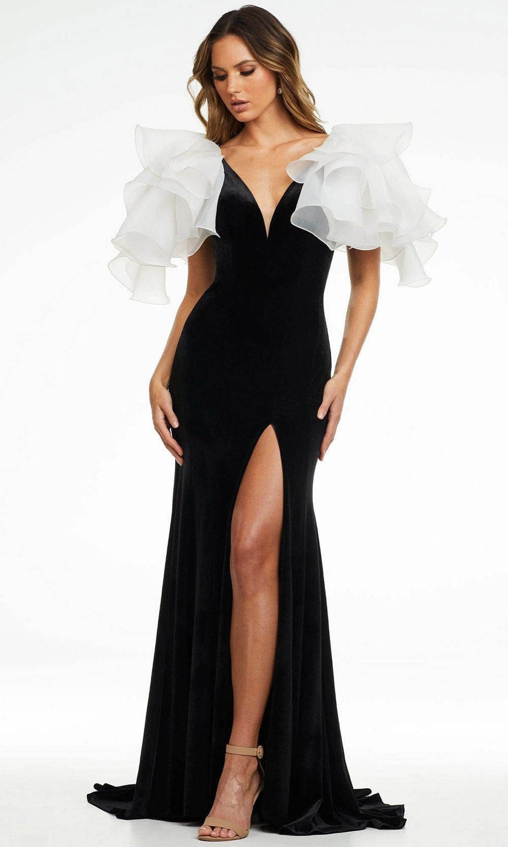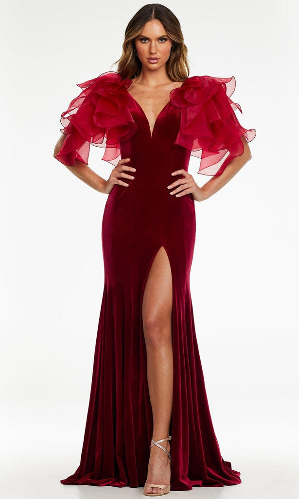 Make a memorable splash at your upscale evening in this lux formal gown by Ashley Lauren 11172. The fitted gown fashions a deep V neckline and elbow sleeves with ruffled details. This also displays a low V-open back secured with back zipper while the skirt reveals a front high slit and contour seaming. This full length trumpet silhouette finished off with a sweep train. Take your seat on the throne in a queenly creation from Ashley Lauren. Ashley Lauren is one of the most popular brands to look for this year offering endless options in special occasion dresses.