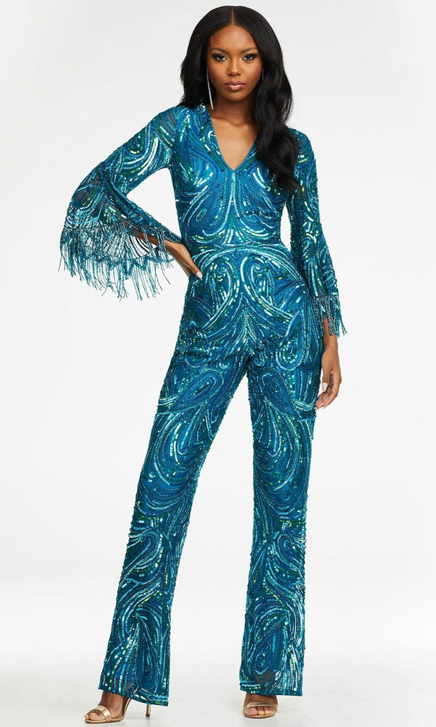 Flaunt your best assets in a scintillating creation from Ashley Lauren 11181. Intricately embellished with sequins and beads all over its silhouette, this full length jumpsuit showcases a V neckline and long bell sleeves trimmed with fringe. A center zipper closure secured the full back. This Ashley Lauren jumpsuit is specially designed to make that special occasion worth reminiscing. Ashley Lauren is one of the most popular brands to look for this year offering endless options in special occasion dresses.