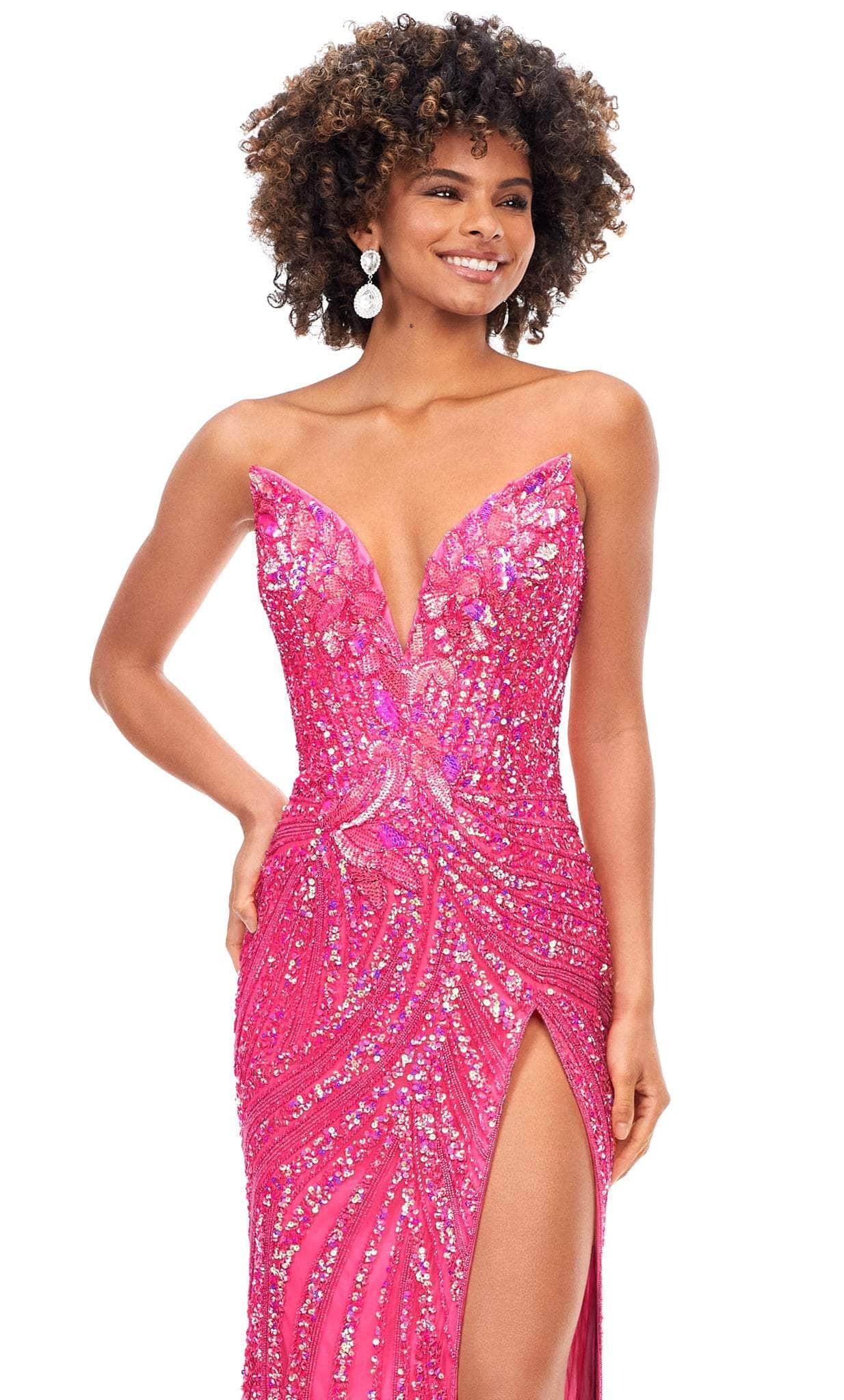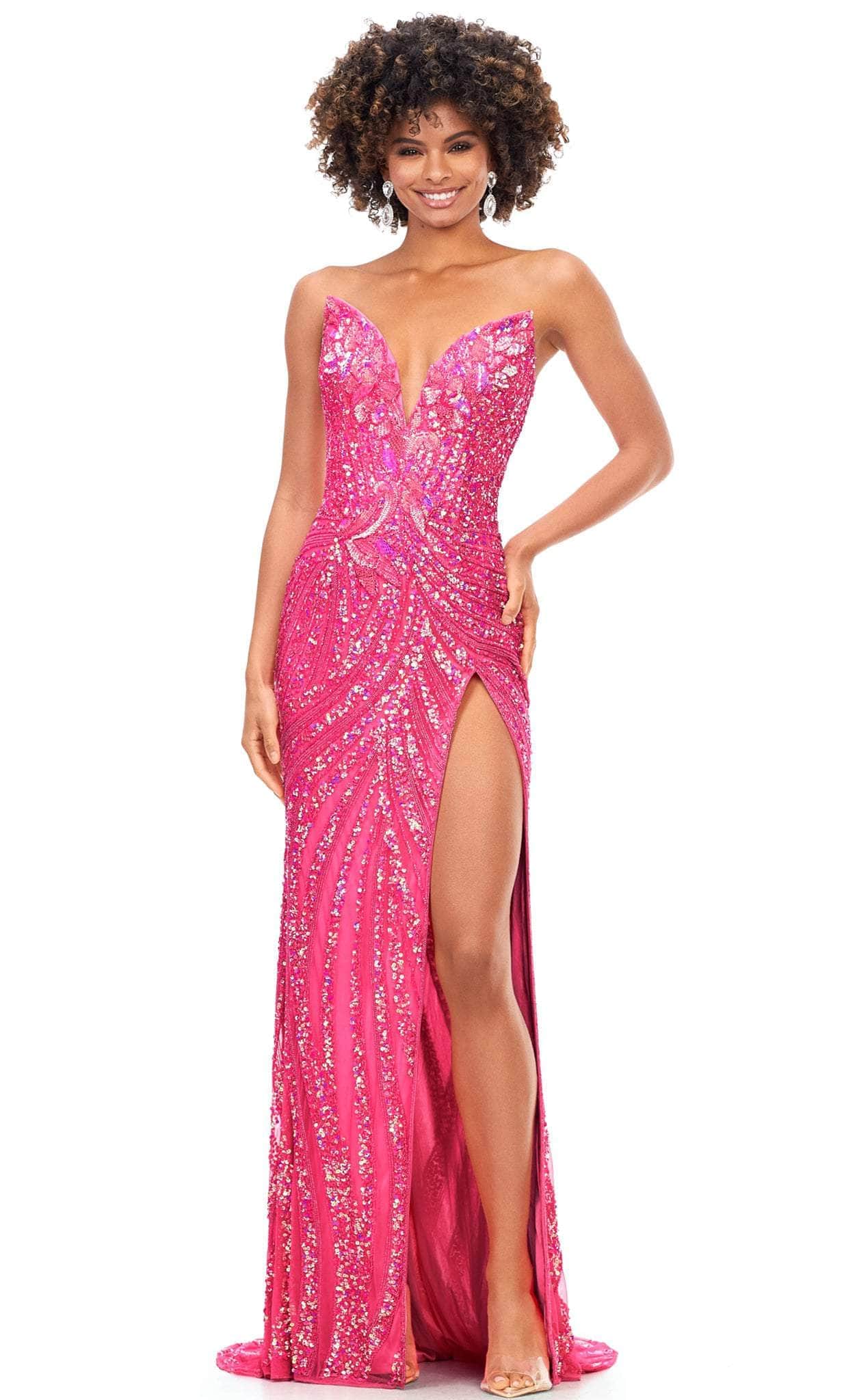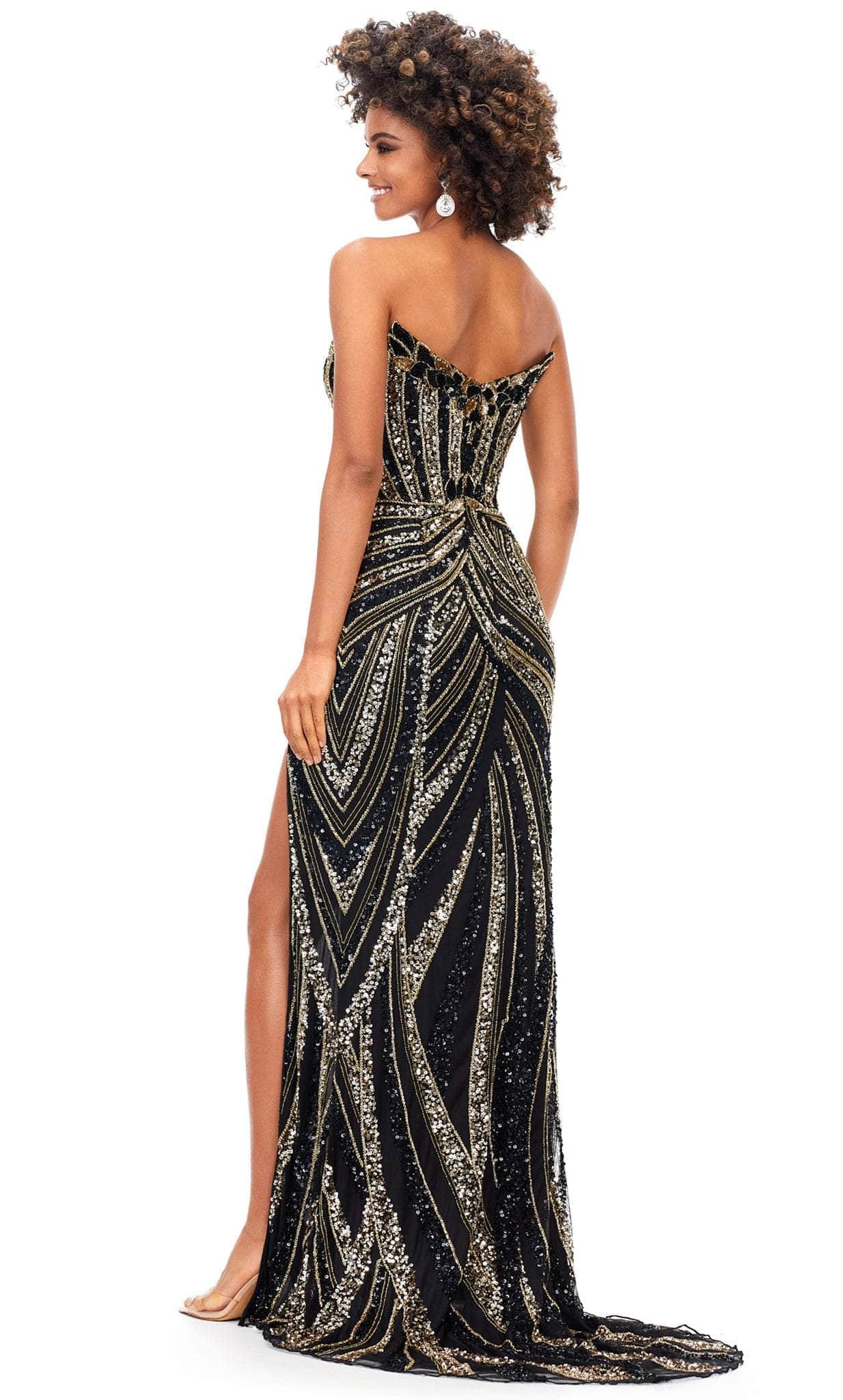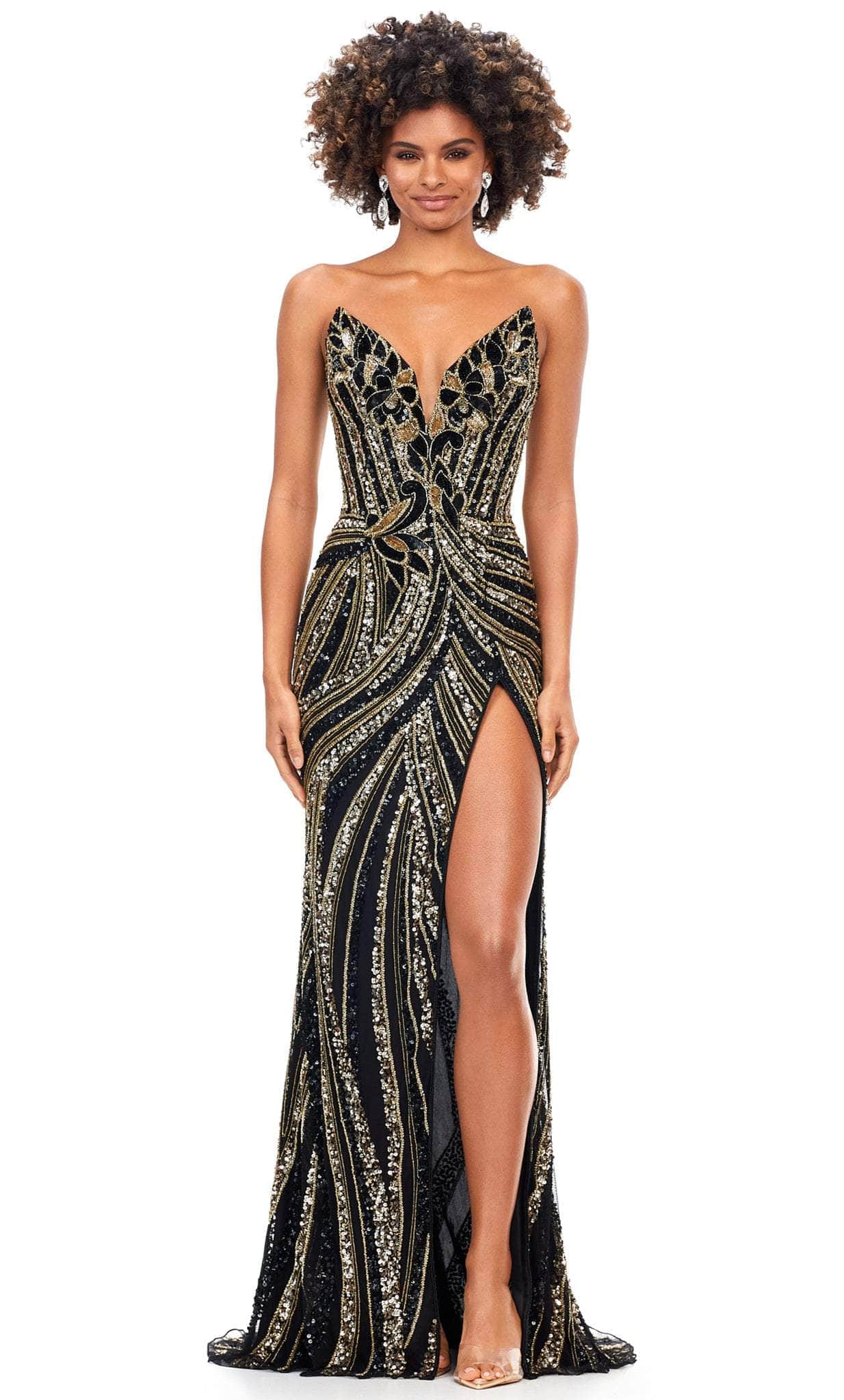 Radiate class and poise in this timeless Ashley Lauren 11236 masterpiece. With its contrasting beading and sequin adornment, this strapless gown sparkles beautifully. It includes a matching deep v-neckline and mid-open v-back. Opening a seductive thigh-high slit on the left side, the skirt carves a sheath silhouette that cascades to the floor sweeping train. This Ashley Lauren 11236 gown is an instant refresh for your eveningwear repertoire. Models are wearing the Blue/Jade, Bright Pink, Fuchsia, Fuchsia/Black, Gold, Gold/Black, Gold/Ivory, Purple, Red, Rose Gold, and Sky/Nude colors.