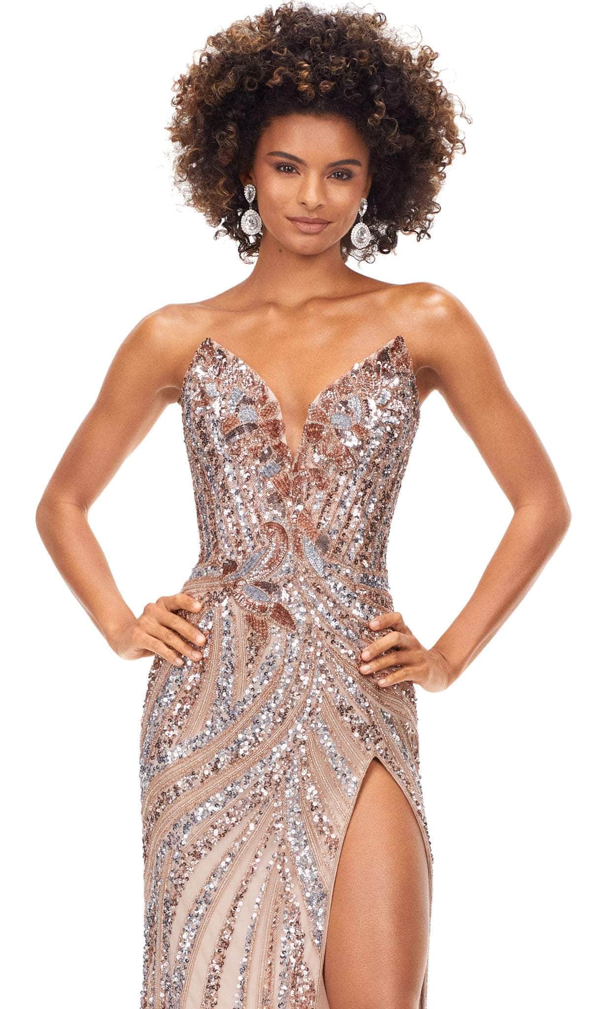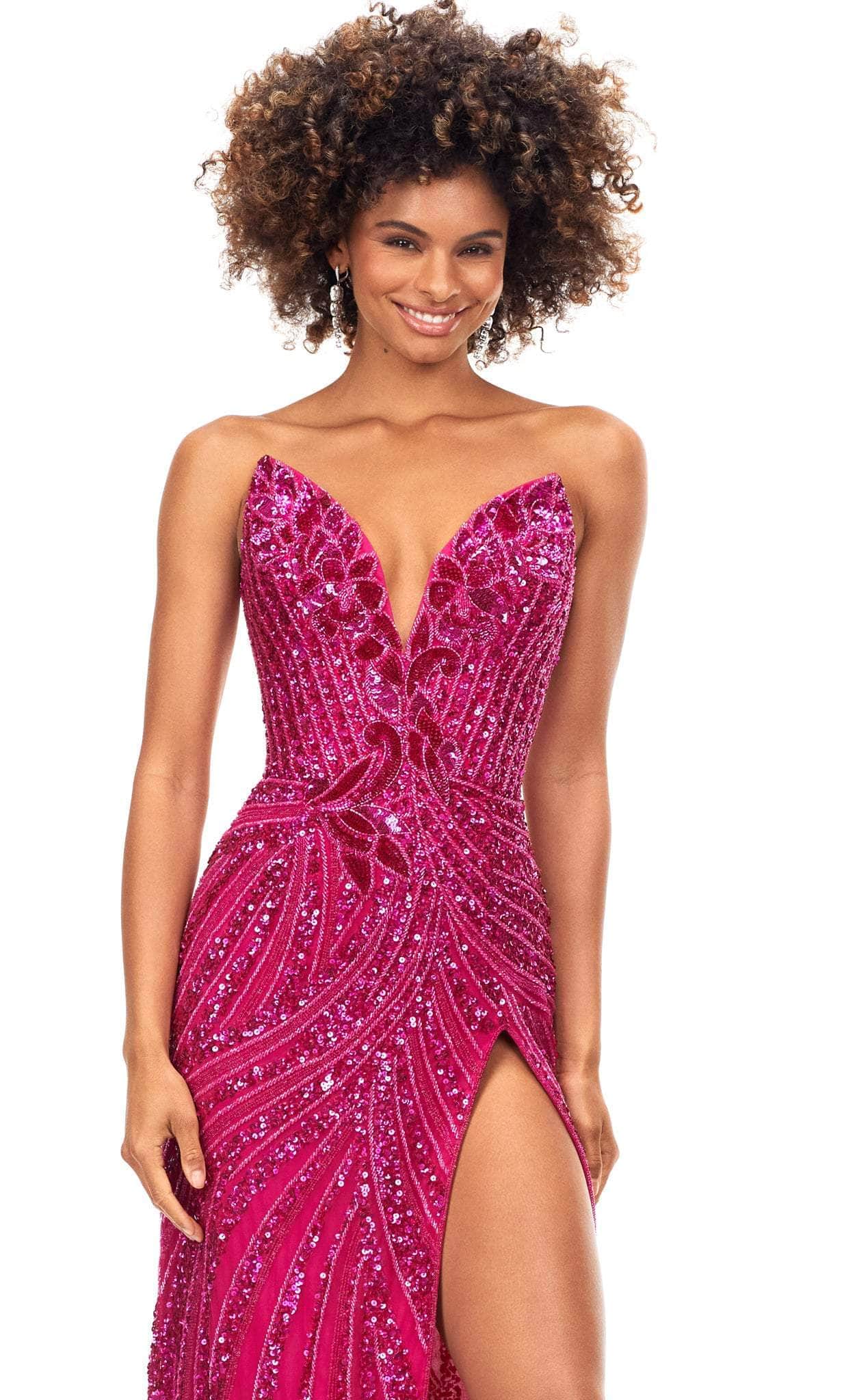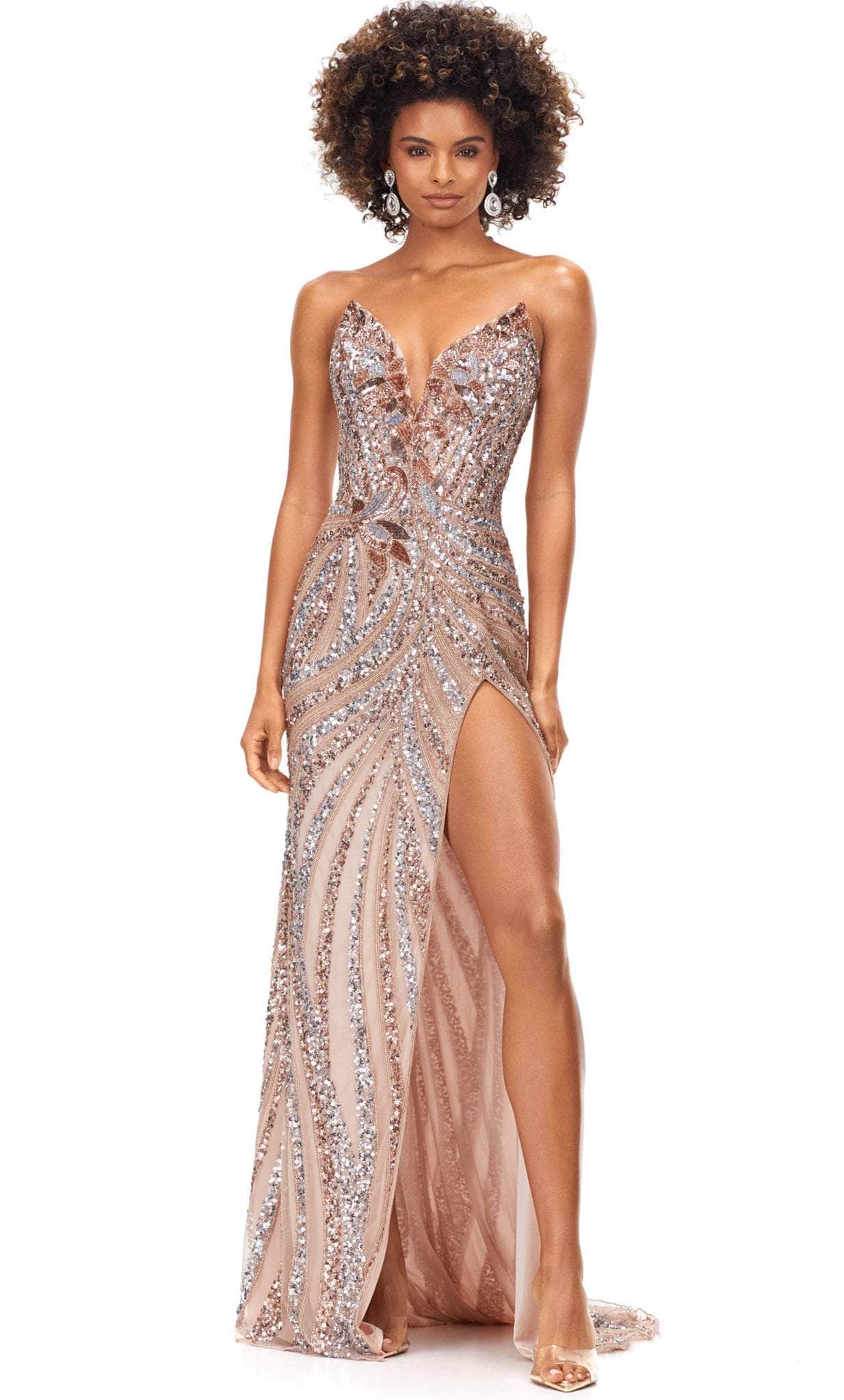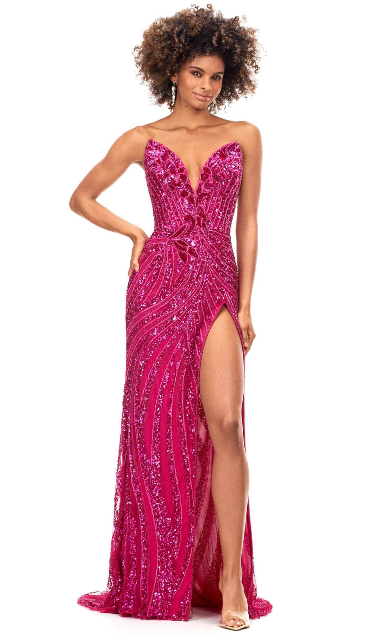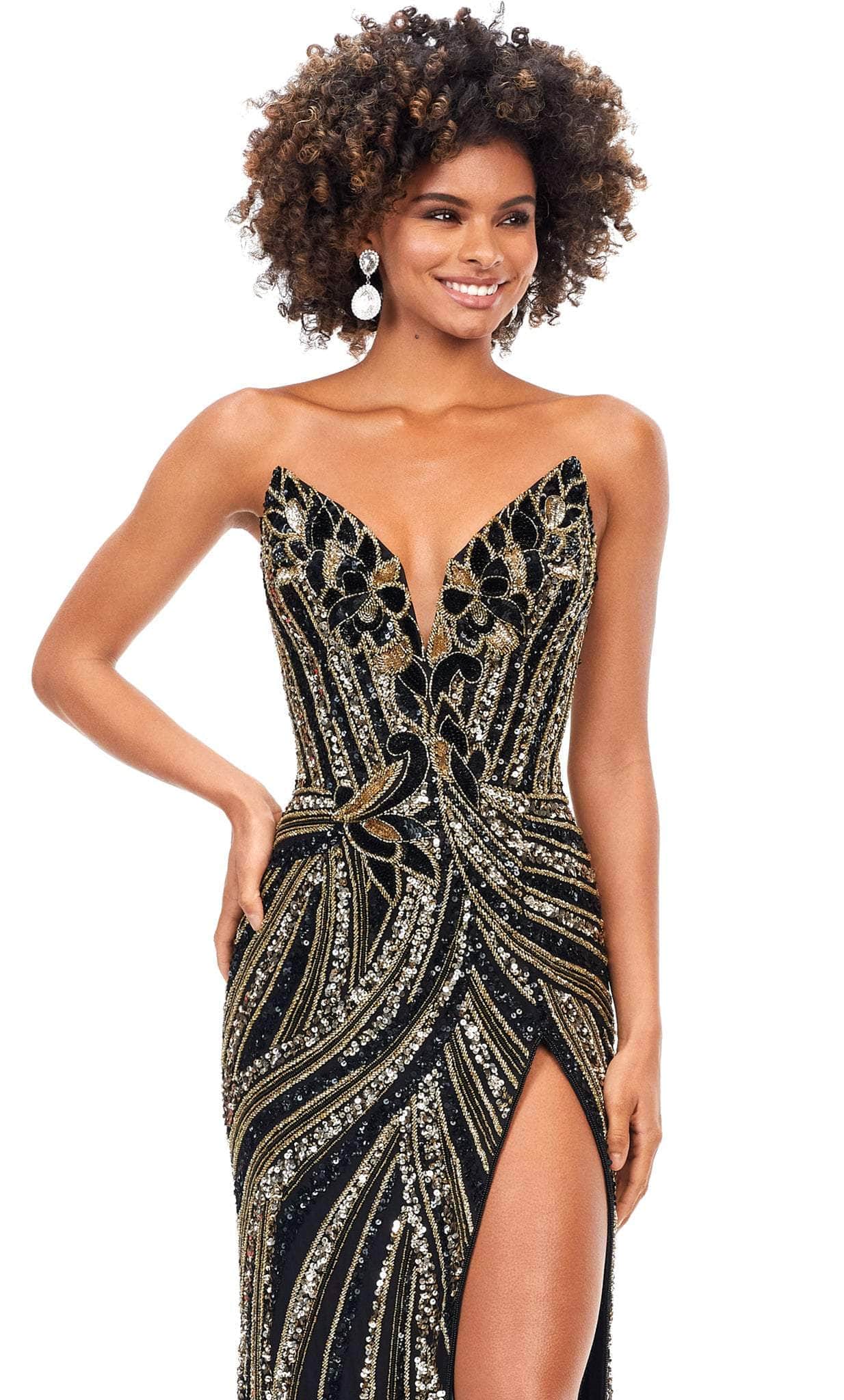 Radiate class and poise in this timeless Ashley Lauren 11236 masterpiece. With its contrasting beading and sequin adornment, this strapless gown sparkles beautifully. It includes a matching deep v-neckline and mid-open v-back. Opening a seductive thigh-high slit on the left side, the skirt carves a sheath silhouette that cascades to the floor sweeping train. This Ashley Lauren 11236 gown is an instant refresh for your eveningwear repertoire. Models are wearing the Blue/Jade, Bright Pink, Fuchsia, Fuchsia/Black, Gold, Gold/Black, Gold/Ivory, Purple, Red, Rose Gold, and Sky/Nude colors.