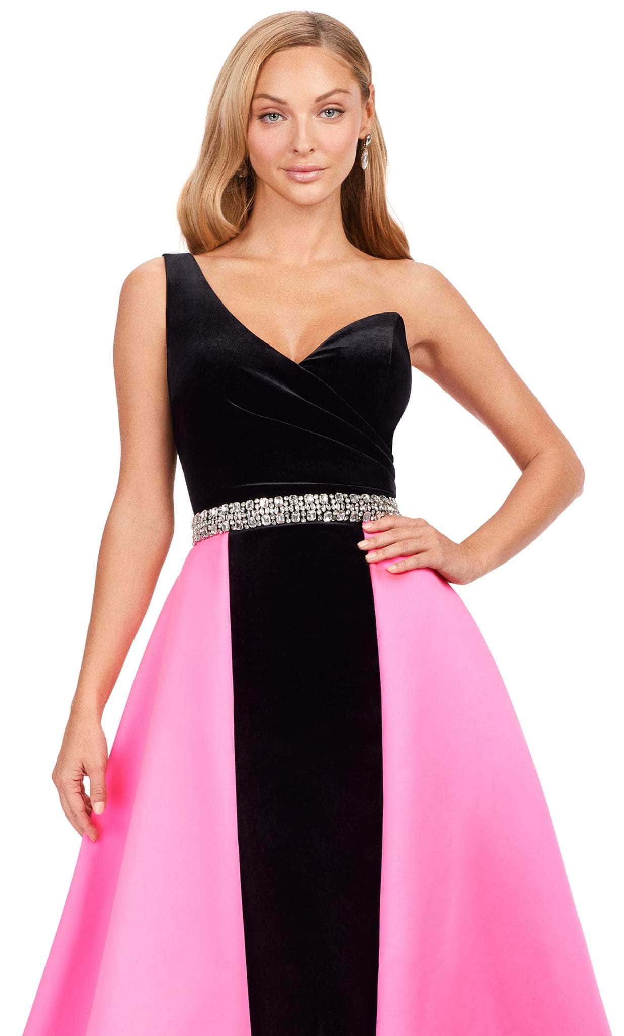 Indulge in timeless sophistication with this gorgeous one-shoulder A-line dress from Ashley Lauren 11265. Crafted from luxurious velvet material, it features a dainty one-shoulder strap and a waistband that enhances your curves. The satin-infused skirt is voluminous and flows gracefully with your every step, while the full-length hem and sweep train bring an air of grandeur. Commence a new chapter of your journey to forever in this fascinating Ashley Lauren 11265 creation. Model is wearing Black/Hot Pink color.