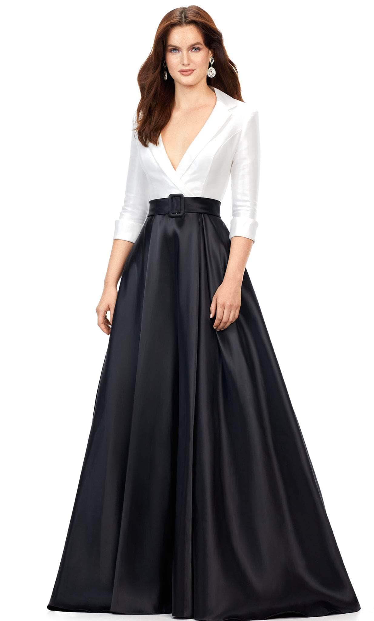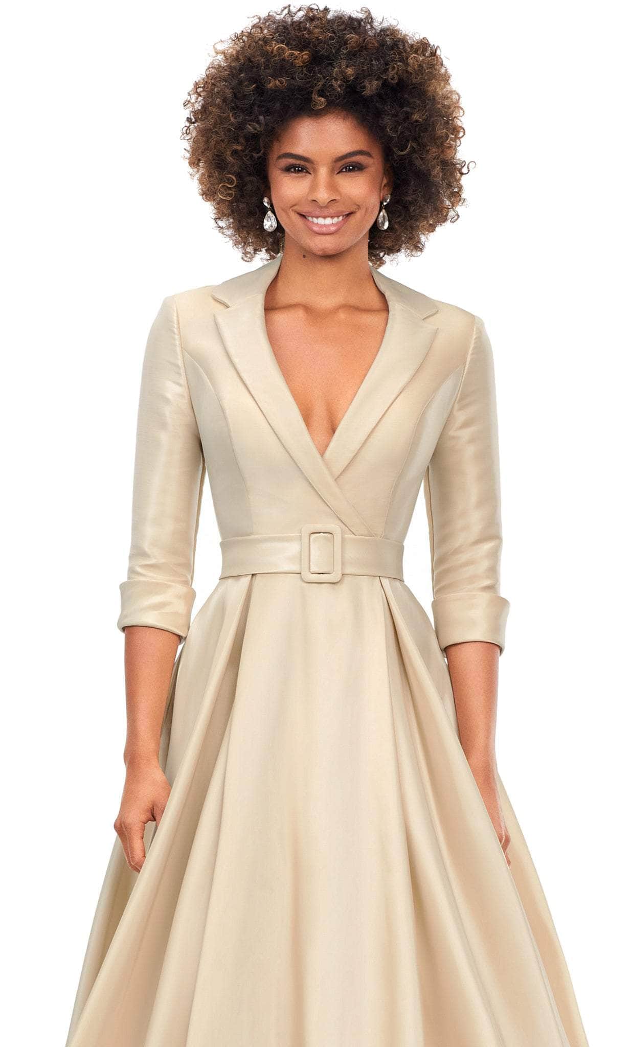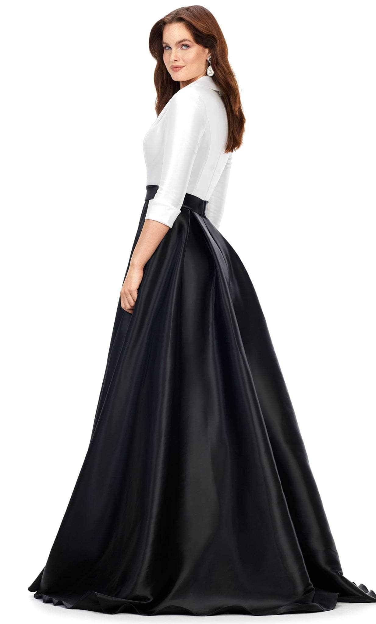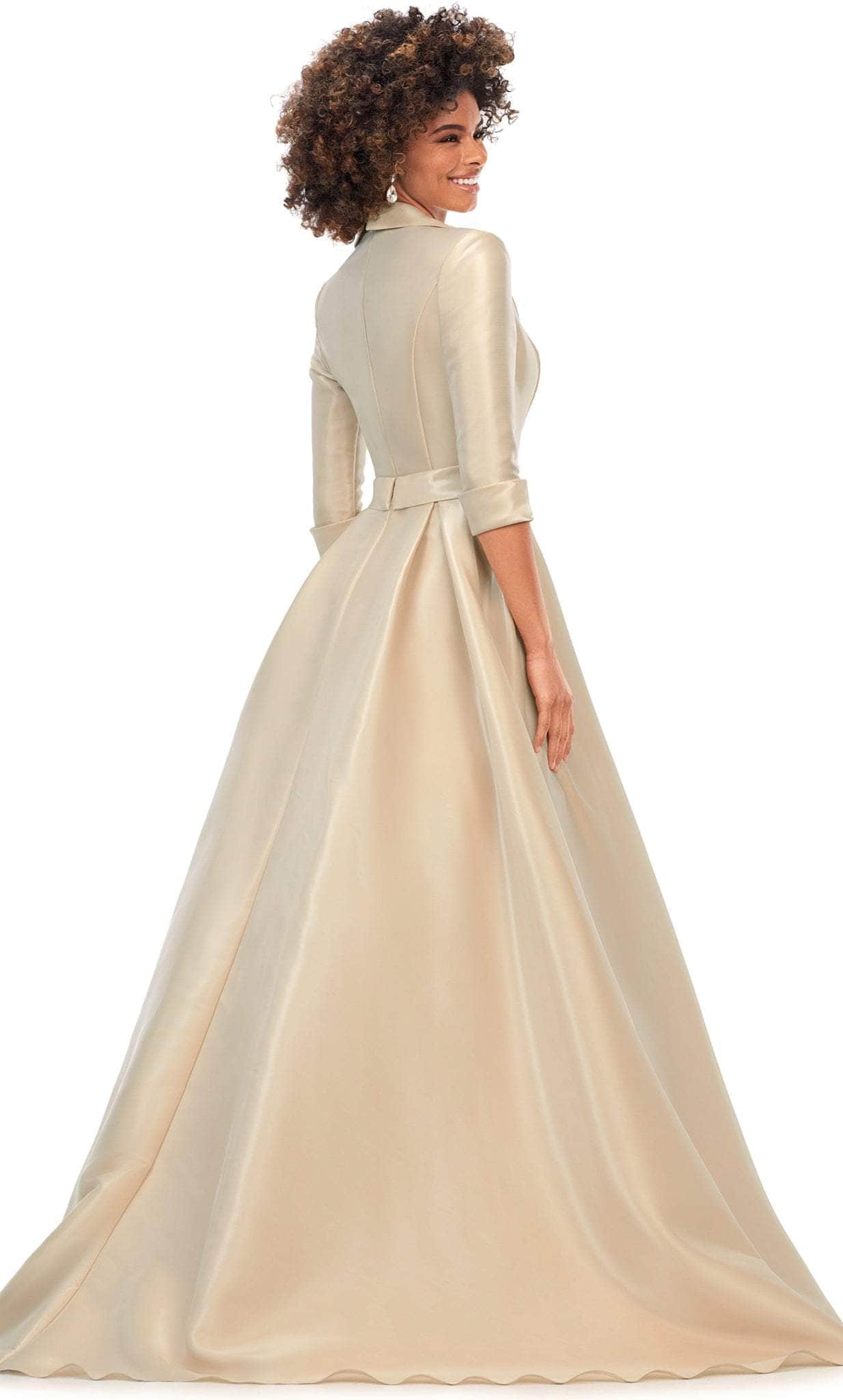 Elevate your evening with the captivating elegance of the Ashley Lauren 11326. This stunning gown, crafted from luxurious satin, exudes sophistication and allure. The deep V-neckline is both bold and refined, accentuated by a chic lapel style that adds a modern twist to classic glamour. Quarter sleeves feature delicate folded details, adding a touch of tailored charm. A buckled belt cinches the waist, highlighting your curves, while the skirt flows into a voluminous ballgown silhouette with a graceful sweep train. Every detail of thisAshley Lauren 11326 creation is designed to leave a lasting impression, making it the perfect choice for any memorable occasion. Models are wearing Champagne and Ivory Black color.