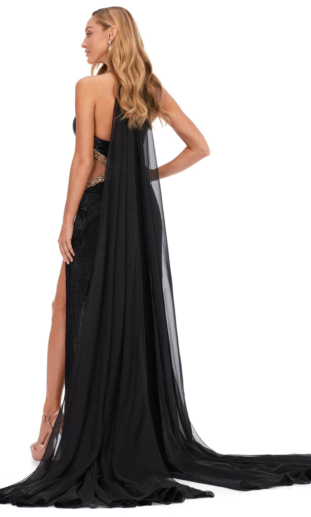 | Details: | Sleeveless, Plunging neckline, Sheer panel, Chiffon cape, Liquid beading, Body cut outs, High slit, Floor length, Sweep train |