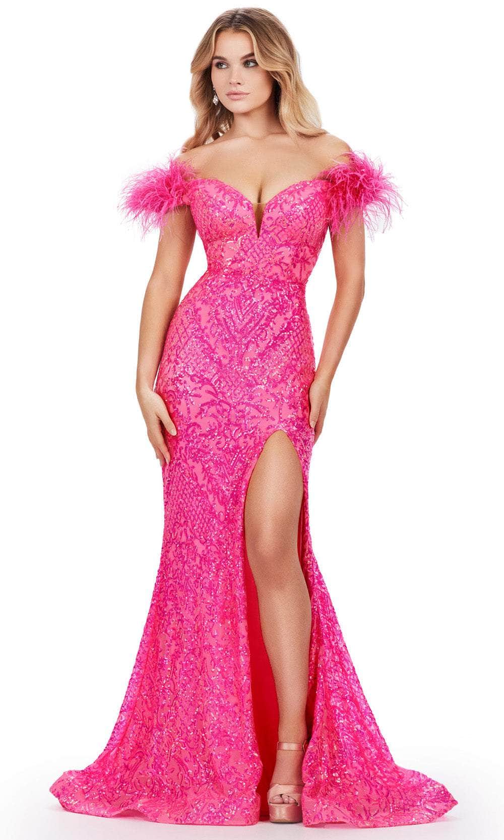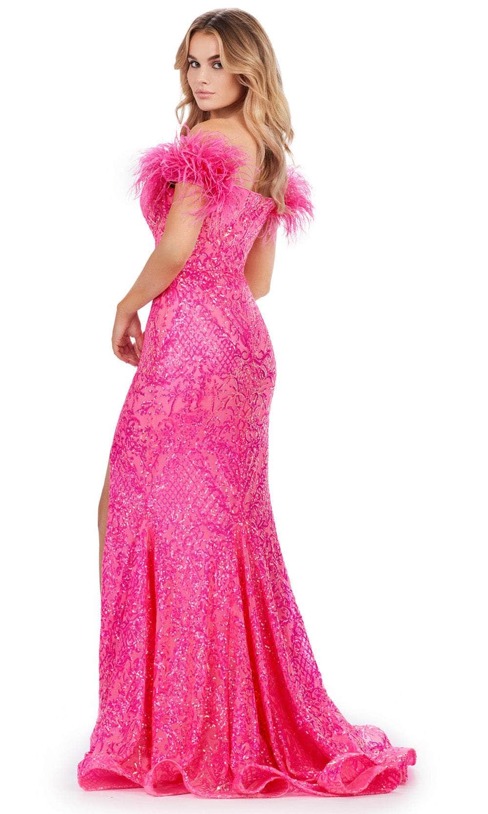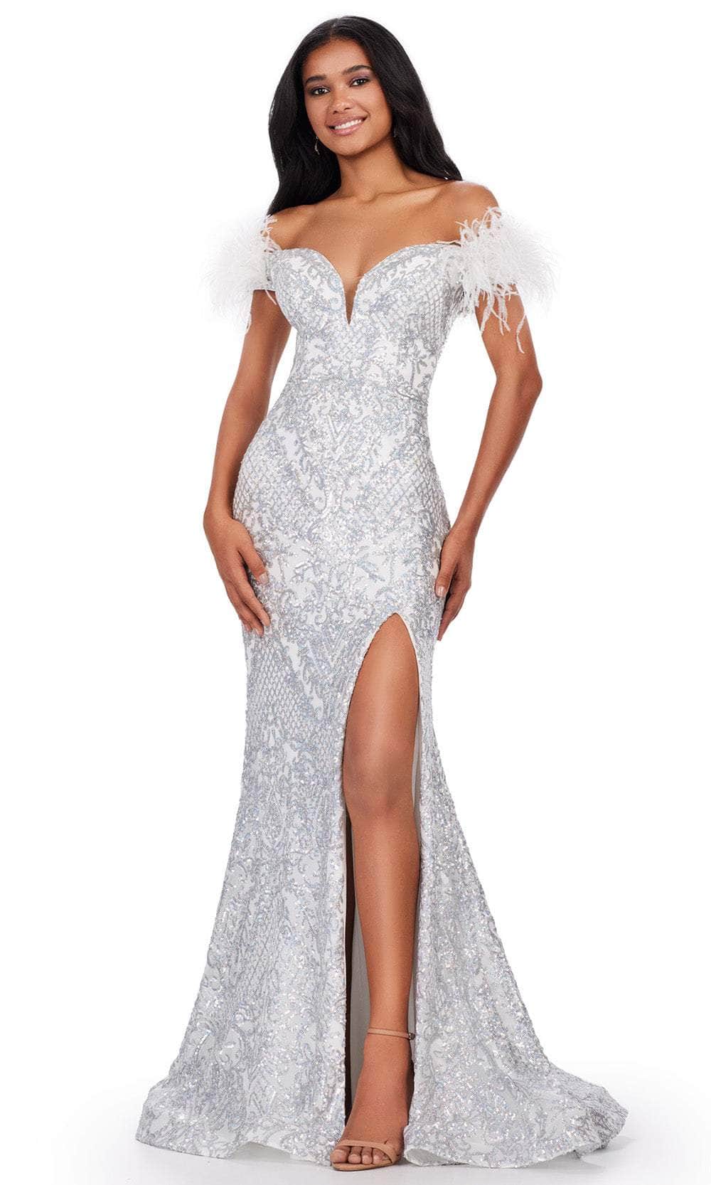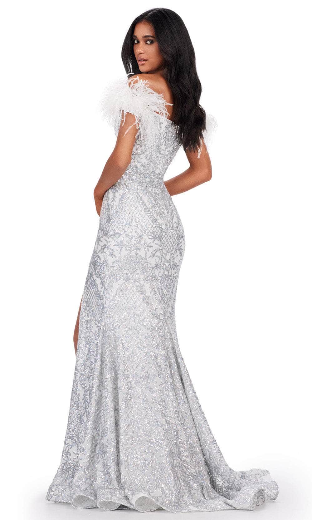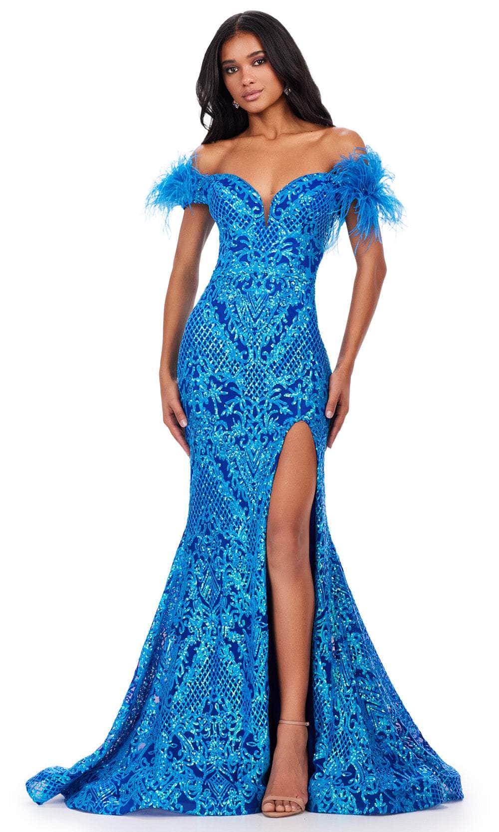 Elevate your presence and shine with unparalleled elegance in the resplendent Ashley Lauren 11463 gown. This exquisite creation features a meticulously tailored silhouette adorned with multi-patterned sequins, creating a mesmerizing play of light and texture. The gown has feather sleeves add a touch of whimsy and opulence, effortlessly framing the shoulders and enhancing its off-shoulder neckline. The sweetheart bodice adds a hint of romance to the ensemble, while the daring high slit reveals a glimpse of sophistication. With its midrise back and concealed zipper closure, the mermaid skirt hugs the curves with grace and allure, flowing into a sweeping train that leaves a lasting impression. The Ashley Lauren 11463 gown is the epitome of refined glamour. Models are wearing the Bronze/Black, Hot Pink, Silver/Ivory, and Turquoise/Royal colors.