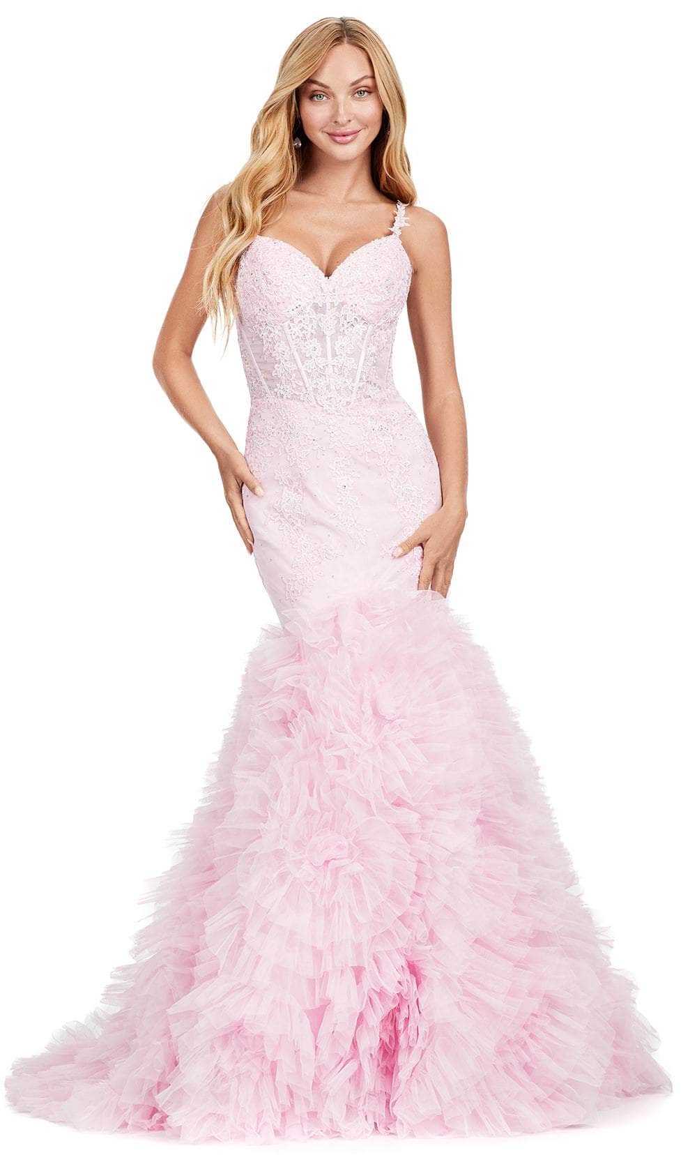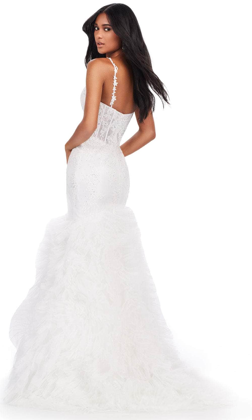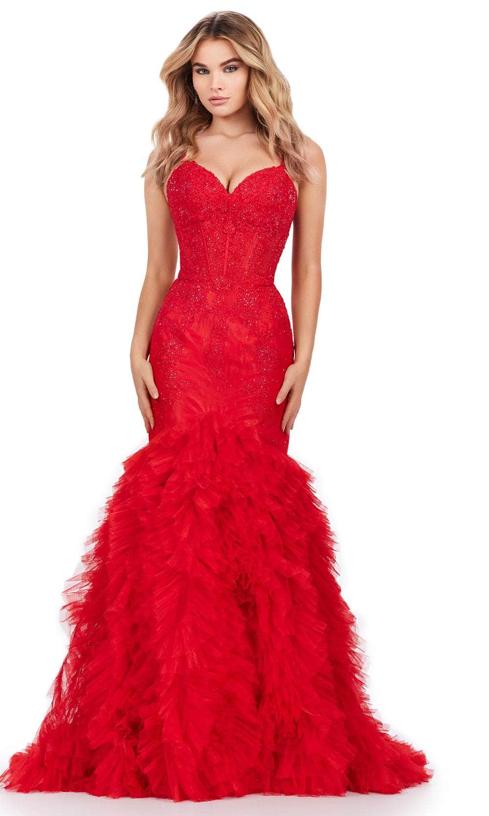 Emanate sophistication and charm as you make your grand entrance in the Ashley Lauren 11475 dress on the red carpet. This gown features delicate spaghetti straps and a sweetheart neckline with a plunging inset, paired with a corset bodice. It includes lace details embellished with subtle rhinestone accents for added allure. The midrise back discreetly houses a concealed zipper closure. The trumpet skirt elegantly flares with ruffled tulle, introducing a touch of theatricality, and extends into a sweeping train. Luxuriate in the grandeur of this Ashley Lauren 11475 masterpiece. Models are wearing the Black, Ice Pink, Red, and White colors.
