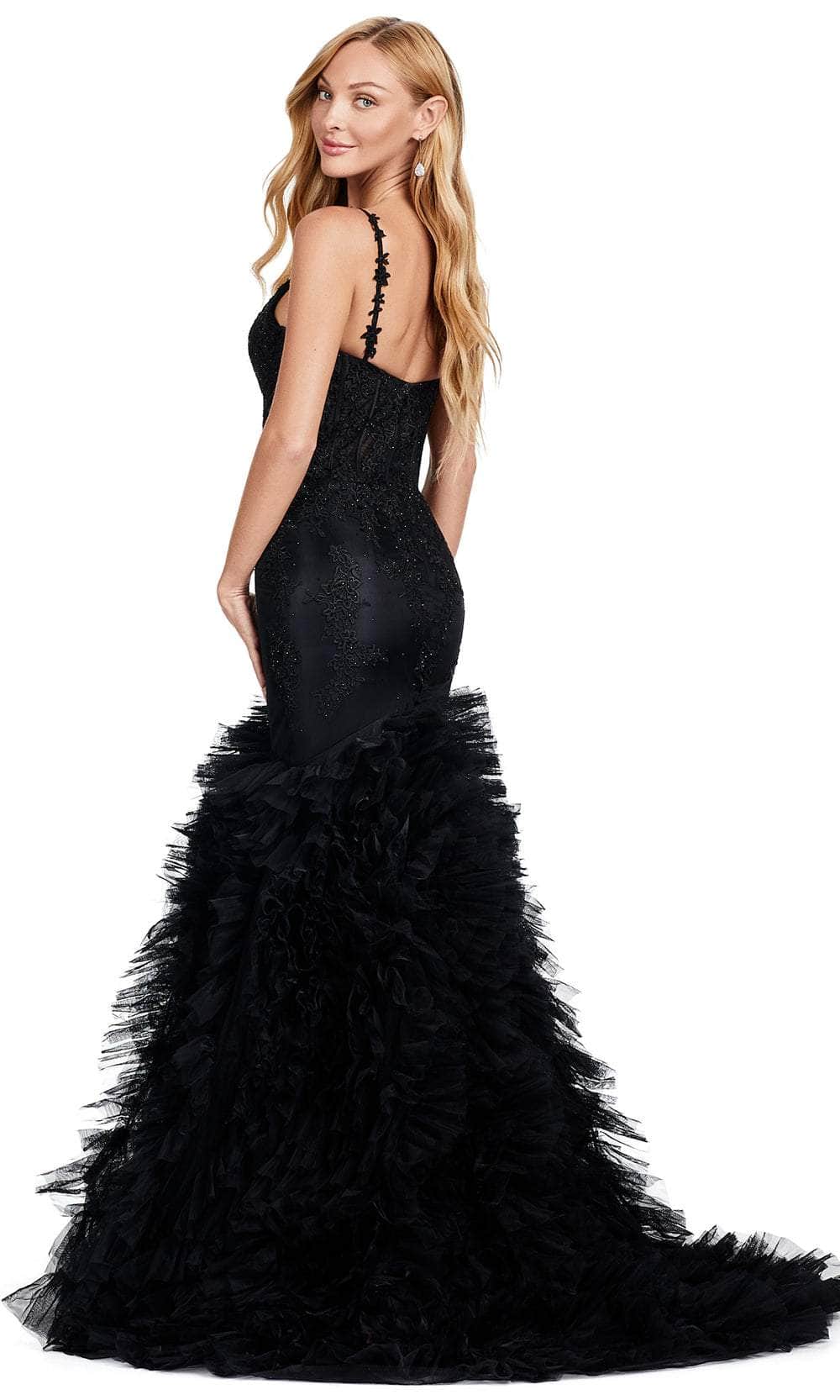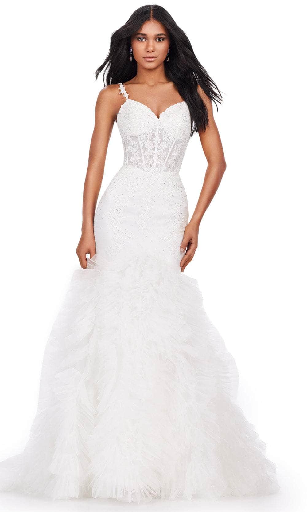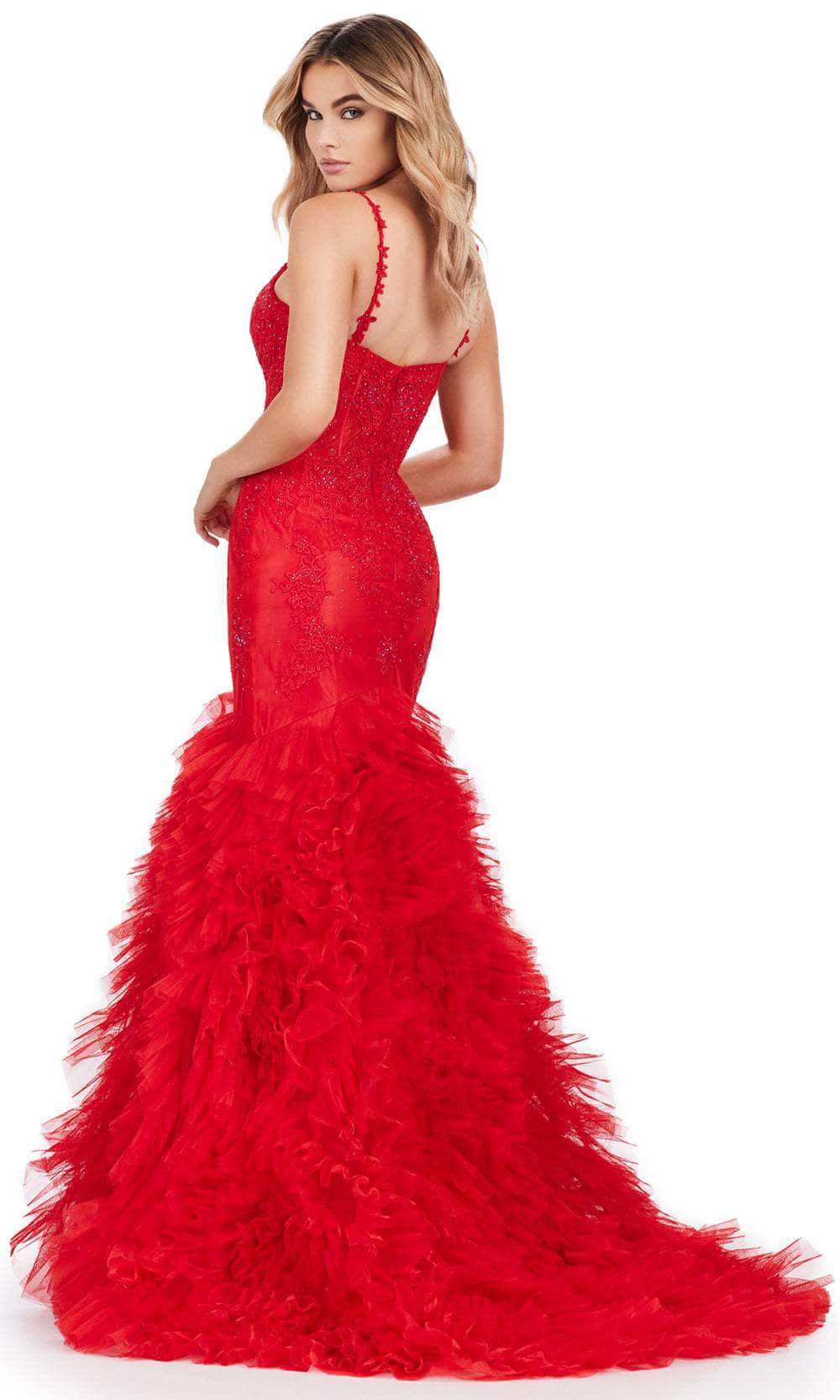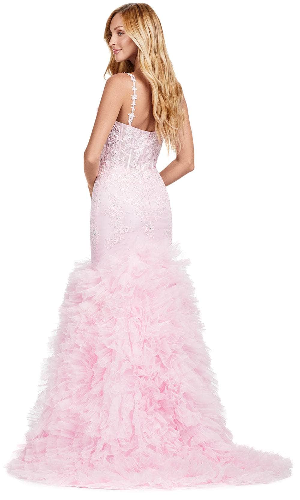 Emanate sophistication and charm as you make your grand entrance in the Ashley Lauren 11475 dress on the red carpet. This gown features delicate spaghetti straps and a sweetheart neckline with a plunging inset, paired with a corset bodice. It includes lace details embellished with subtle rhinestone accents for added allure. The midrise back discreetly houses a concealed zipper closure. The trumpet skirt elegantly flares with ruffled tulle, introducing a touch of theatricality, and extends into a sweeping train. Luxuriate in the grandeur of this Ashley Lauren 11475 masterpiece. Models are wearing the Black, Ice Pink, Red, and White colors.