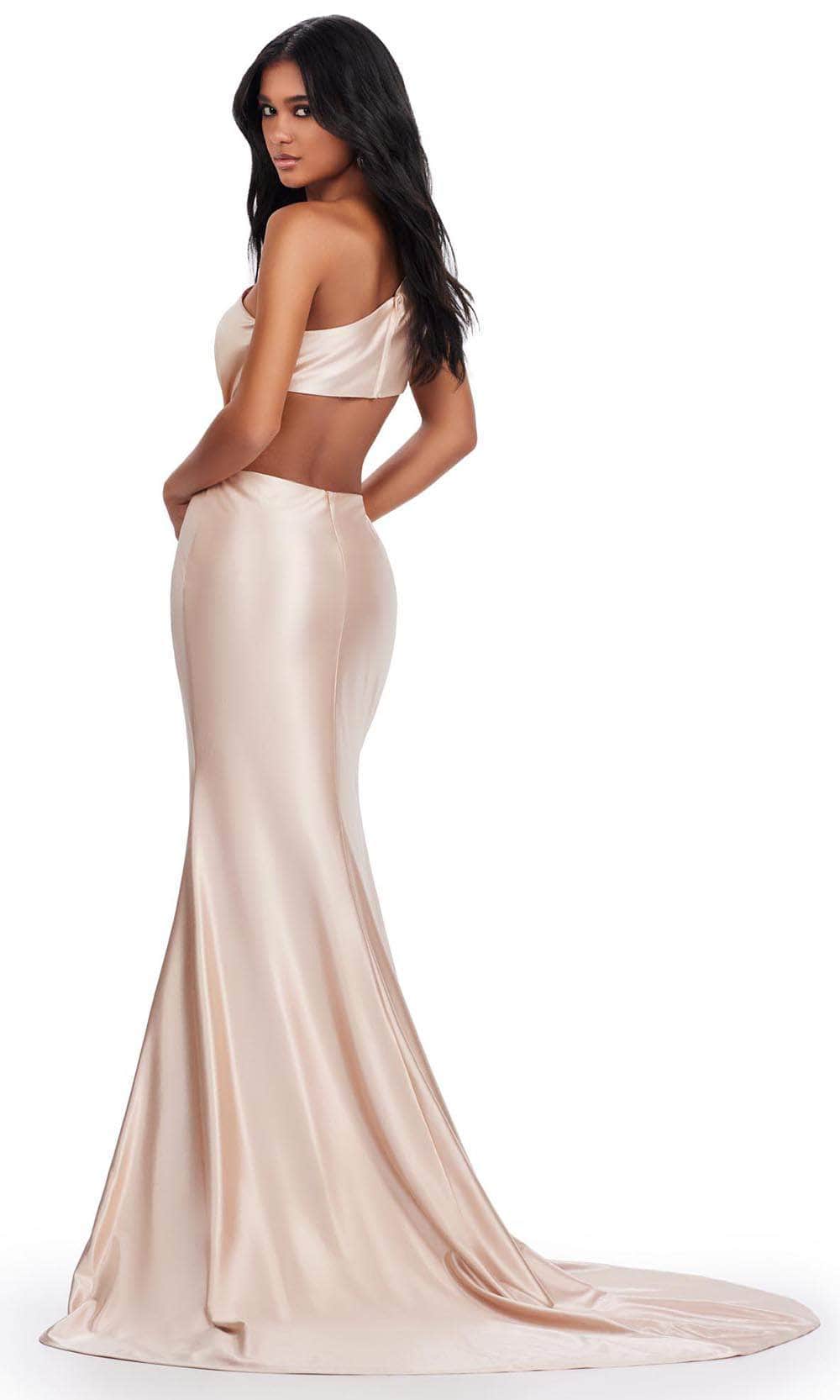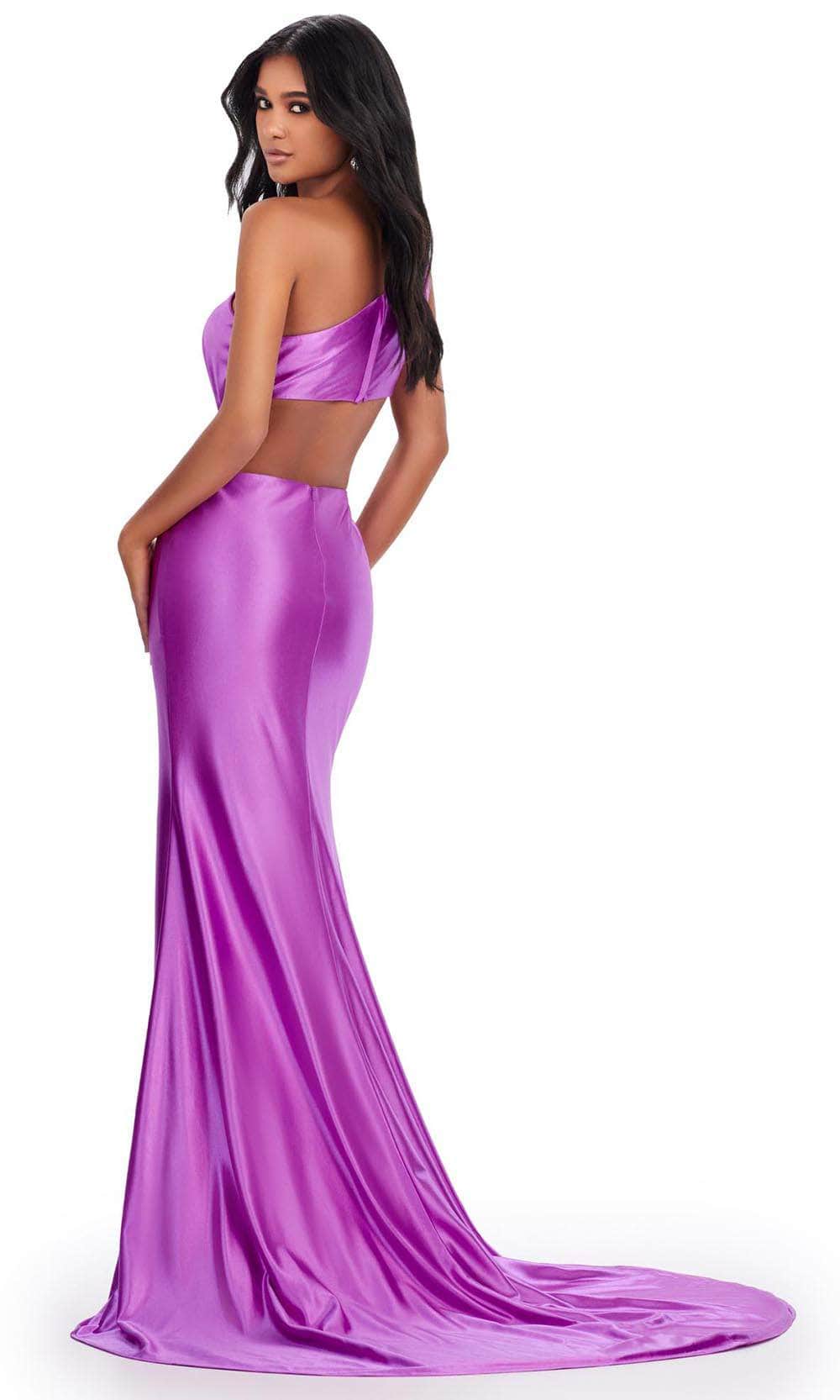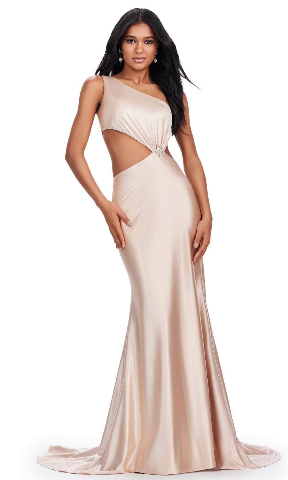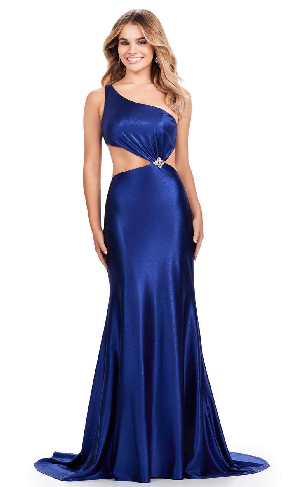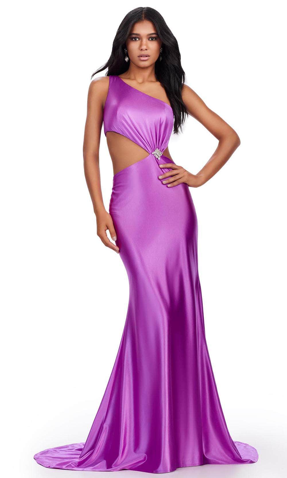 Be ready to steal the show on your special occasion with this Ashley Lauren 11577 masterpiece. This exquisite sleeveless gown is crafted from luxurious satin fabric that drapes beautifully on your figure. It boasts a one-shoulder design topped by an asymmetrical neckline and single wide straps. Additional highlights are the sparkling beaded brooch, and cutout detailing on the waist and back to accentuate your natural curves. Its back zipper closure ensures a seamless fit, while the skirt flawlessly drops to the sweeping train in a striking sheath silhouette. This Ashley Lauren 11577 creation is sure to display your natural beauty and grace. Models are wearing Jade, Midnight, Nude, and Purple colors.