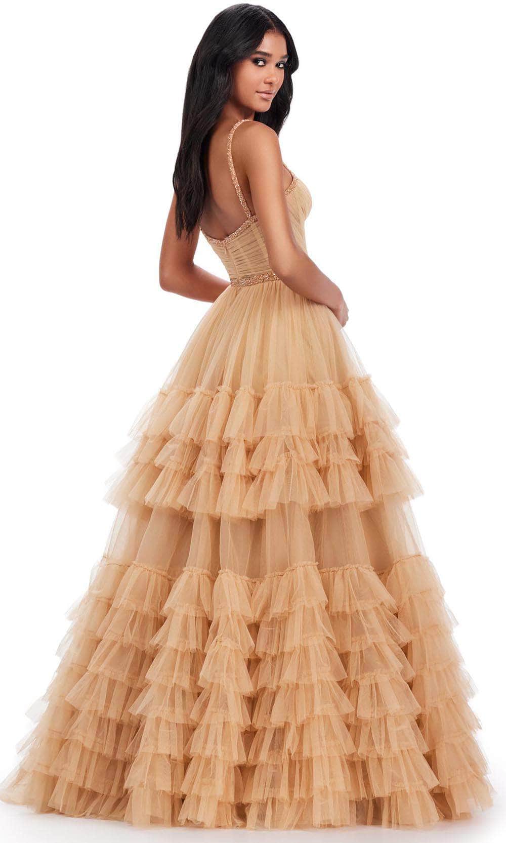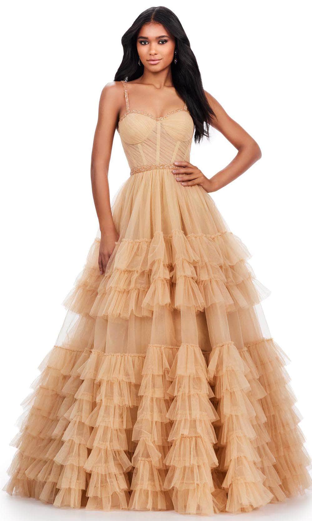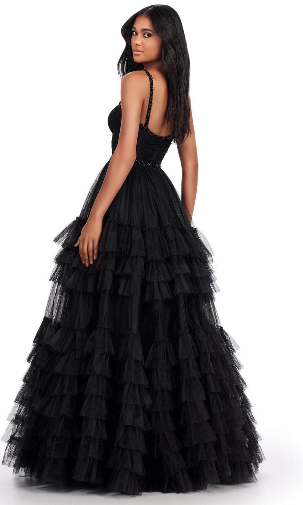 Walk down the red carpet like a dream in this Ashley Lauren 11603 creation. This gown is a classic beauty with its spaghetti straps and sweetheart neckline accented by delicate beaded trims. The ruched bodice adds texture and dimension to the design, while a beaded waistband defines the silhouette. The midrise back features a discreet concealed zipper closure, ensuring a secure fit and a polished appearance. The A-line skirt gracefully cascades to the floor, adorned with ruffled tiers that add an elegant touch. With its floor-length hem, this gown exudes timeless sophistication, making it a versatile choice for a variety of formal occasions. Simple yet elegant, Ashley Lauren 11603 masterpiece captures the essence of understated glamour. Models are wearing the Black and Nude colors.