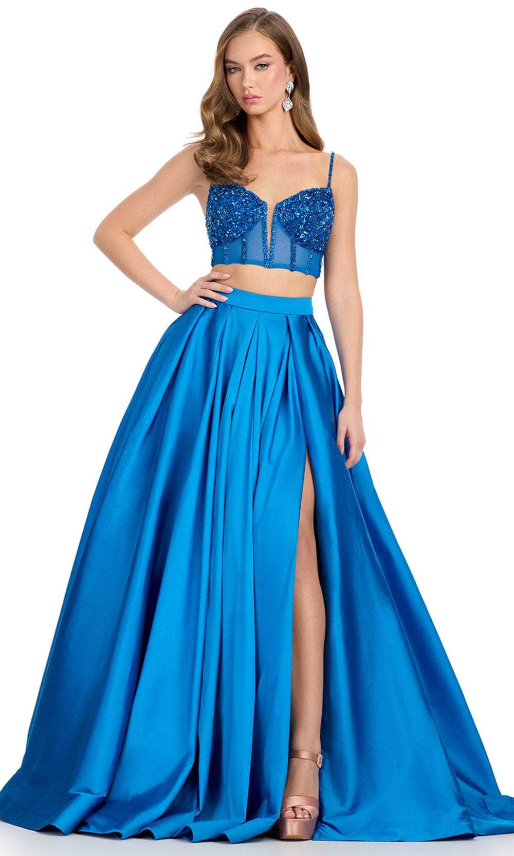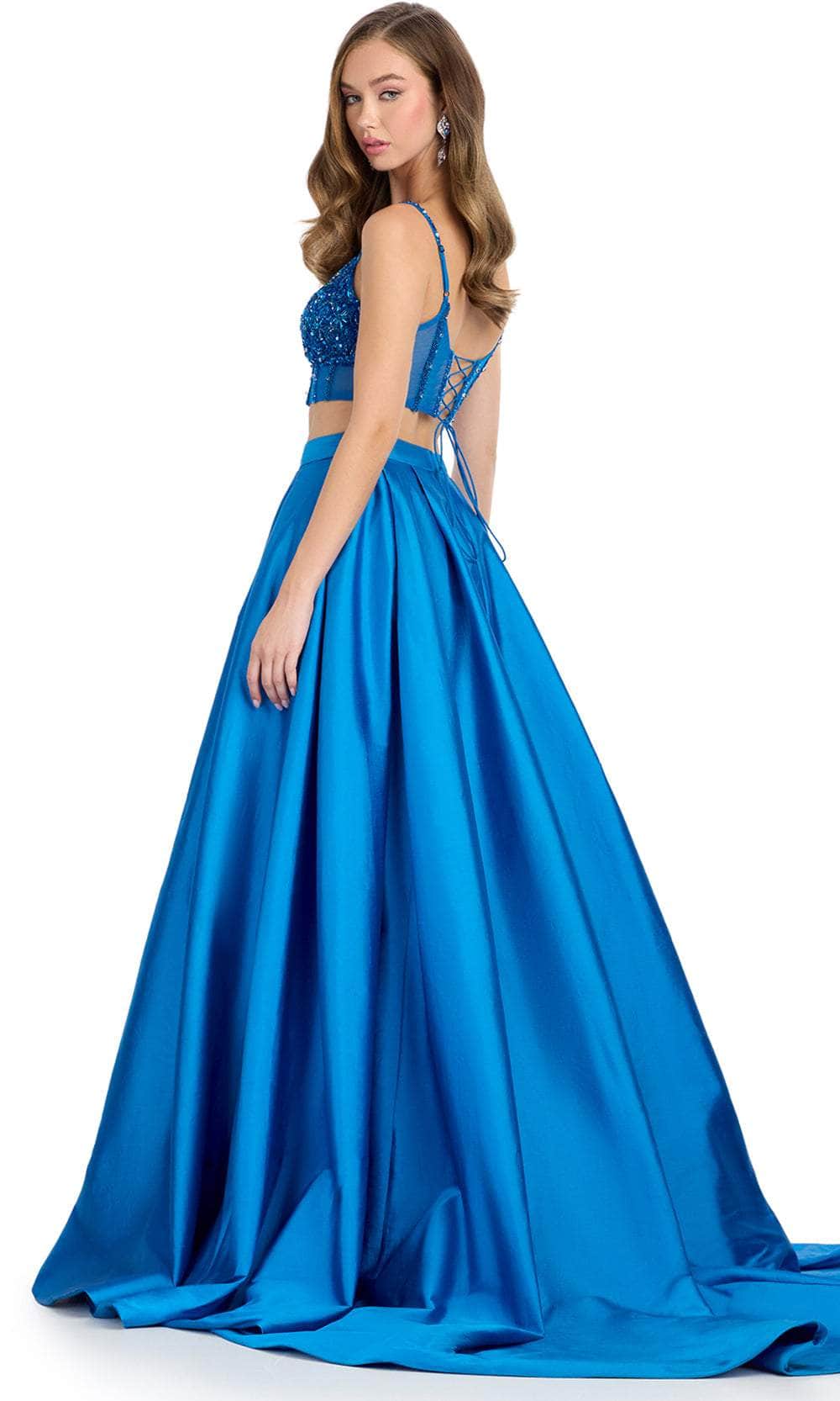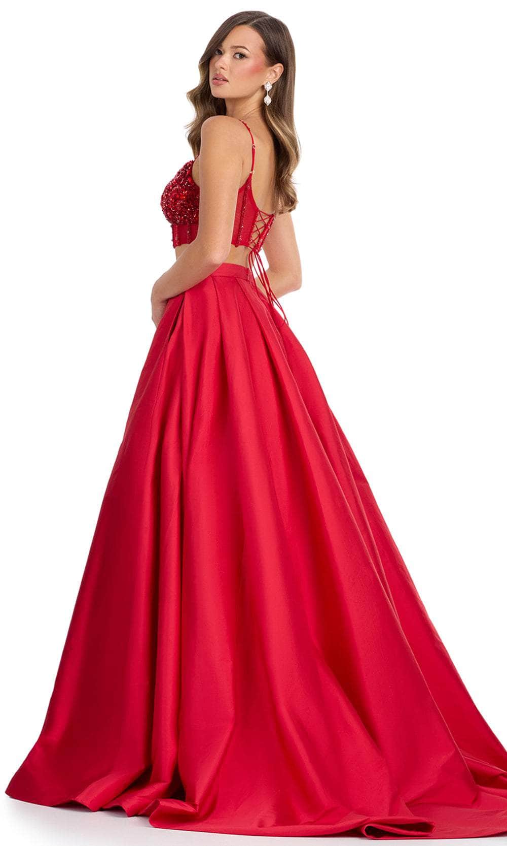 Be divined as a total stunner with this Ashley Lauren 11826 two-piece gown. This beautiful dress features a delicately beaded corset bustier with a sweetheart neckline and spaghetti straps, creating a look of timeless glamour. The lace-up back provides a perfect fit, enhancing your natural silhouette. Paired with a voluminous taffeta ball gown skirt, this gown offers a striking combination of classic and modern elements. Perfect for any grand event, the gown ensures you make a memorable entrance. The intricate details and luxurious design make this Ashley Lauren 11826 a must-have for those who want to shine with sophistication and grace. Models are wearing Peacock and Red colors.