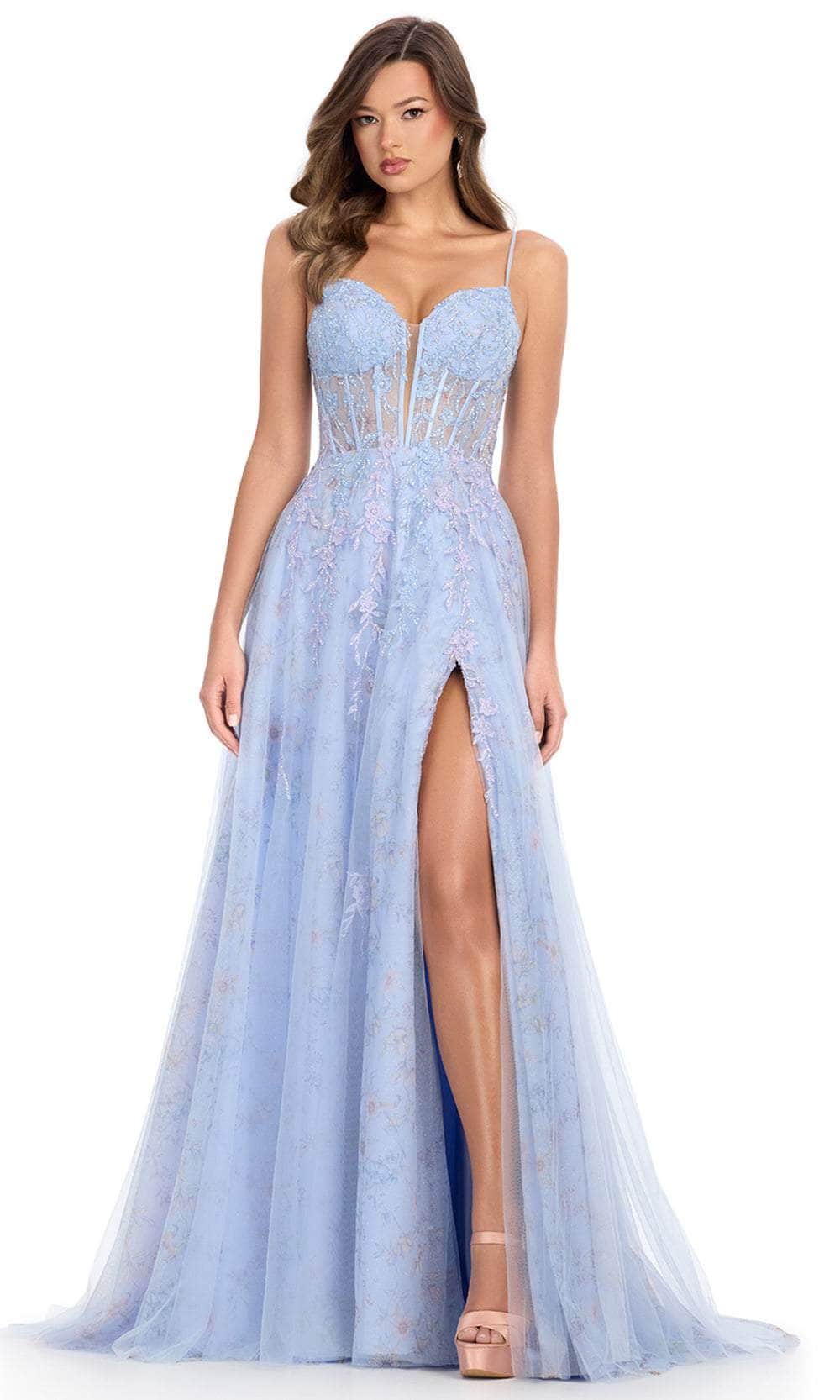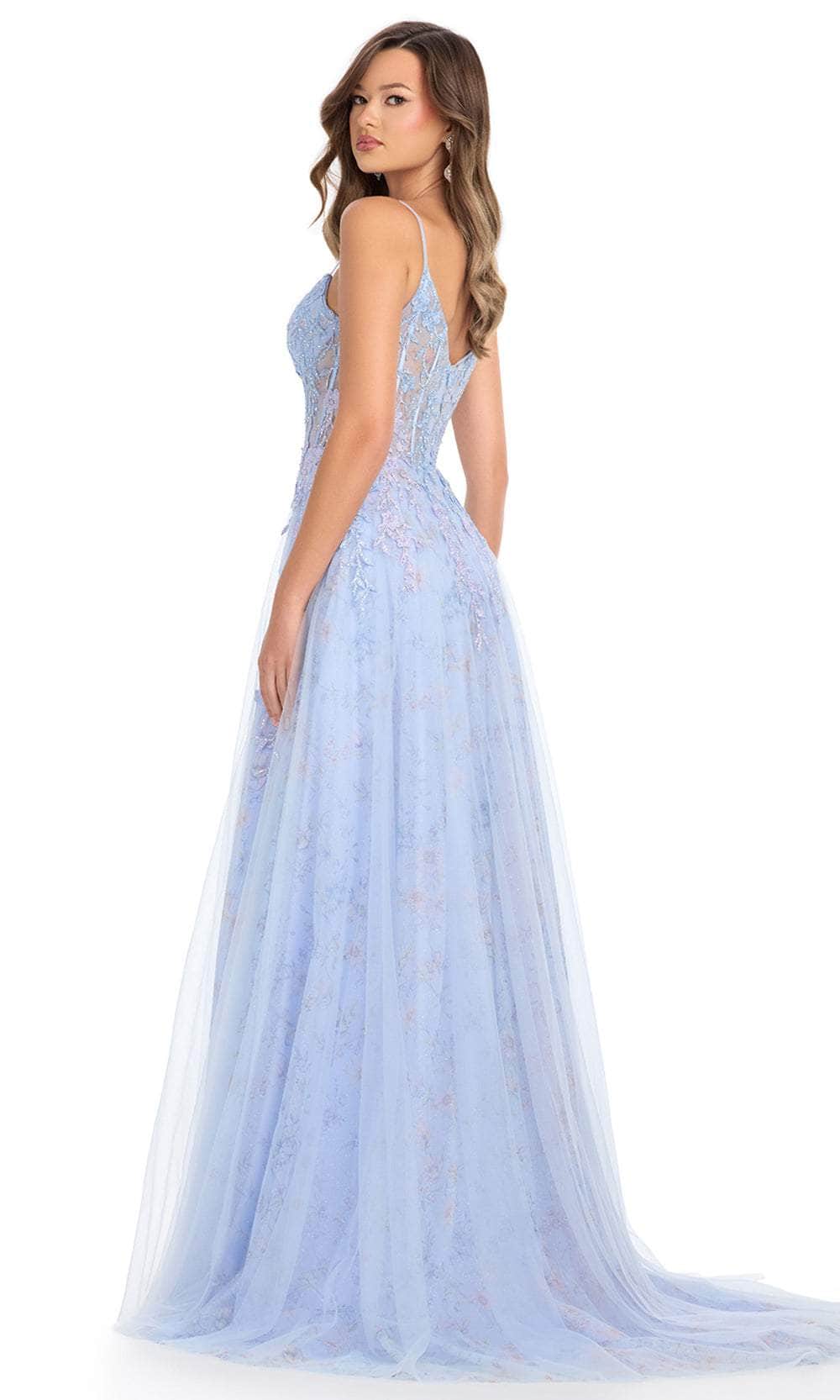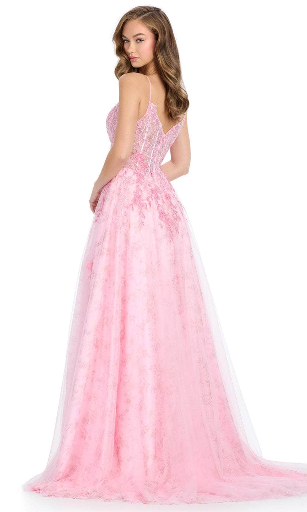 Embrace your inner princess with the Ashley Lauren 11849 gown. This enchanting dress features delicate spaghetti straps and a beautifully crafted corset bustier, providing a romantic and elegant look. The gown is adorned with intricate applique that trickles gracefully down onto the skirt, adding a touch of whimsy and sophistication. A left leg slit offers a stylish and modern twist, ensuring you captivate attention with every step. Perfect for any formal event, the Ashley Lauren 11849 dress combines timeless elegance with contemporary design, making it a standout choice for your special night. Shine brightly and feel like royalty in this exquisite gown. Models are wearing Periwinkle and Pink colors.