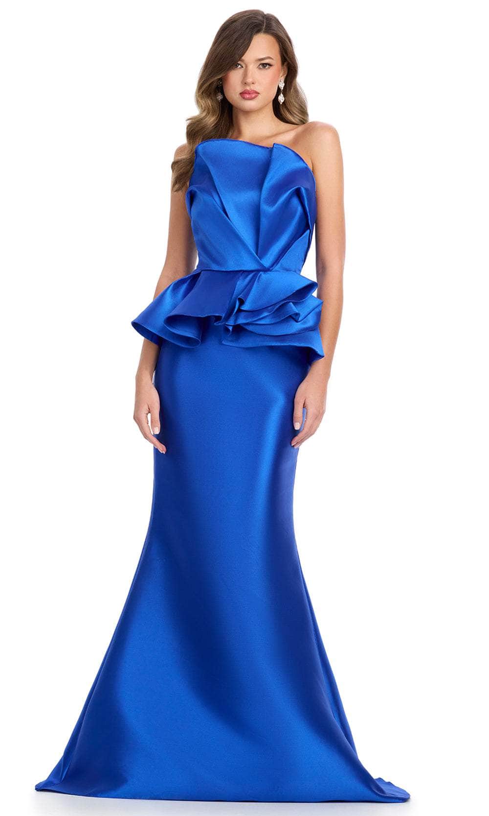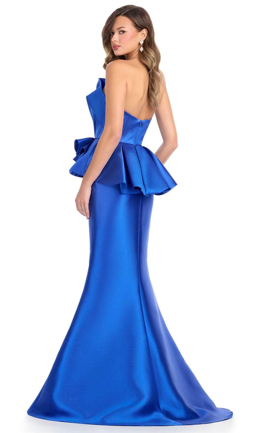 Step into an enchanted night of elegance with this Ashley Lauren 11874 creation. The Mikado dress displays a sculptural asymmetrical pleating and statement-making peplum waist. Its strapless design stands out, featuring an asymmetric neckline and a low open back. Its concealed zipper closure delivers a comfortable fit. The skirt reaches down to the sweep train and presents a mermaid silhouette that highlights your curves. Steal your heart with the enduring allure of this Ashley Lauren 11874 dress. Model is wearing Royal color.