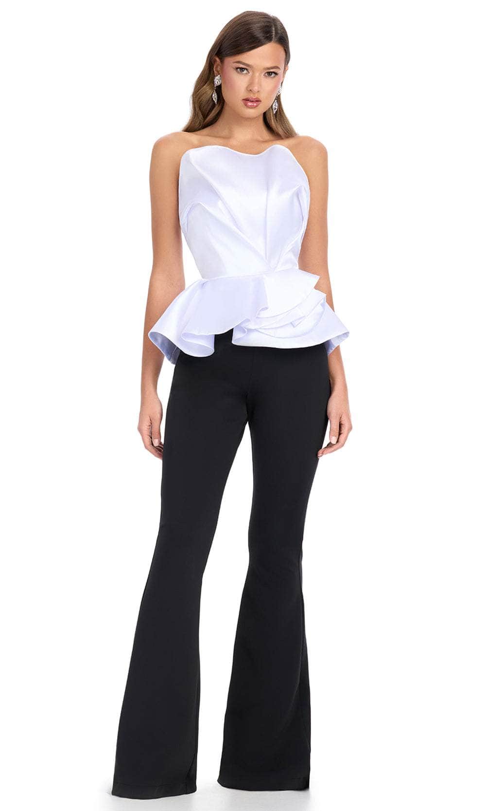 Turn heads with the Ashley Lauren 11875 jumpsuit, designed to make a striking statement. This chic ensemble features a strapless bustier with elegant Mikado asymmetrical pleating that flows into a stylish peplum waist. The scuba fabric pants offer a sleek and comfortable fit, creating a seamless blend of sophistication and modern style. Perfect for any formal event or night out, this jumpsuit combines contemporary design with timeless elegance. The Ashley Lauren 11875 jumpsuit ensures you stand out with confidence and poise, making it a must-have addition to your wardrobe. Models are wearing Periwinkle and Pink colors.