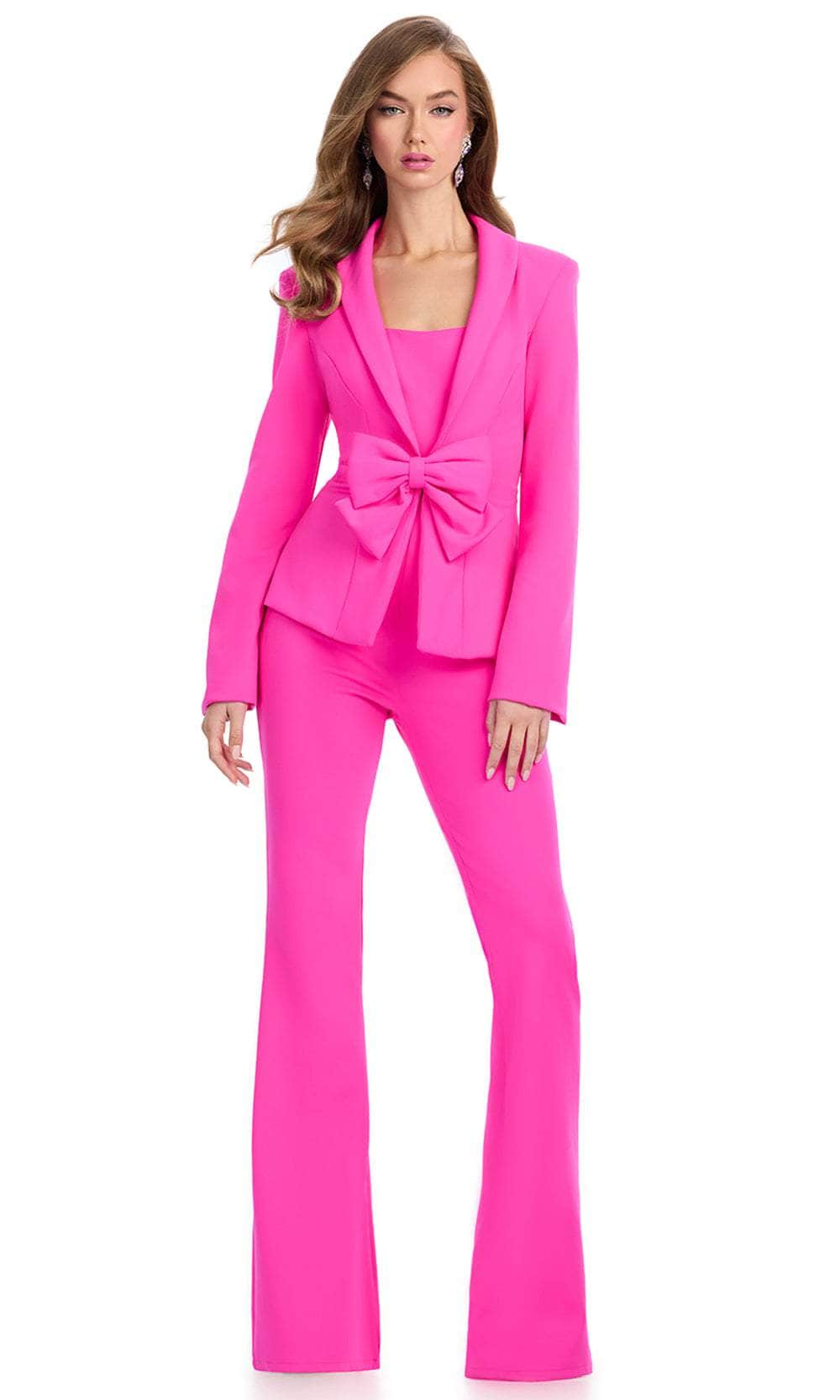 Strike the picture-perfect pose in this chic Ashley Lauren 11967. Made from scuba fabric, the two-piece ensemble showcases a blazer jacket with a classic collar, v-neckline, and front bow closure for a touch of feminine flair. The pants contour your hips beautifully, then flare gracefully at the knees to form a statuesque jumpsuit silhouette. With the Ashley Lauren 11967, you will step into every room feeling elegant and ready to conquer like a boss. Models are wearing Black, Fuchsia, and Sky colors.