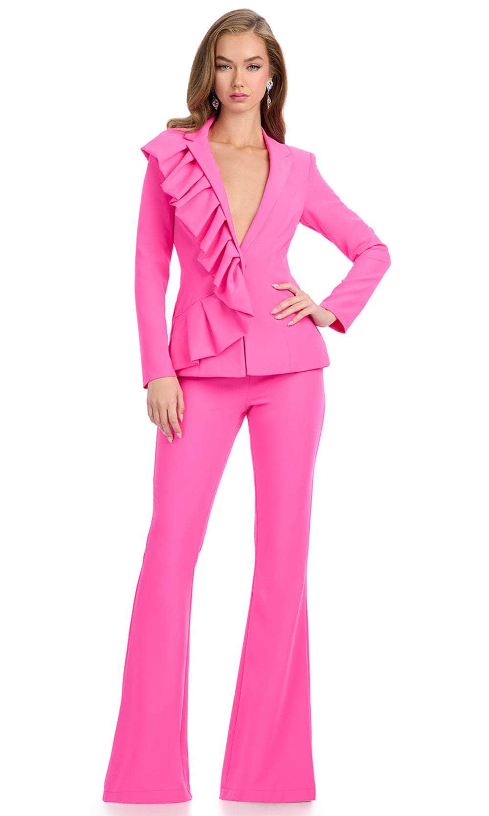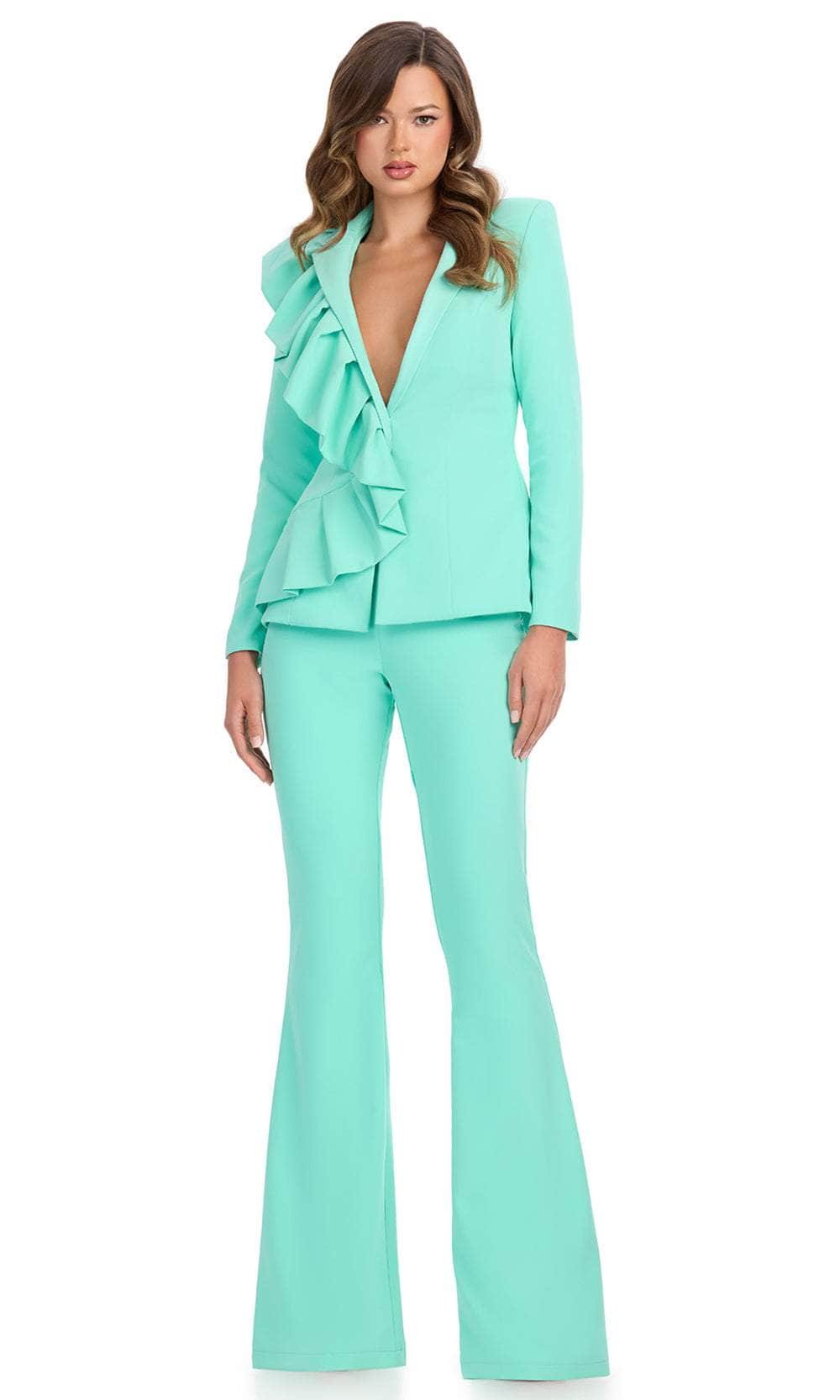 Everyone who sees you will be left speechless and giddy in this astounding creation by Ashley Lauren 11971, a perfect blend of elegance and contemporary fashion. This eye-catching set features a stunning V-neckline adorned with a side ruffle, creating a chic and sophisticated look. The flare pants offer a sleek and flattering fit, making this jumpsuit ideal for any special occasion. Made from luxurious jersey fabric, the Ashley Lauren 11971 jumpsuit ensures comfort and elegance throughout the night. Perfect for those who love to stand out, this two-piece set combines modern design with classic charm, making it a must-have for your wardrobe. Make a lasting impression and shine with confidence in this fabulous jumpsuit. Models are wearing Aqua and Fuchsia colors.