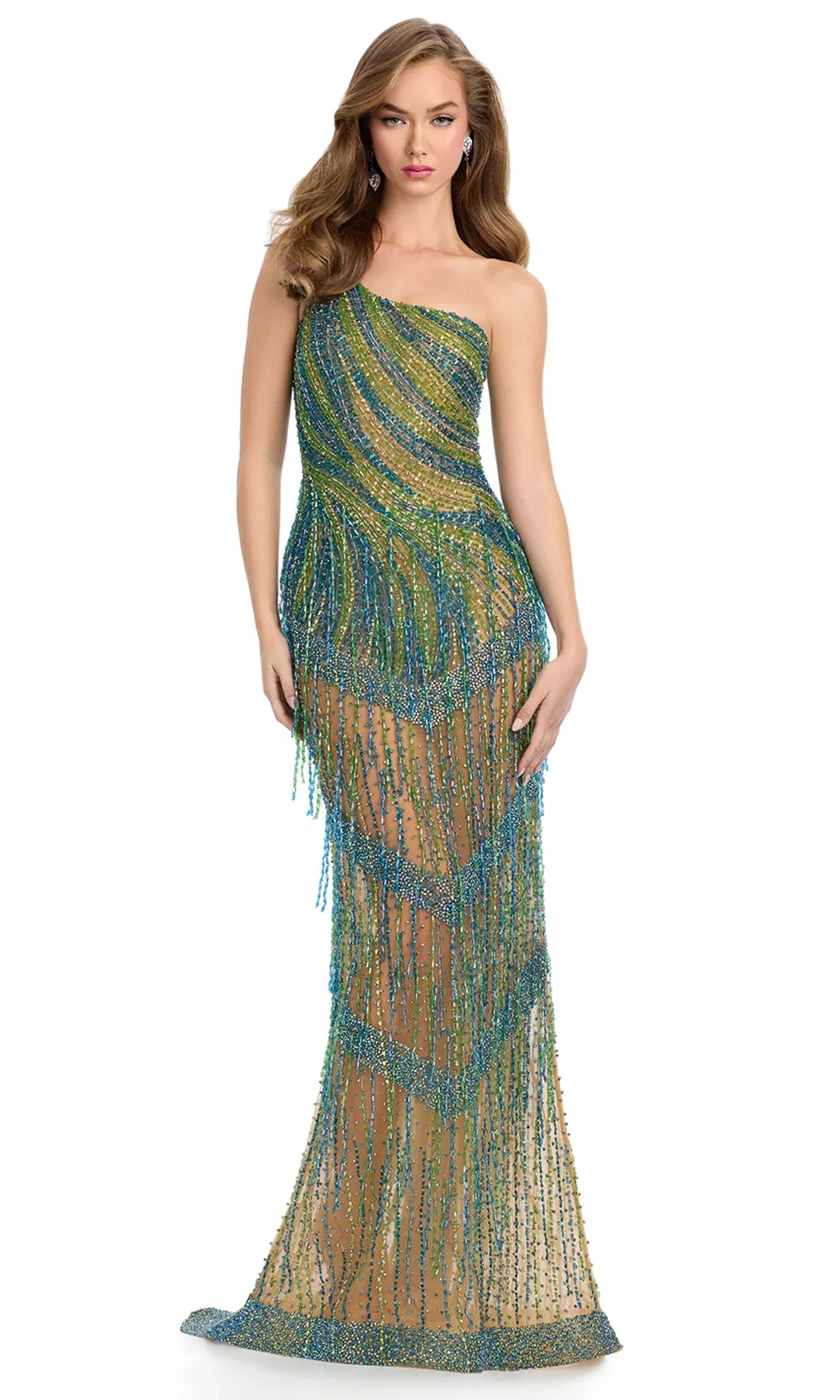 Showcasing an expressive play of shimmer and movement, the Ashley Lauren 11985 is a statement in fashion-forward glamour. The asymmetric neckline and mid-open back enhances its contemporary feel, while the one shoulder strap adds allure to the overall silhouette. Cascading diagonal fringe made entirely of beads flows over a fitted base to create stunning dimension and texture. The flawless execution of detail makes this Ashley Lauren 11985 sheath gown a sophisticated choice for those who appreciate artistry and dramatic elegance. Models are wearing Fuchsia, and Peacock colors.