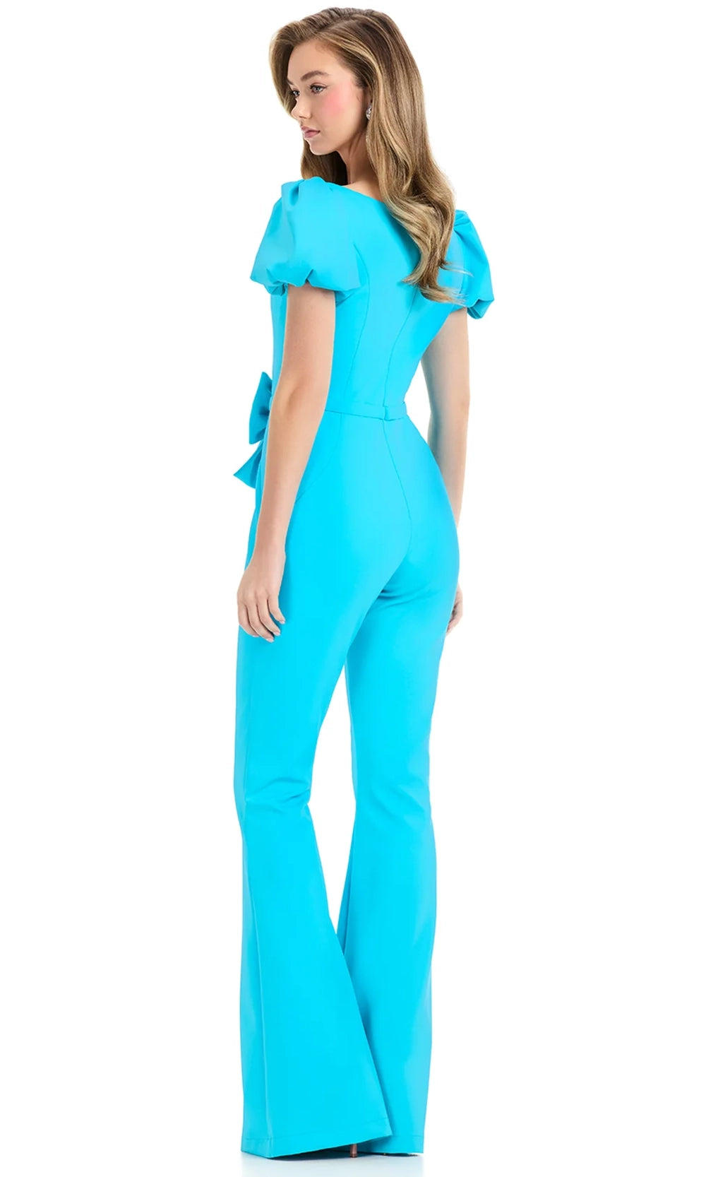 Puffed sleeves and a sculpted silhouette add a lively flair to Ashley Lauren 12089. This jumpsuit features a charming square neckline and short puff sleeves paired with a voluminous bow that defines the waistline beautifully. The pants cascade into a wide-leg bottom, creating a bold structure that perfectly balances femininity and strength. With every step this style exudes grace while maintaining a sharp and contemporary aesthetic. Let Ashley Lauren 12089 guide your fashion forward wardrobe and bring sophistication to your most celebrated occasions. Model is wearing Turquoise color.