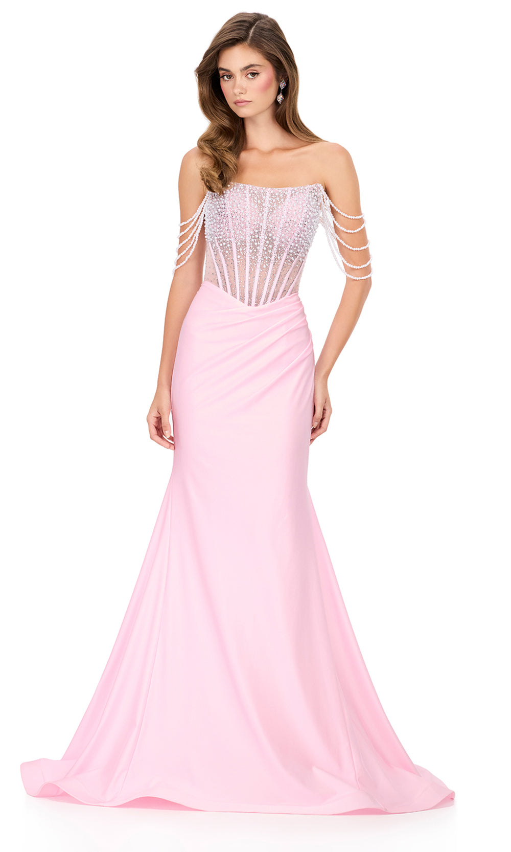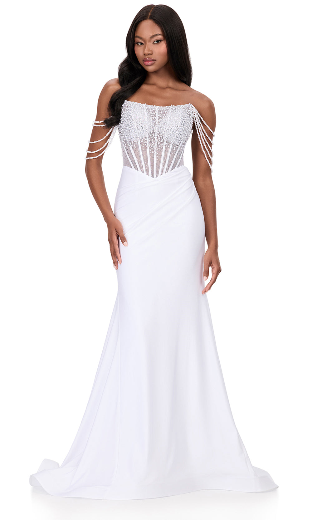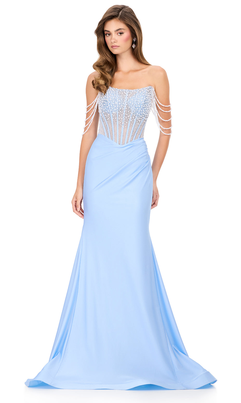 A vision of ethereal glamour, Ashley Lauren 12154 captures artistry through its beaded illusion bodice and fluid silhouette. The straight across neckline exudes refined femininity, while cascading arm drapes of delicate pearls frame the shoulders in graceful rhythm. The ruched mermaid skirt softly contours the hips before falling into a sweeping finish. From elegant gatherings to pageant moments, Ashley Lauren 12154 exudes brilliance through its fusion of modern artistry and classic refinement. Models are wearing Black, Ice Pink, Sky, and White colors.