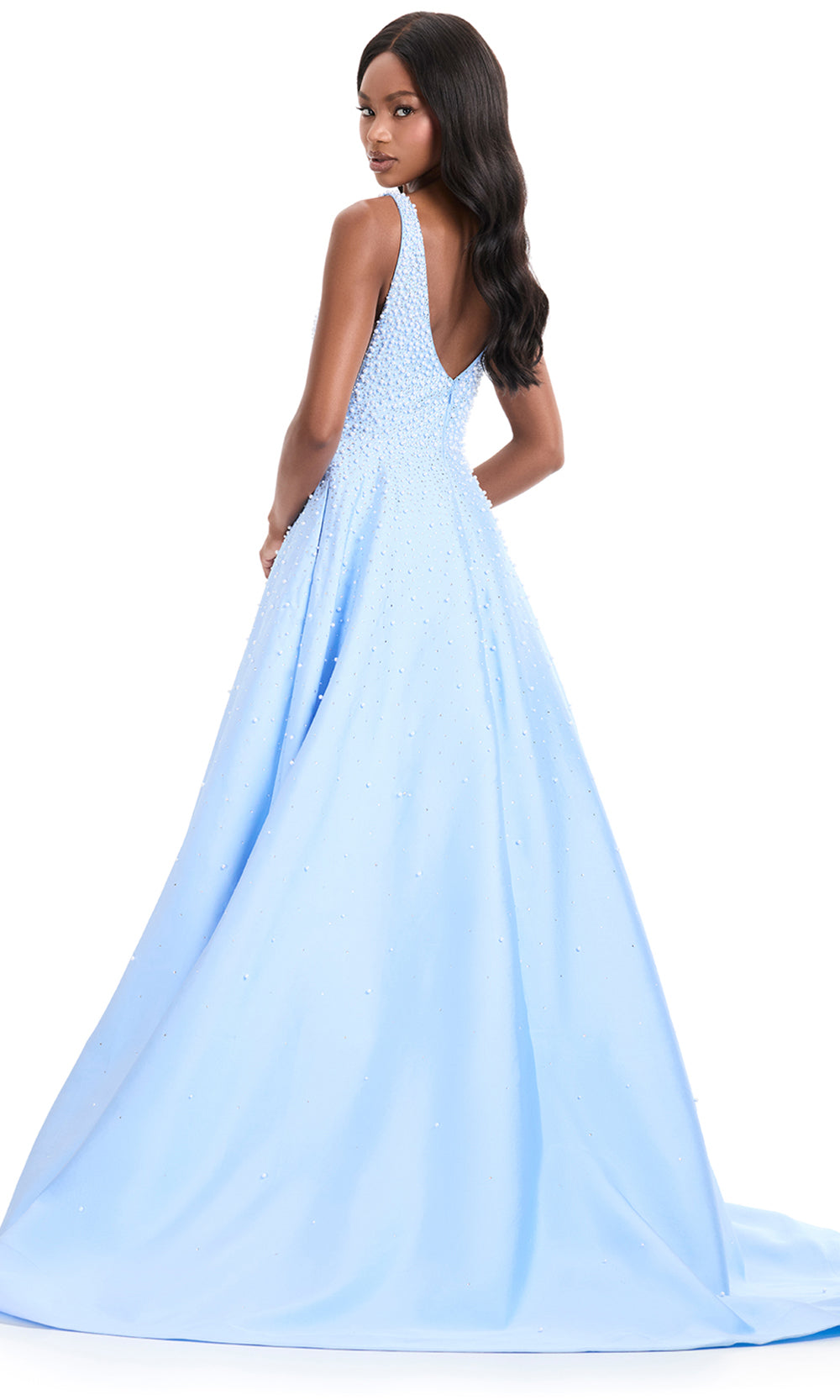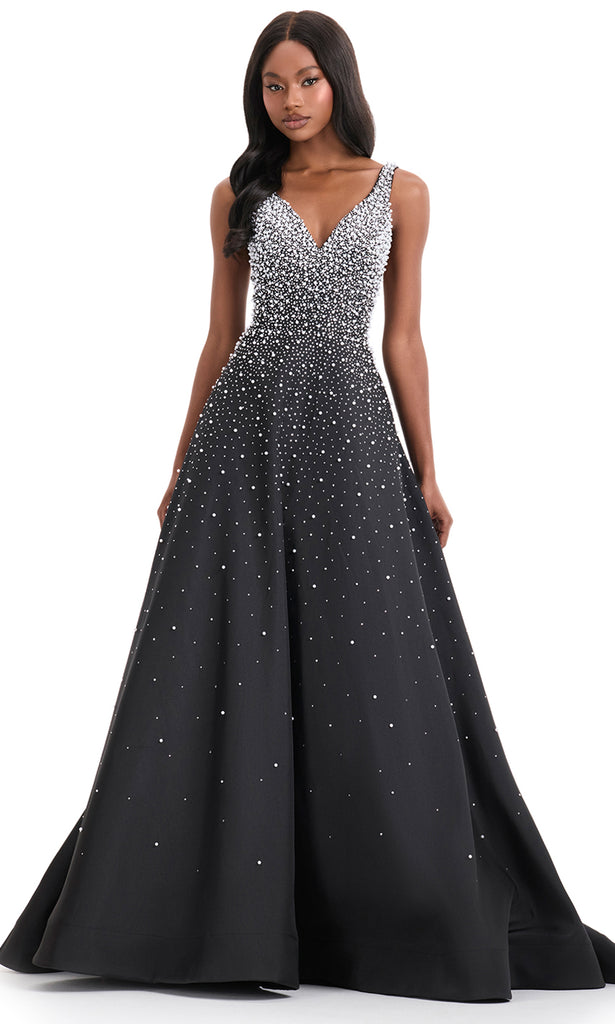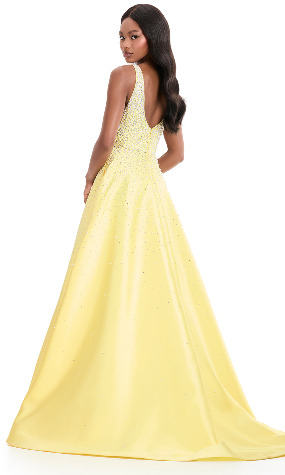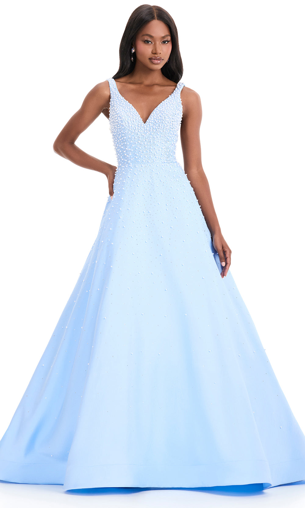Exuding timeless poise, Ashley Lauren 12160 is a dress that brings an air of classic refinement to every formal setting. Designed with a deep v-neckline and structured bodice, it transitions seamlessly into a voluminous A-line skirt that moves gracefully with each step. Intricate embellishments of heat set stones and pearls create a delicate shimmer across the silhouette, adding depth and texture. A modern choice for prom or evening events, Ashley Lauren 12160 celebrates elegance with radiant artistry. Models are wearing Black, Ice Pink, Ivory, Sky, and Yellow colors.