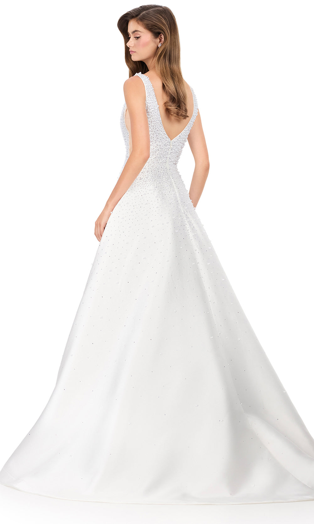 | Details: | Wide Straps, Scattered Heat-Set Stones and Pearls, V-Shaped Back, Sweep Train |