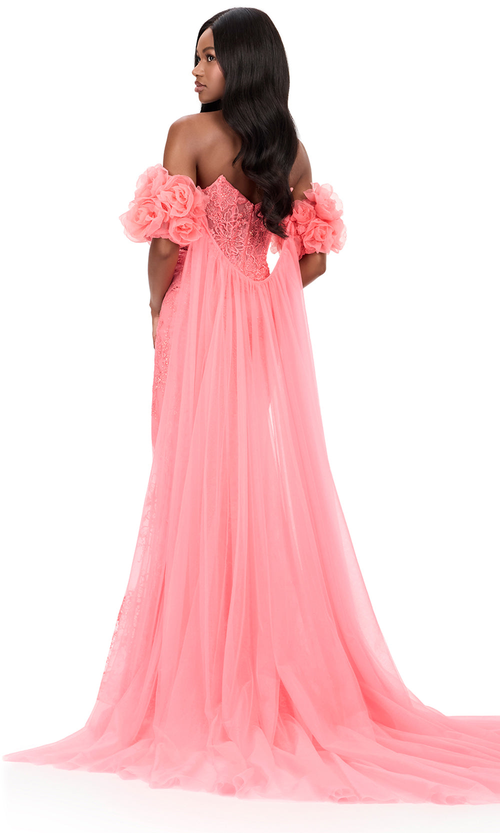 The enchanting Ashley Lauren 12183 gown creates a romantic narrative through intricate lace and refined structure. The sweetheart neckline is framed by soft, 3D floral sleeves with cape that evoke timeless femininity. A corset-inspired bodice defines the waist before transitioning into a flowing sheath skirt, complete with a daring slit for subtle contrast. Lace applique adds tactile depth, while the sweeping train enhances movement with regal effect. Ideal for pageants or formal galas, Ashley Lauren 12183 transforms grace into a moment of captivating allure. Models are wearing Black, and Coral colors.