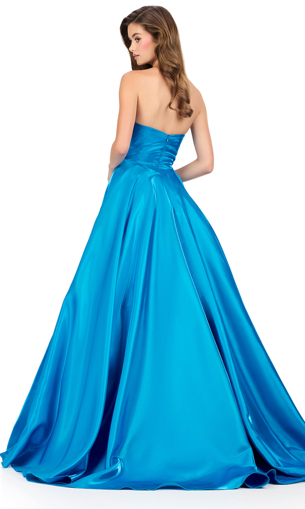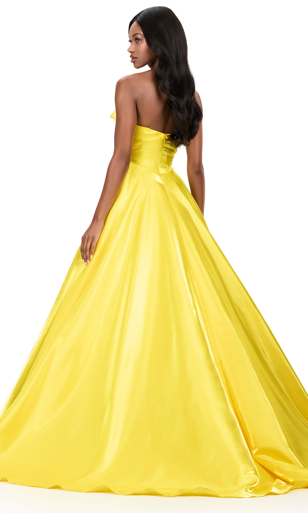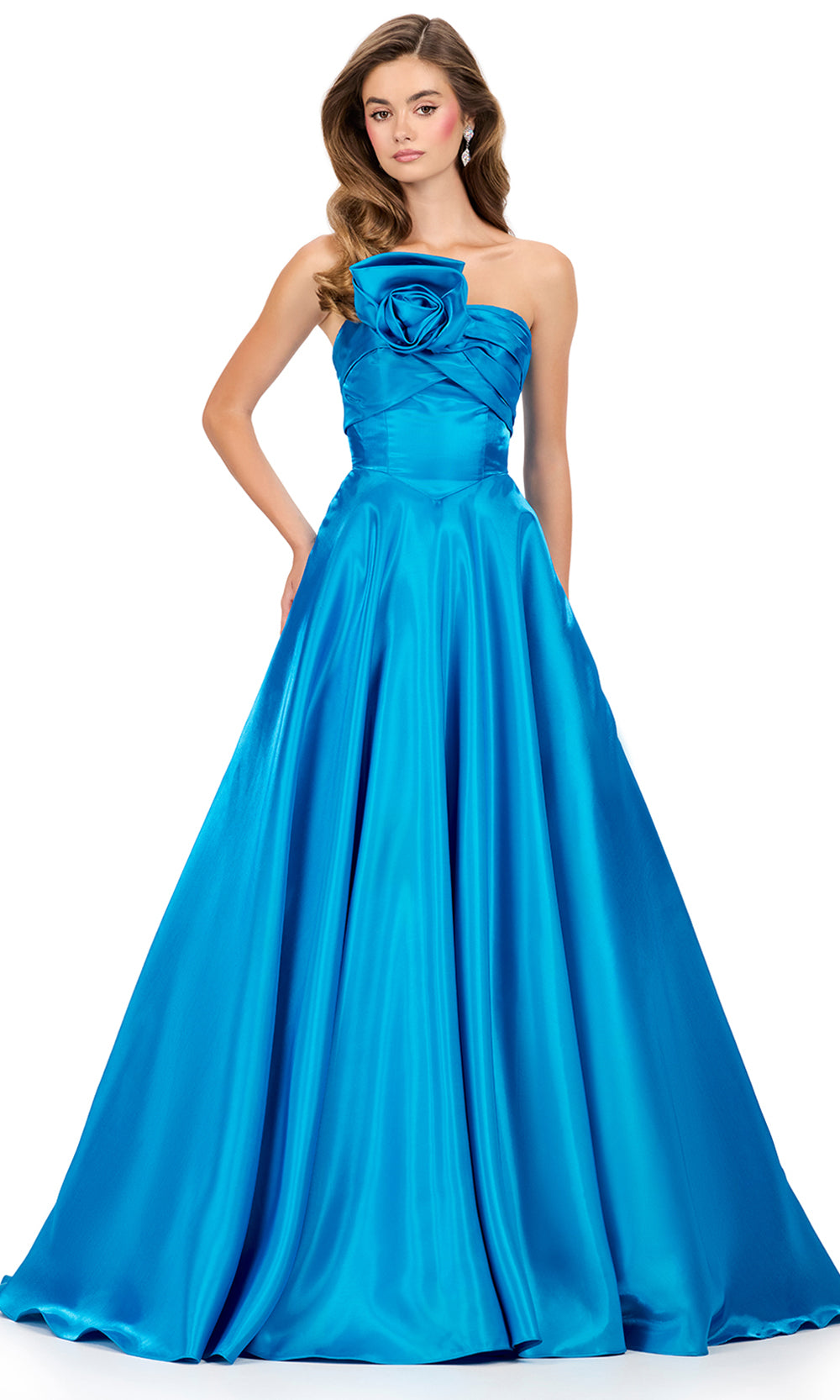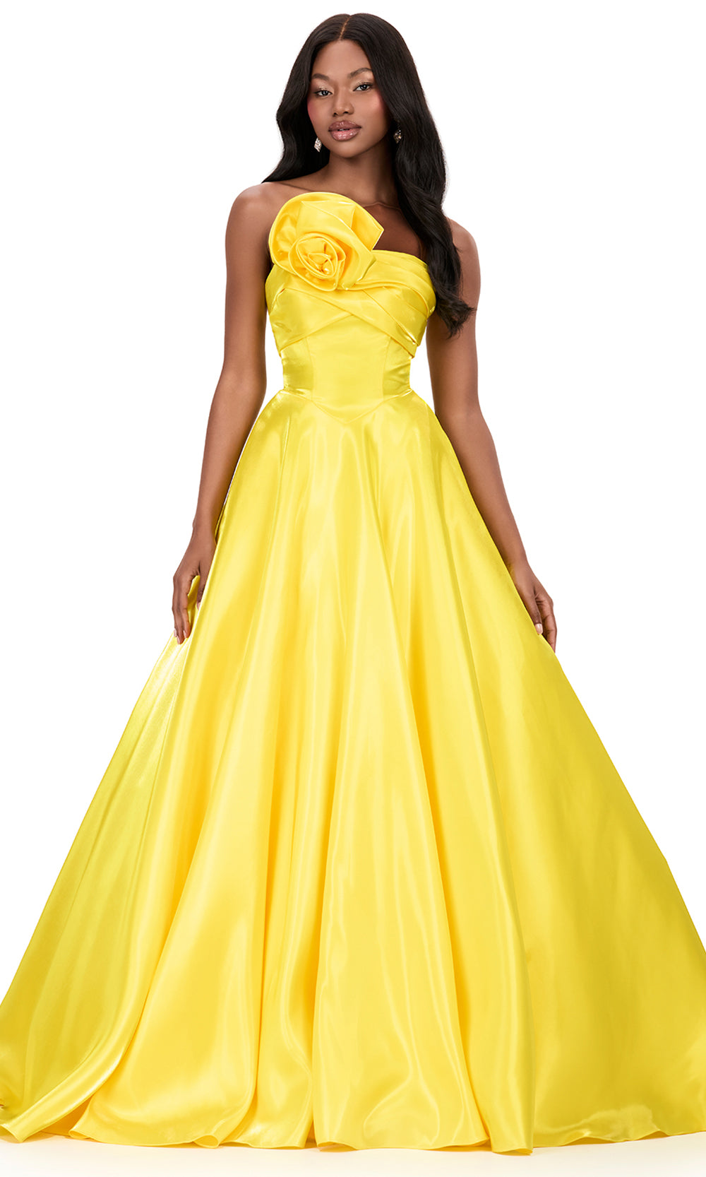 Style and artistry converge in Ashley Lauren 12199, a gown that draws attention with sculptural precision. The strapless neckline leads to a fitted bodice highlighted by a dramatic rosette detail, creating a focal point of bold texture and volume. Flowing from the Basque waist, the A-line skirt moves effortlessly with each step, evoking red-carpet grandeur. With its commanding presence and distinct design, Ashley Lauren 12199 is ideal for events that call for confidence, radiance, and individuality. Models are wearing Peacock, and Yellow colors.