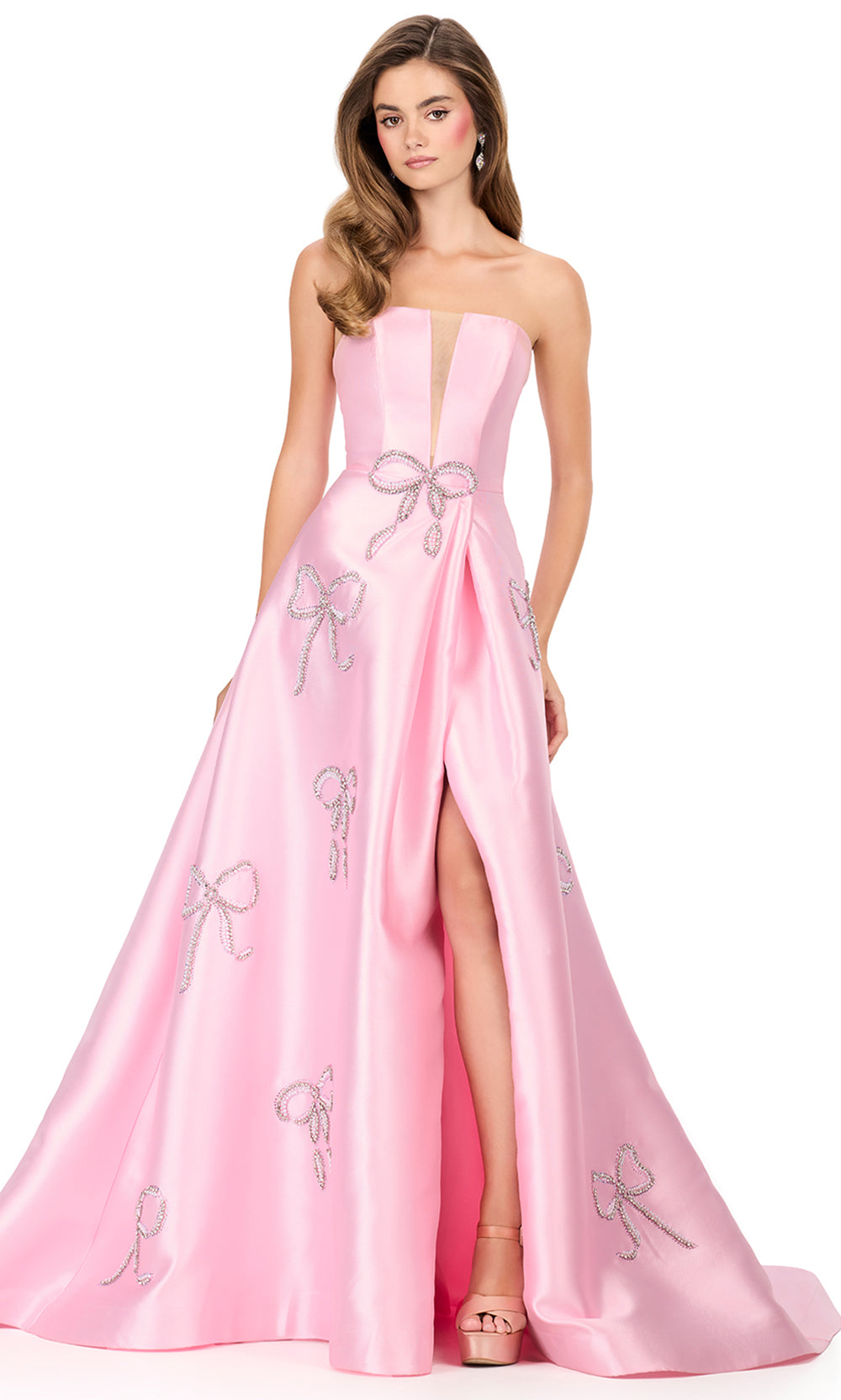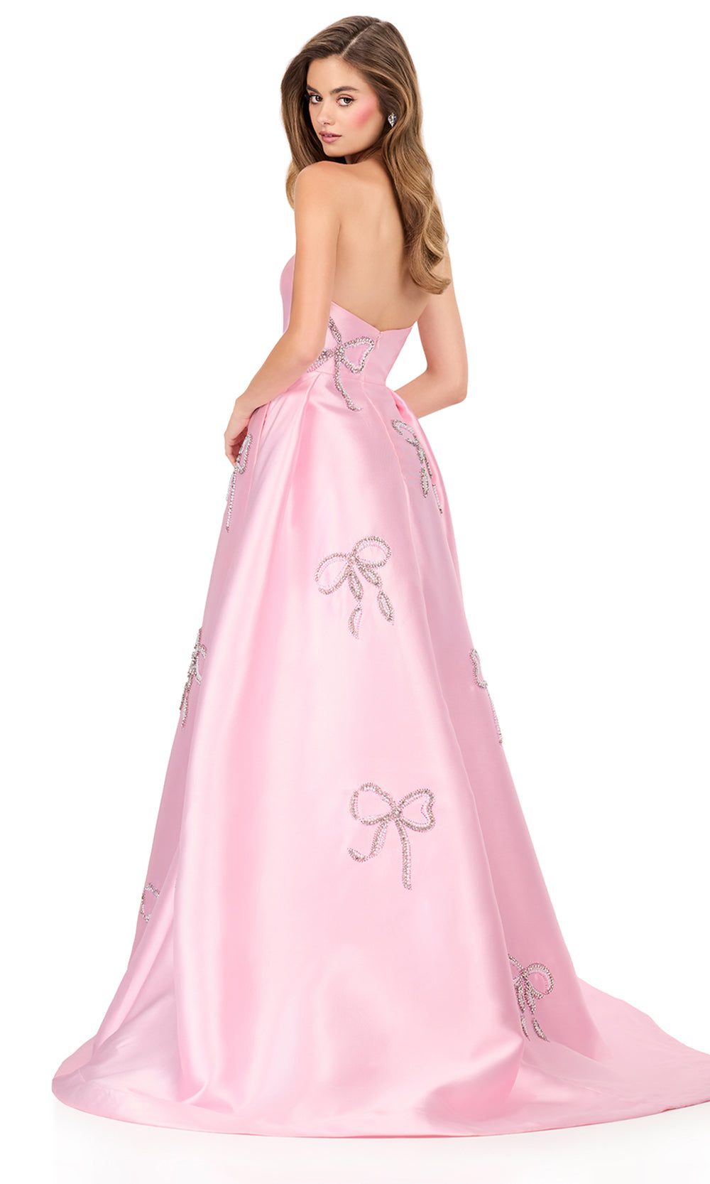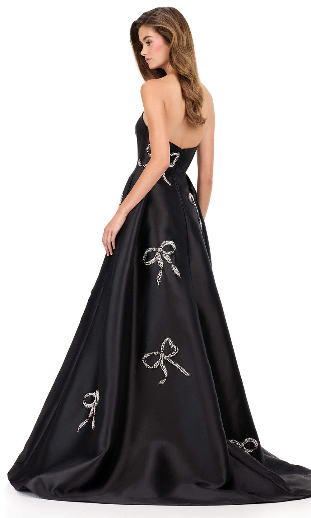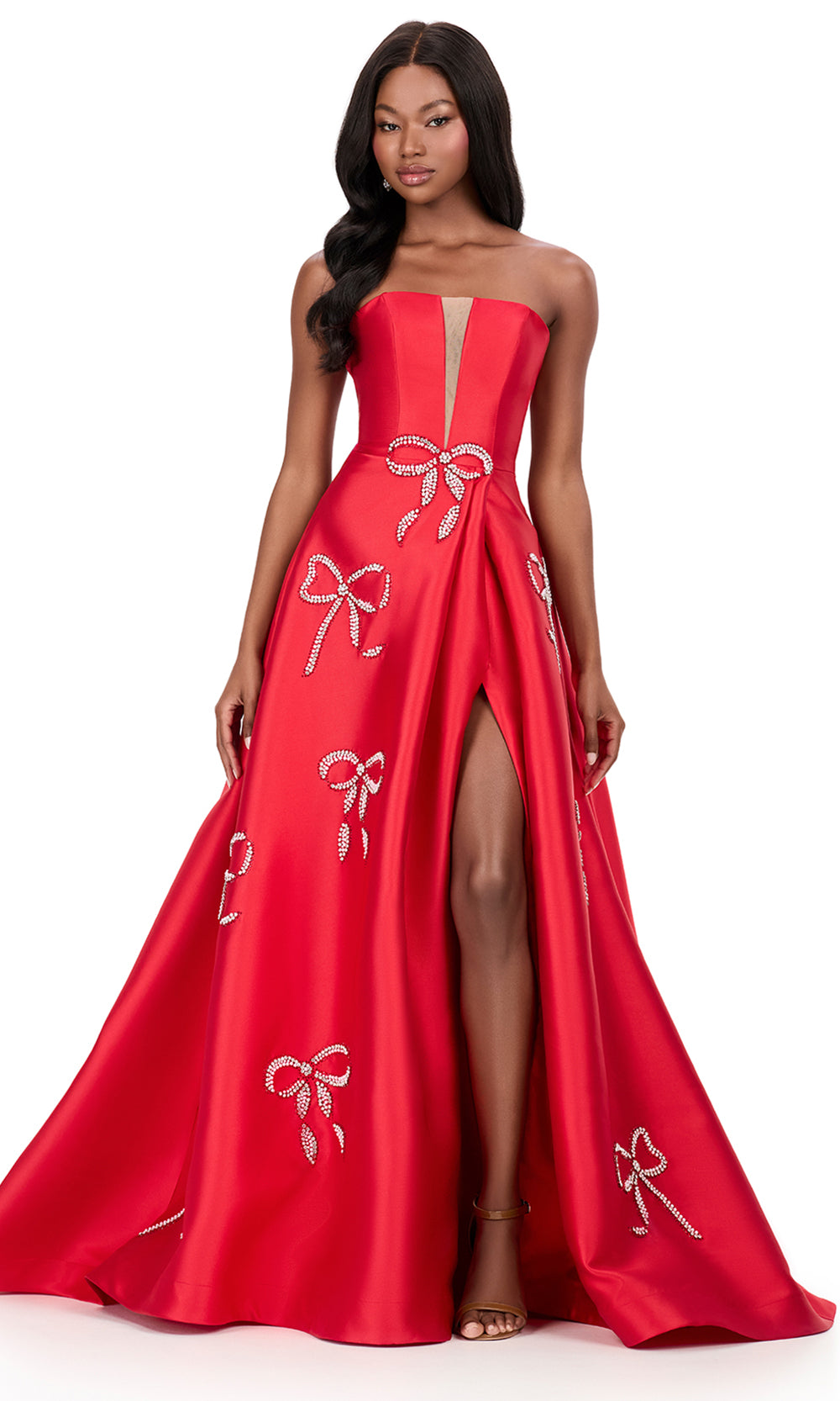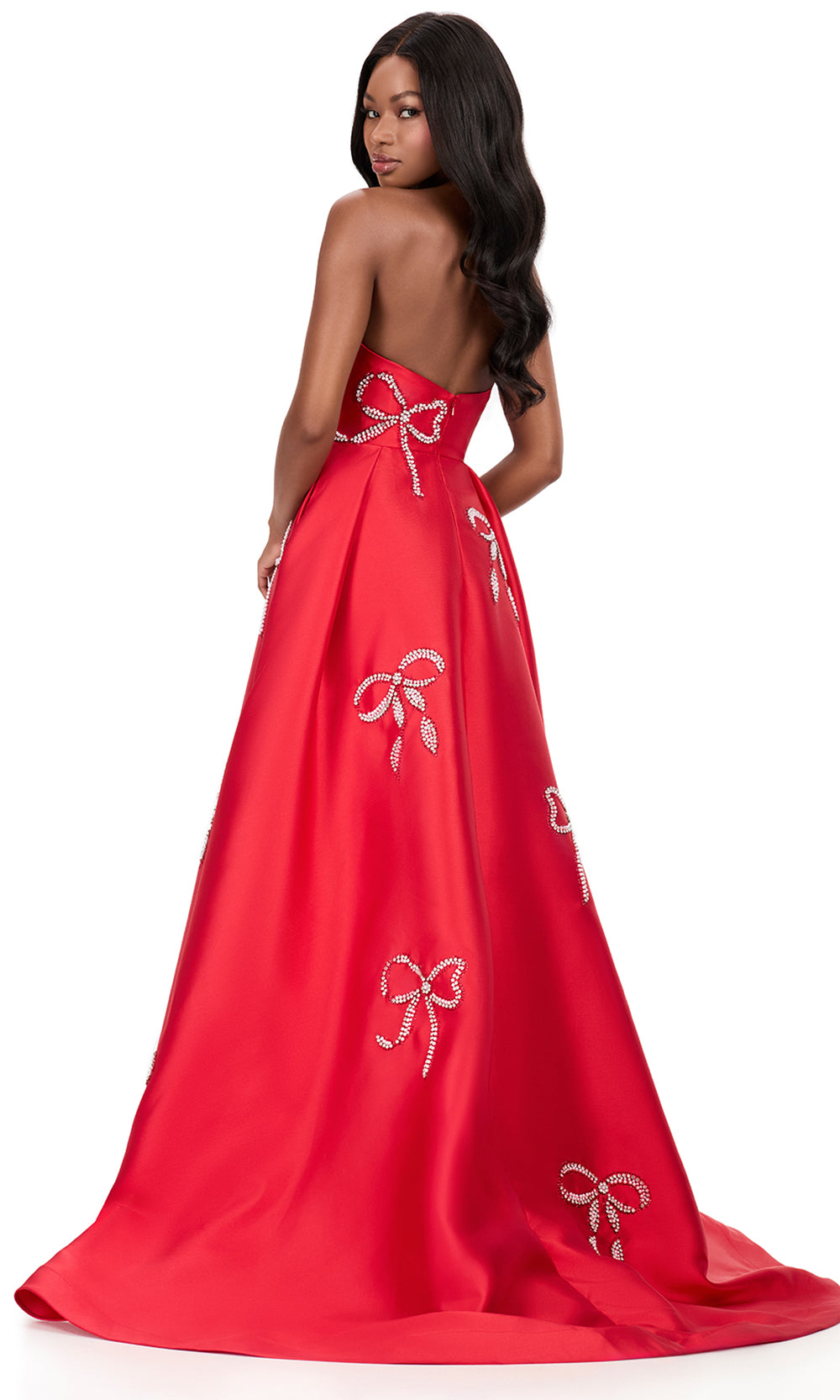 Dazzling embellishments take center stage in the Ashley Lauren 12207 gown, featuring delicate crystal bow appliques that add sparkling charm to every angle. The strapless plunging neckline draws focus to the shoulders, while a fitted bodice defines the waist before releasing into a gently pleated ballgown skirt. A high slit adds movement and allure, complemented by a soft train that trails elegantly. Perfectly balanced between classic structure and modern glamour, Ashley Lauren 12207 makes a radiant statement at formal occasions. Models are wearing Black, Ice Blue, Pink, and Red colors.