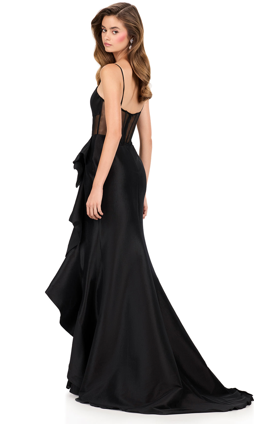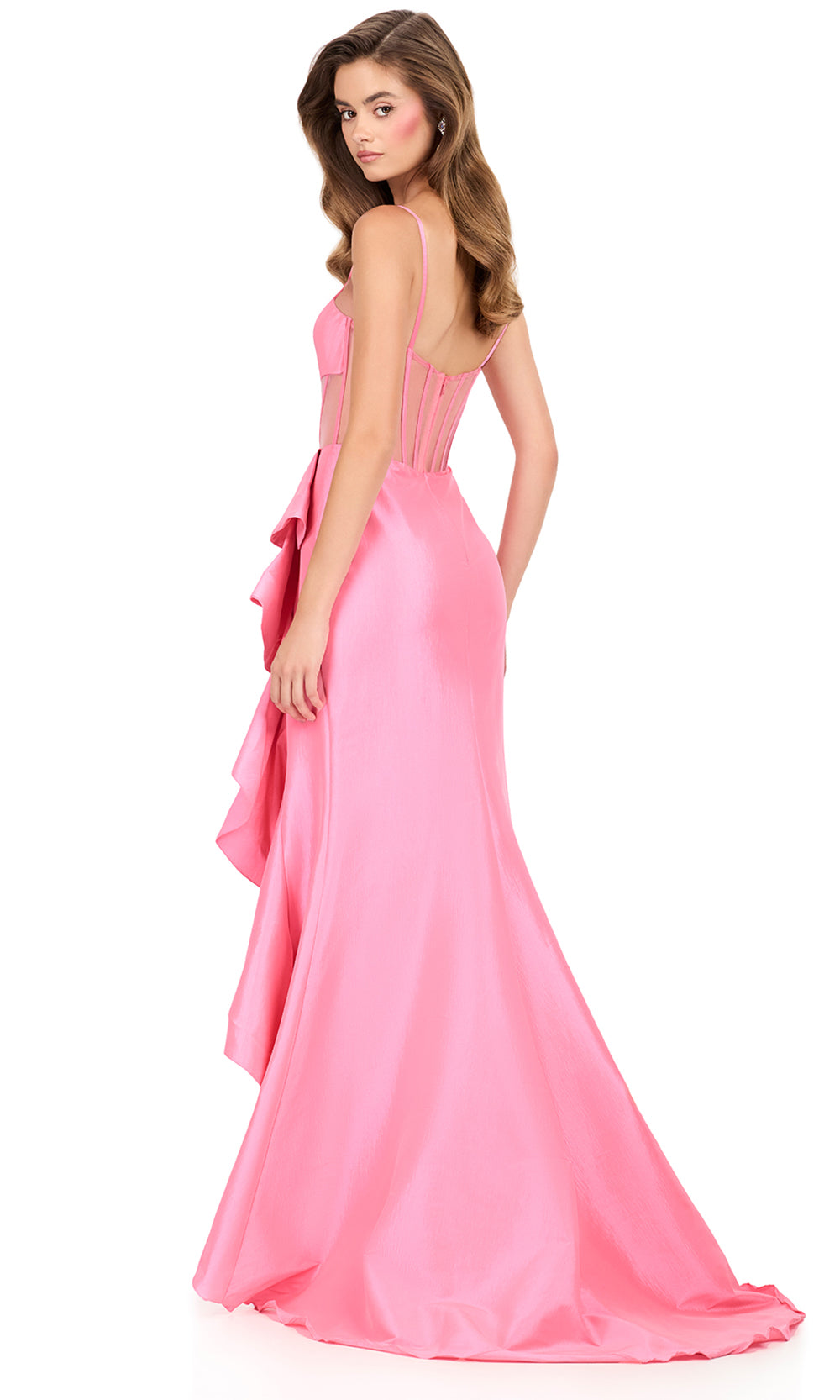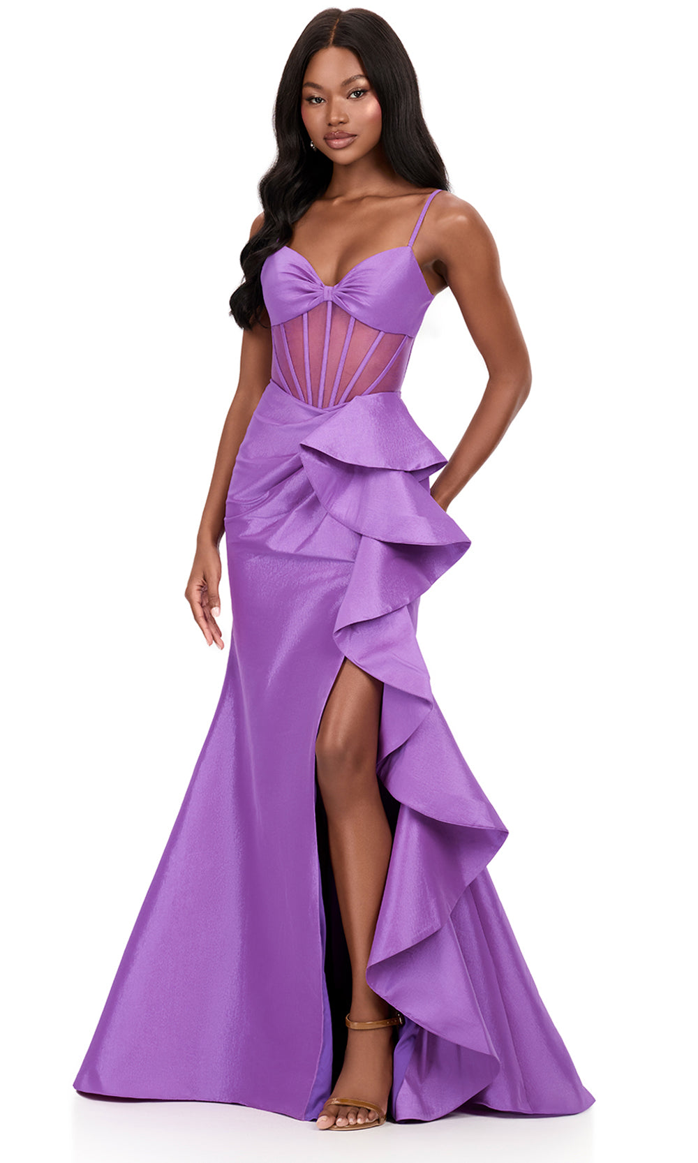 With a blend of architectural detailing and feminine flow, Ashley Lauren 12213 brings modern sophistication to life. The dress features spaghetti straps and a structured corset bodice that defines the waist with precise lines. A dramatic ruffle cascades from the hip along a high slit, adding graceful dimension to the sleek mermaid skirt that extends into a soft train. Ashley Lauren 12213 exudes confidence and couture appeal suited for pageant or black-tie occasions. Models are wearing Black, Candy Pink, Fuchsia, Jade, and Violet colors.