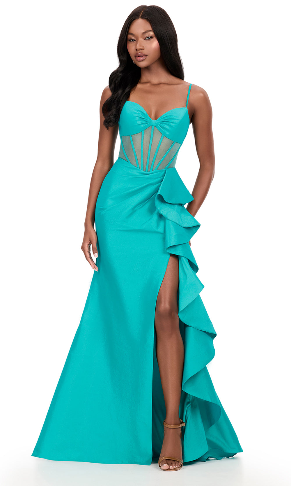 | Details: | Exposed Boning Corset, Spaghetti Straps, Ruffled High Slit Skirt, Sweep Train, Back Zipper Closure |