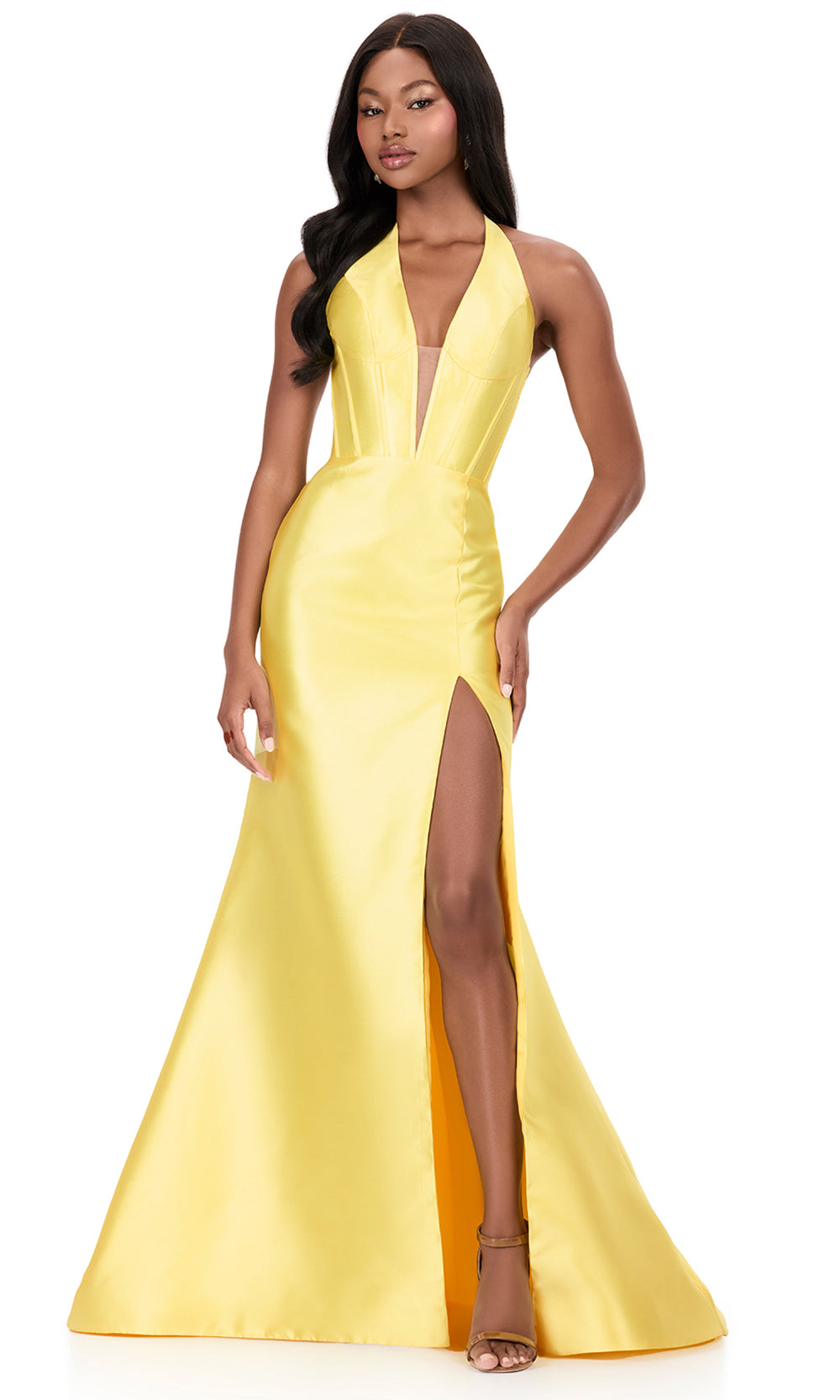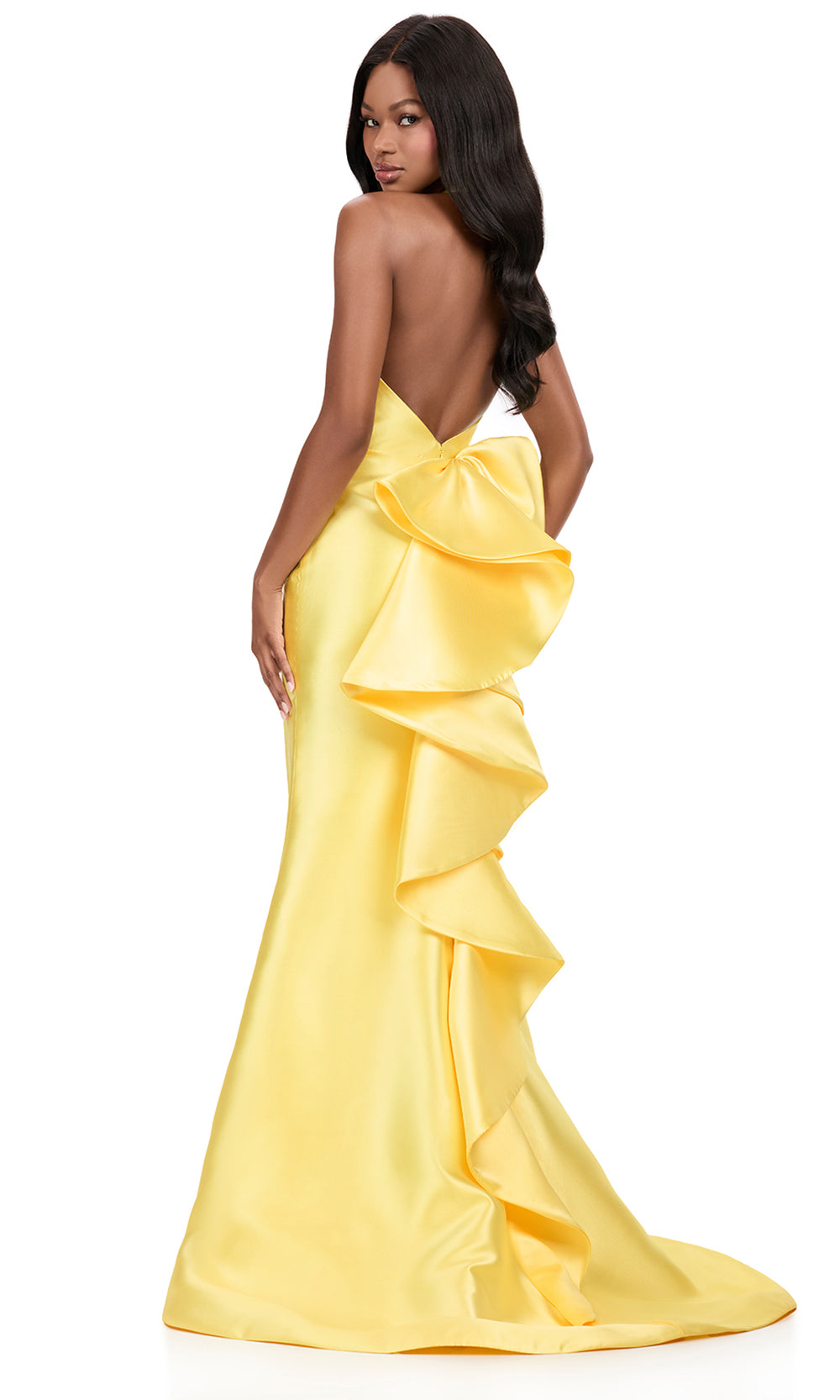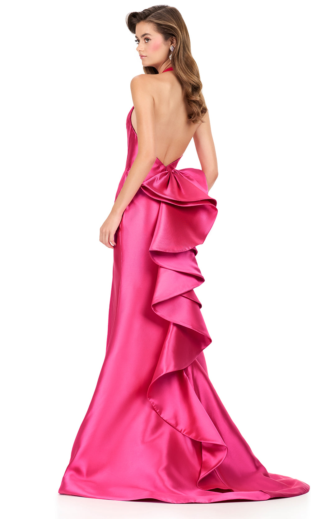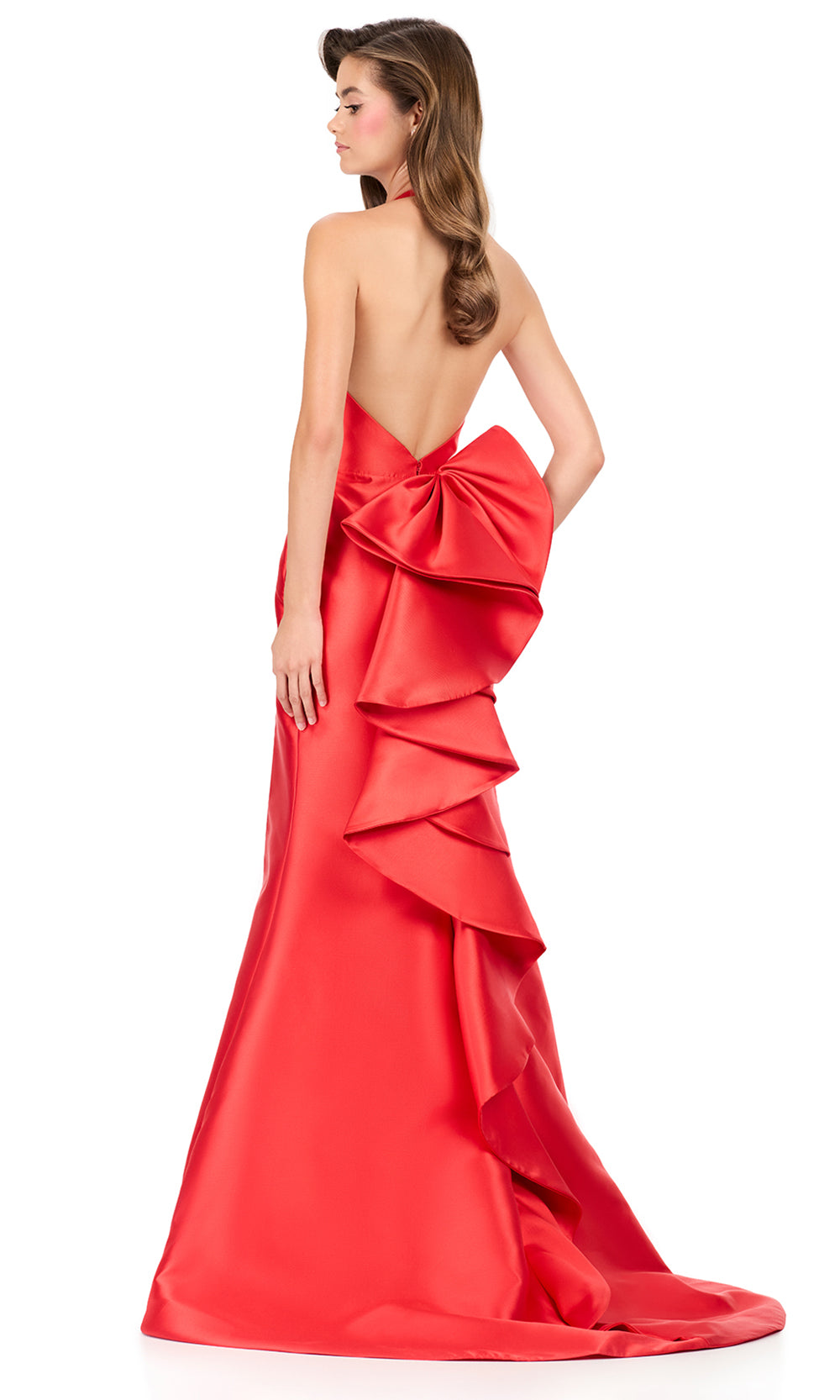 A sleek and modern evening silhouette comes to life with Ashley Lauren 12214, highlighted by a refined plunging halter neckline that frames the shoulders with confidence. The fitted bodice offers a clean and tailored look while maintaining a smooth and uninterrupted profile. A natural waistline enhances balance before flowing into a long mermaid skirt that elongates the figure. The high slit and cascading ruffle bow back introduces subtle drama. Ashley Lauren 12214 is an elegant dress for formal celebrations, evening receptions, and sophisticated special occasions. Models are wearing Aqua, Black, Fuchsia, Ice Pink, Orange, Red, Sky, and Yellow colors.