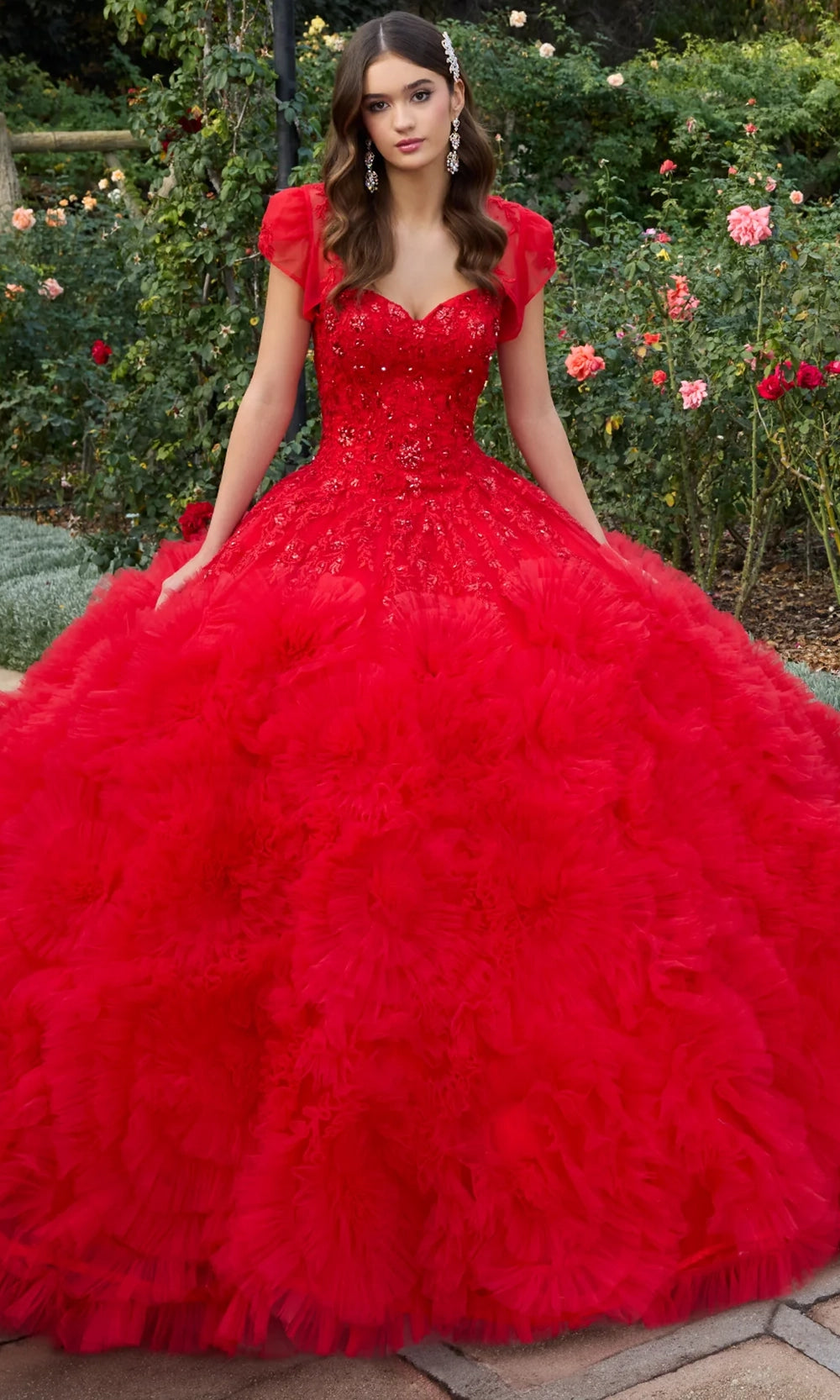 Imagine stepping into a garden of luxury framed by the Ashley Lauren 30104 gown. Featuring a strapless sweetheart neckline and supportive corset back, the gown cinches at the waist to emphasize an hourglass silhouette while maintaining ethereal movement. Beading and embroidered accents bring dimension and artistry to the upper bodice, elevating its appeal. The voluminous ballgown skirt is adorned with 3D floral ruffles that cascade into a sweep train. The included bolero adds versatility and modesty. This Ashley Lauren 30104 ballgown a breathtaking choice for quinceaneras or grand events that demand unforgettable presence. Models are wearing Peacock, and Red colors.
