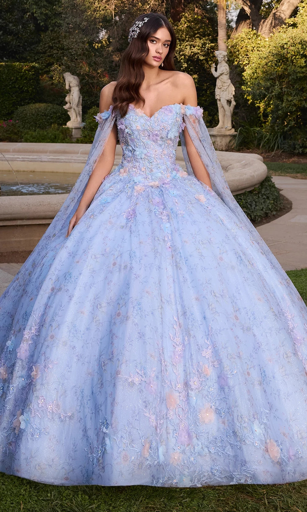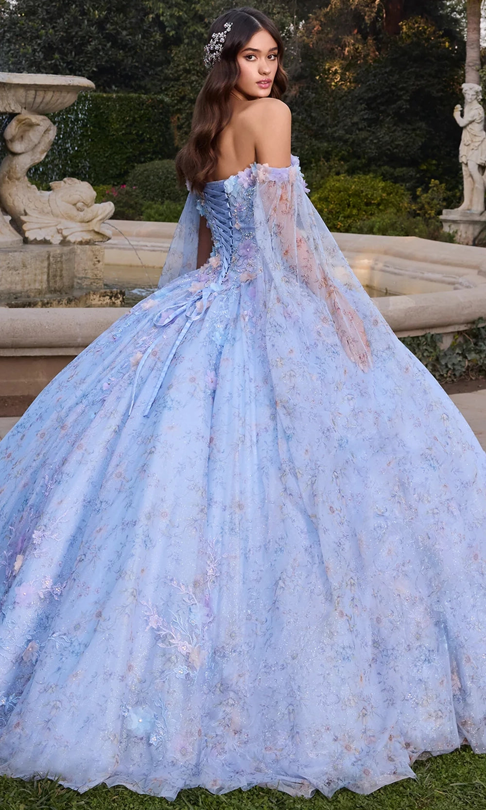 | Details: | 3D Floral Accent, Embroidery, Beaded, Removable Off-Shoulder Cape, Lace-Up Back |