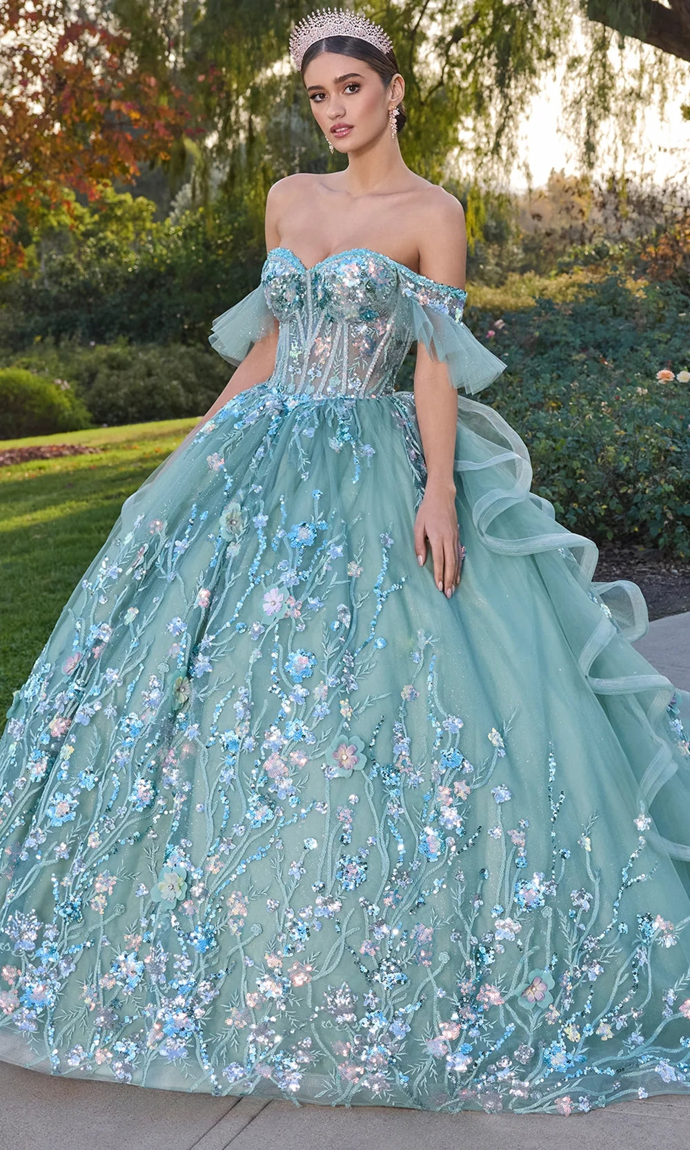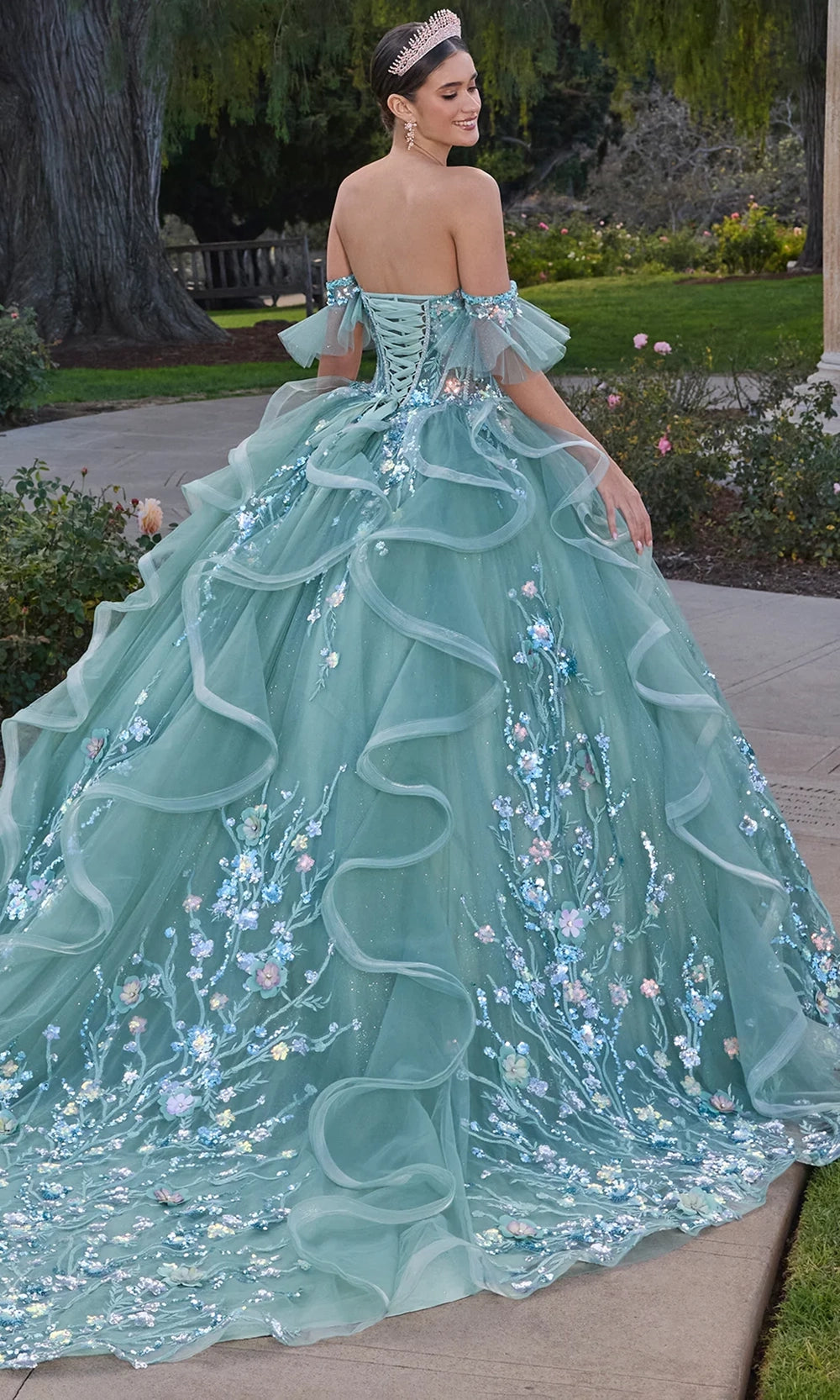 | Details: | Illusion Corset Bodice, Off-Shoulder Flutter Sleeves, Sequin, 3D Floral Appliques, Embroidery, Cascading Ruffles |