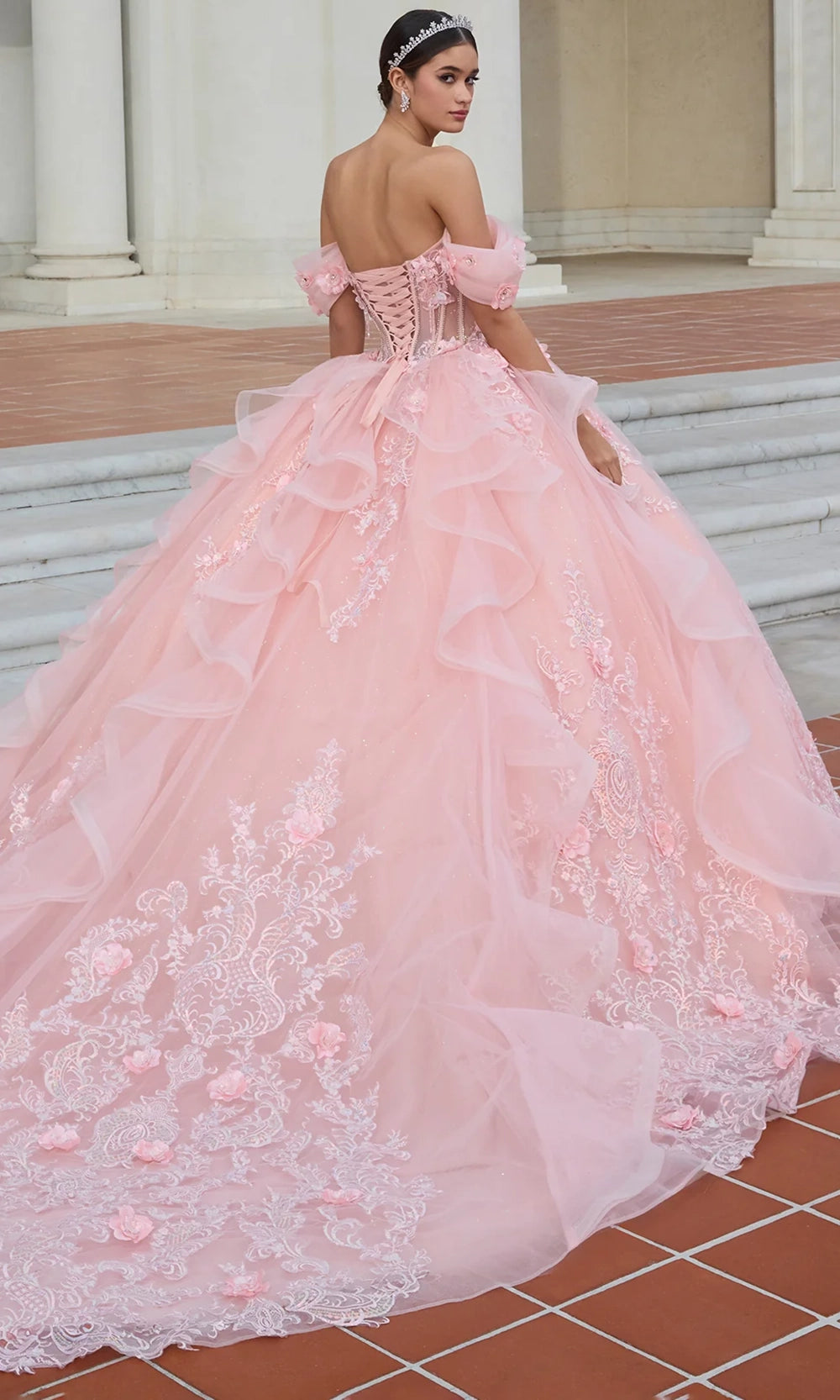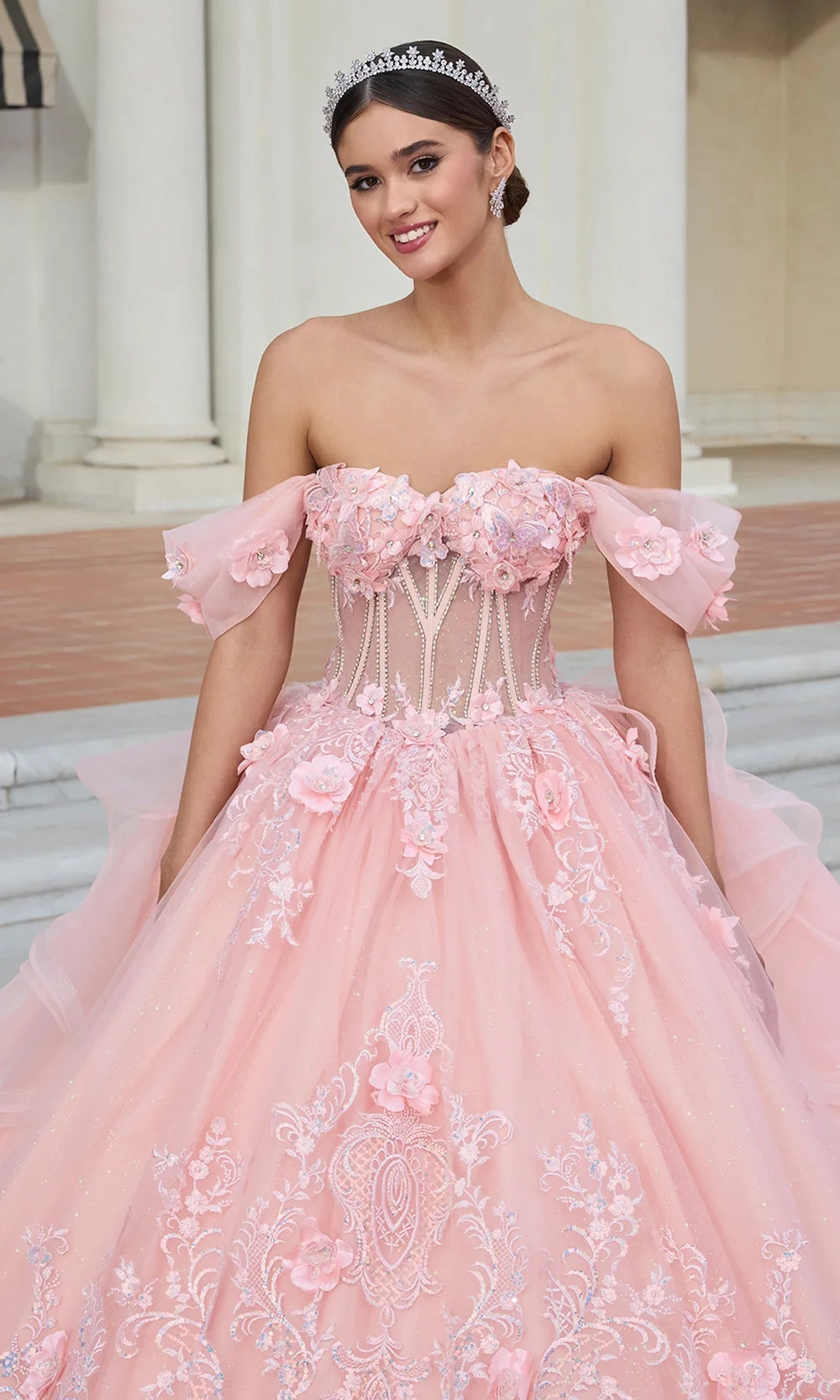 | Details: | 3D Floral Appliques, Sequin, Embroidery, Illusion Boned Bodice, Off Shoulder Sleeves, Back Ruffle Details |