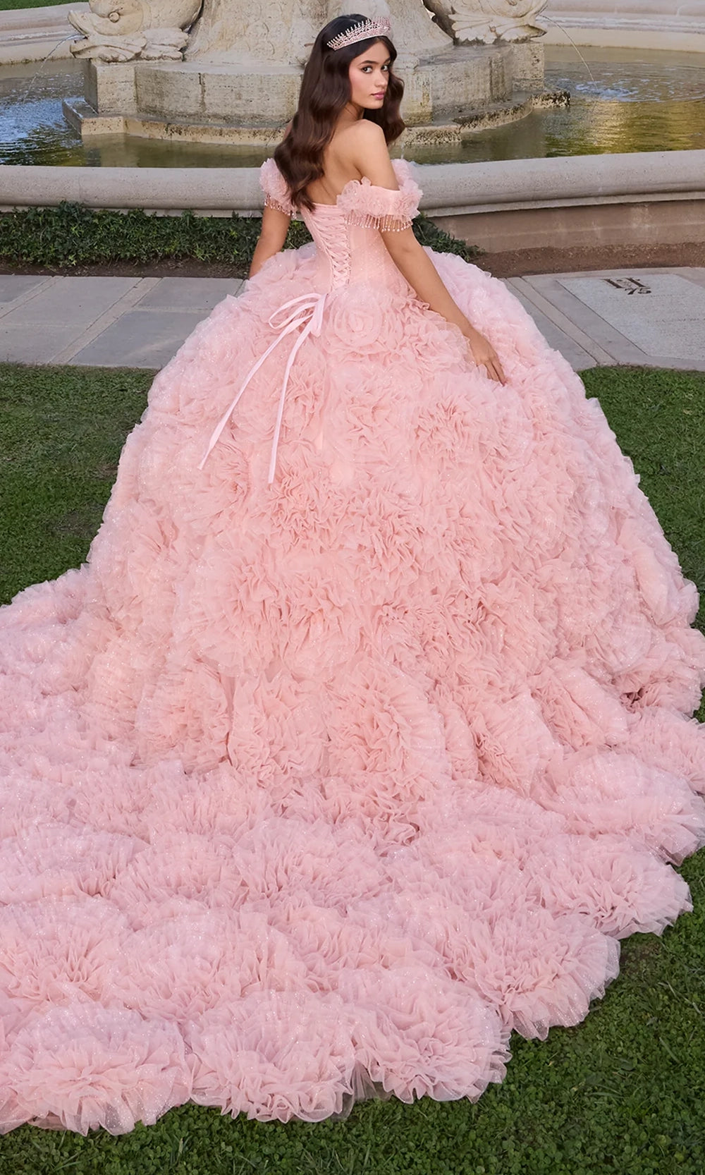 Overflowing with dreamy volume and texture, the Ashley Lauren 30122 gown is the epitome of extravagant elegance. Its sweetheart neckline and off shoulder sleeves are embellished with beaded fringe, setting the stage for a ruched bodice that shapes the upper silhouette with grace. Below, the voluminous ballgown skirt bursts into dramatic ruffled floral layers, creating a mesmerizing finish from waist to hem. Make a lasting impression with the Ashley Lauren 30122, a fairytale ballgown made for the most unforgettable entrances. Model is wearing Blush color.