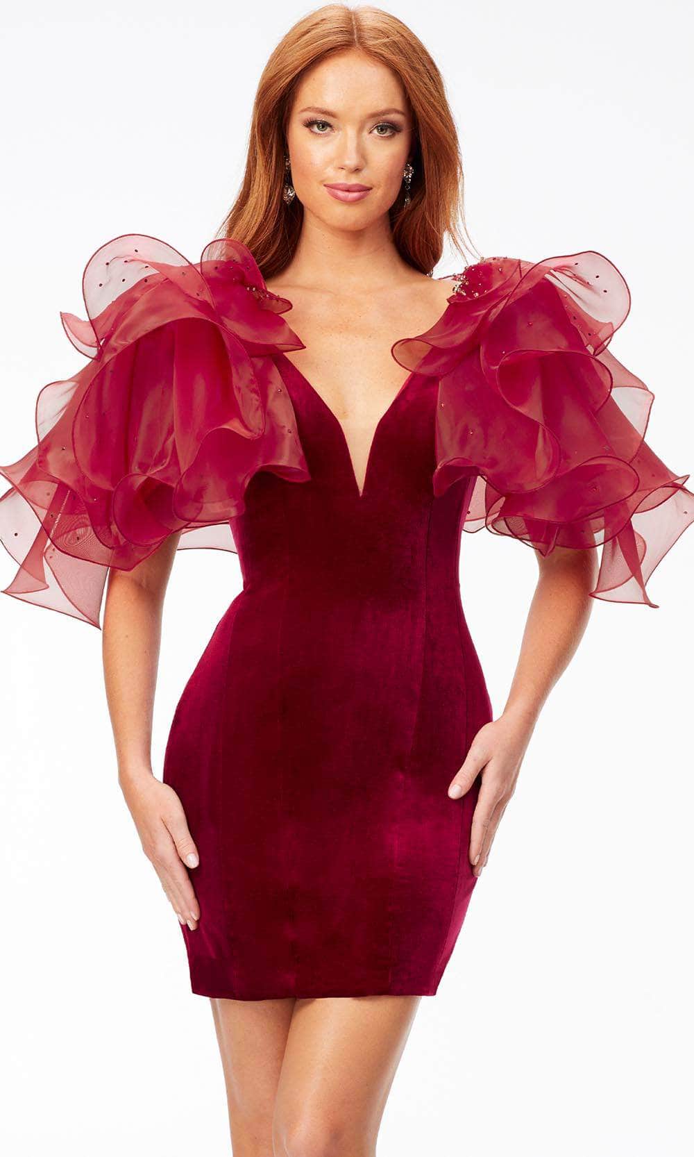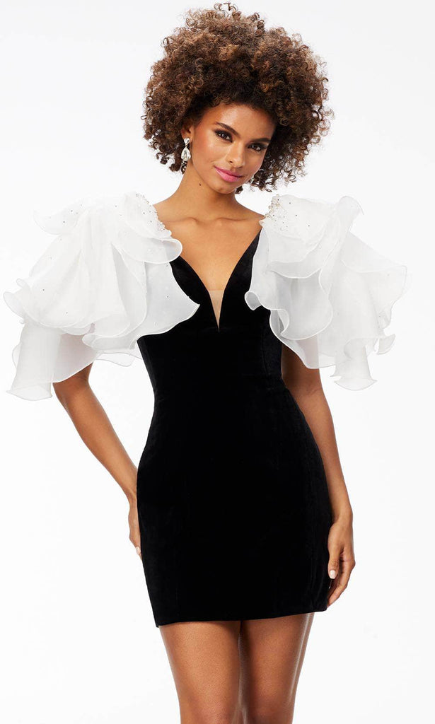 Shine through the night in this mesmerizing Ashley Lauren 4529 formal cocktail dress. This piece features a fitted bodice contoured with lines, a plunging V-neckline with mesh insert, and an exposed back that adds allure. It glams in a lush velvet fabric that gives you that silky texture. The sleeves feature multiple layers of tulle, which adds a stylish volume to your arms and gives you the appearance of being in Hollywood. This masterpiece by Ashley Lauren possesses an obvious elegance while maintaining a stylish silhouette. Models are wearing Black/Ivory, Sky, and Burgundy colors.